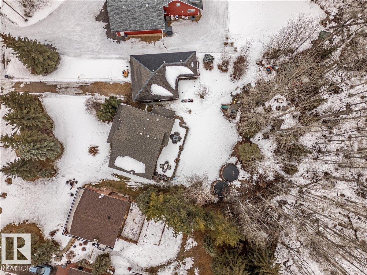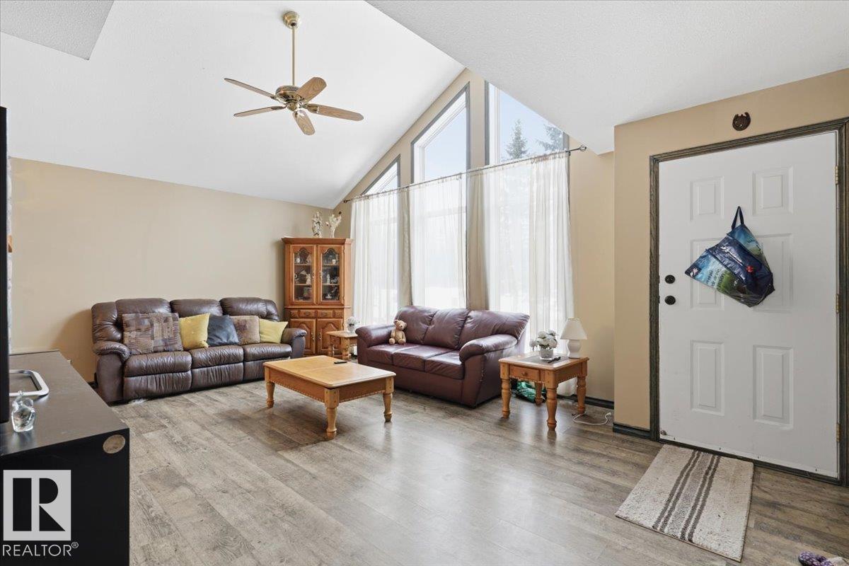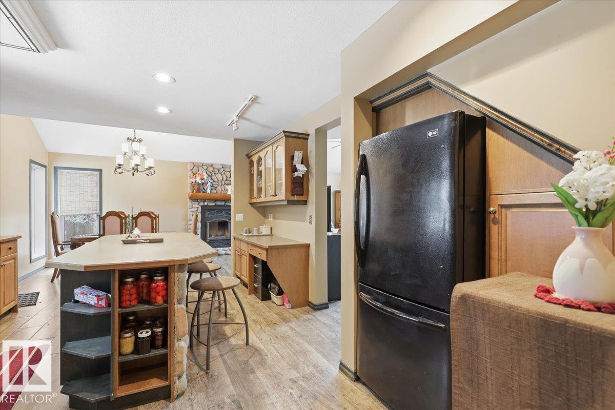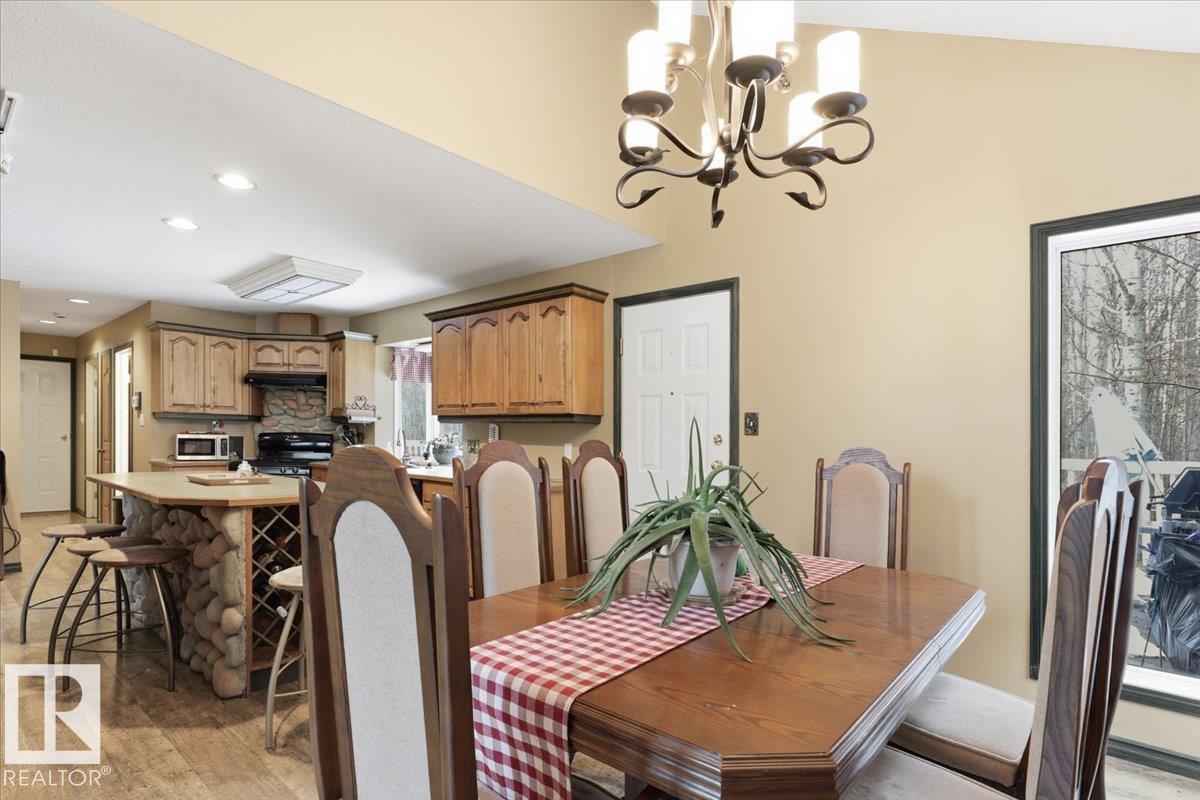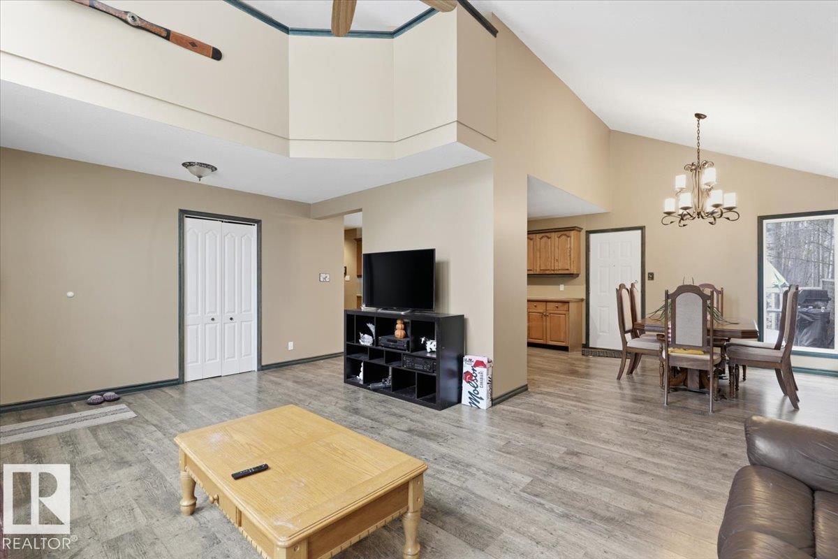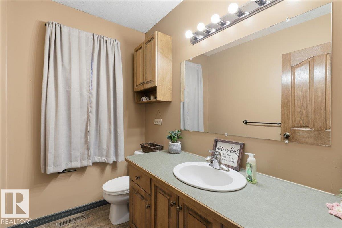 Located within walking distance to the Lake, sits this Country Style 1.5 Storey home with a Triple Detached Garage! Past the front covered deck and inside the home, the spacious living room greets you with large windows, a vaulted ceiling, and a stone fireplace. The kitchen has lots of cabinets, an island, and is open to the dining area. The Primary Bedroom is also situated on the main level with an ensuite bathroom and a make up desk with a sink. Another 2 piece bathroom, and the laundry room conclude the main floor plan. The upper level hosts a loft, office, two more bedrooms, and a 4 piece bathroom. A large deck off the back of the home overlooks the spacious, treed backyard. The large Triple detached garage is heated with a cement floor, power, and has a guest suite off the back. This Property is the perfect blend of country living, and life at the lake! (id:63190)