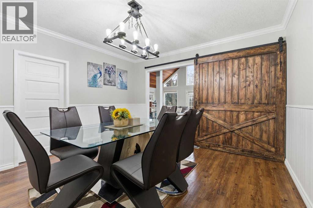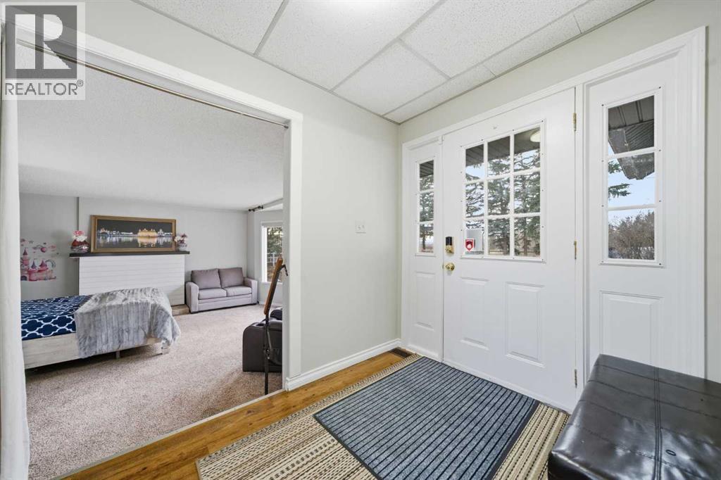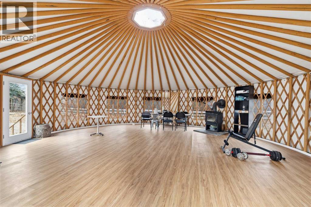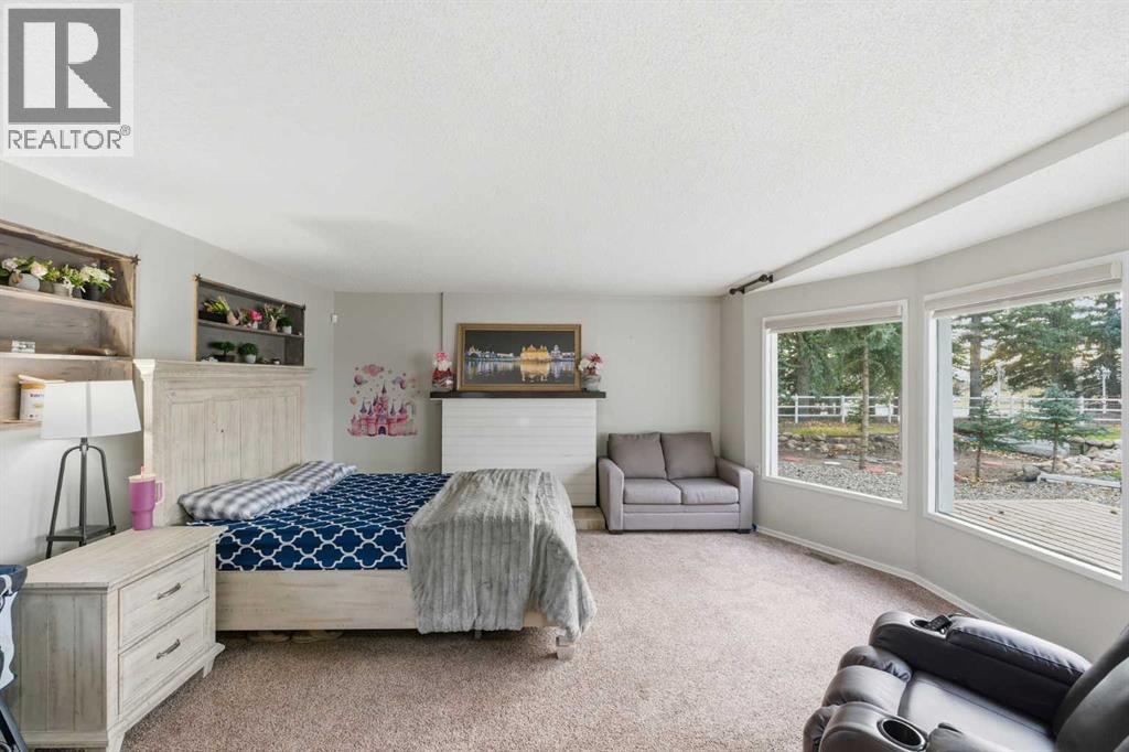 A Private Country Oasis on 5.52 Acres | Steps to Town | 2,231 Sq. Ft. Above Grade | Over 3,000 Sq. Ft. of Total Developed Living SpaceDiscover this exceptional acreage property offering privacy, natural beauty, and timeless country charm — all just minutes from town amenities. Nestled on 5.52 fully treed acres behind a private gated entrance, this uniquely designed residence provides a serene lifestyle while maintaining convenient access to daily necessities and major roadways.The home features thoughtfully selected farmhouse-inspired finishes, including reclaimed elements sourced from historic sites. The well-appointed kitchen includes stainless steel appliances, ample counter space, and extensive cabinetry, providing both functionality and style. The adjoining dining room offers a warm and inviting space for family gatherings and special occasions.A dramatic, light-filled family room showcases vaulted ceilings and expansive windows framing the peaceful natural surroundings. The sunken living room adds an additional cozy retreat, complete with a wood-burning fireplace and bay window — ideal for relaxing on cooler evenings.The upper level hosts a charming primary bedroom with double barn-door closet access, a gas fireplace, and a private balcony overlooking the treed landscape — the perfect spot for morning coffee or quiet reflection. A second bedroom, flex room, and spacious 5-piece bathroom complete this level. The finished lower level offers a large multi-purpose space, an additional bedroom with 2-piece bathroom (macerating toilet), and direct walk-up access to the outdoors.The fully developed lower level offers exceptional additional living space, featuring a bedroom, a 2-piece bathroom (macerating toilet), a large recreation room, storage area, and direct walk-up access to the outdoors, making it ideal for guests, teens, or multi-use living.Outdoor FeaturesThe property offers endless opportunities to explore and enjoy nature with mature trees, walk ing paths, and multiple outdoor activity and relaxation areas. Additional amenities include:• Cottage-style playhouse• Swings and outhouse• Chicken coop and horse shelters• Wood sheds and detached garage• Two firepit areas and water features• Expansive deck space• Pasture and stock waterers — ideal for horse ownersRecent Upgrades• Gas stove• Window blinds• Water filtration system• New hot water tank• New furnaceLocation & Investment AppealConveniently located near Honda Okotoks, this property offers excellent access to shopping, services, and commuter routes. A fantastic opportunity for buyers seeking space, lifestyle, and long-term land value in the Okotoks and surrounding area.This one-of-a-kind property combines character, comfort, and possibility — a rare offering that truly must be experienced. (id:63190)