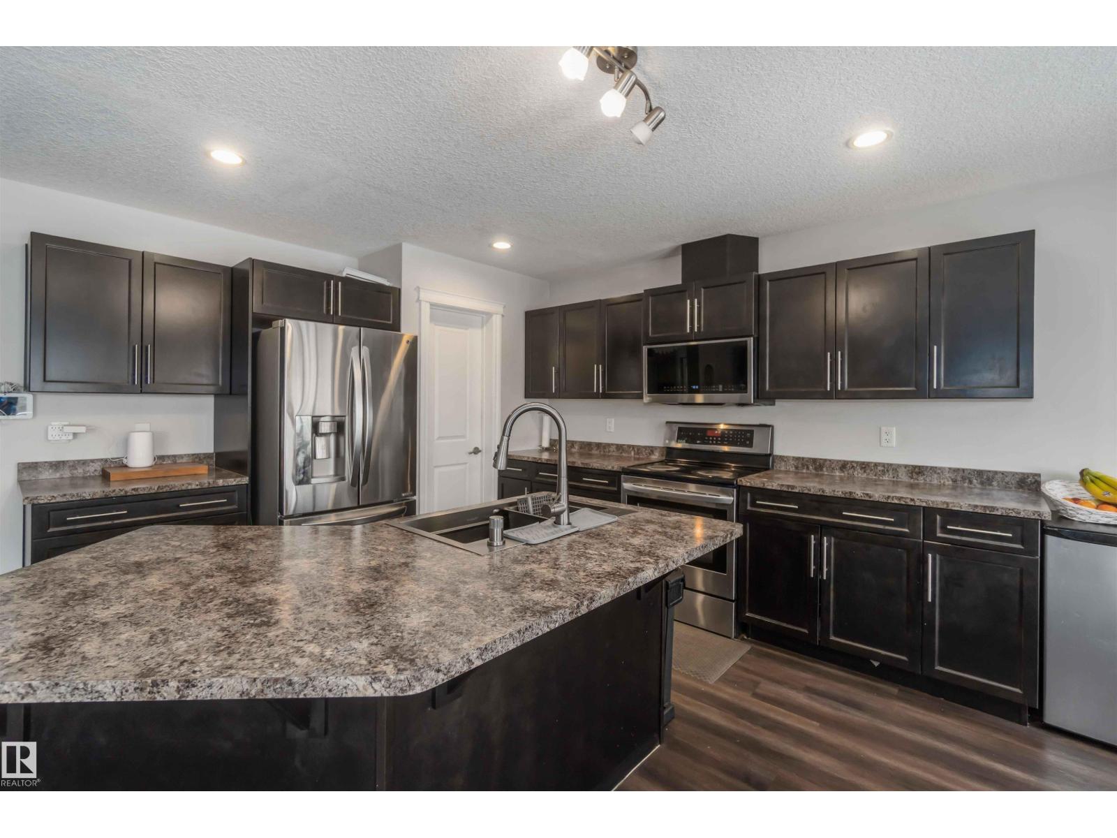 Nestled in a sought-after Castle Downs community, this impressive 2-storey home offers 5 bedrooms, 3.5 bathrooms, and over 2,119 sqft of thoughtfully designed living space. The main level features resilient flooring, soaring 9-foot ceilings, and a bright great room with a cozy corner gas fireplace. The kitchen boasts dark maple cabinetry, stainless steel appliances, and a convenient walk-through pantry. Main floor laundry adds to everyday ease. Upstairs, a bonus room offers flexible living alongside three well-appointed bedrooms. The primary retreat includes a walk-in closet and 5-piece ensuite with double vanity, separate shower, and deep soaker tub. A second bedroom also has its own walk-in closet. The finished basement adds two bedrooms, a 3-piece bathroom, and a dedicated office — perfect for extended family or remote work. Enjoy a well-kept backyard with a deck, plus a double attached front garage. Close to transit, shopping, all amenities, and quick Anthony Henday access. All this home needs is YOU! (id:63190)