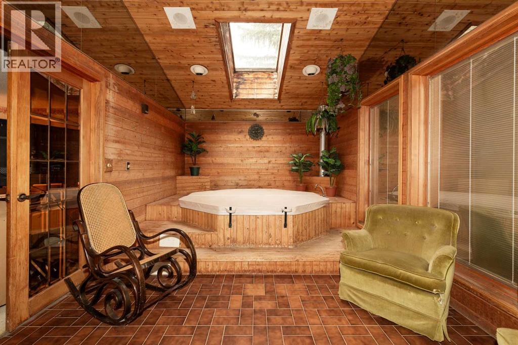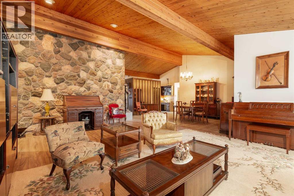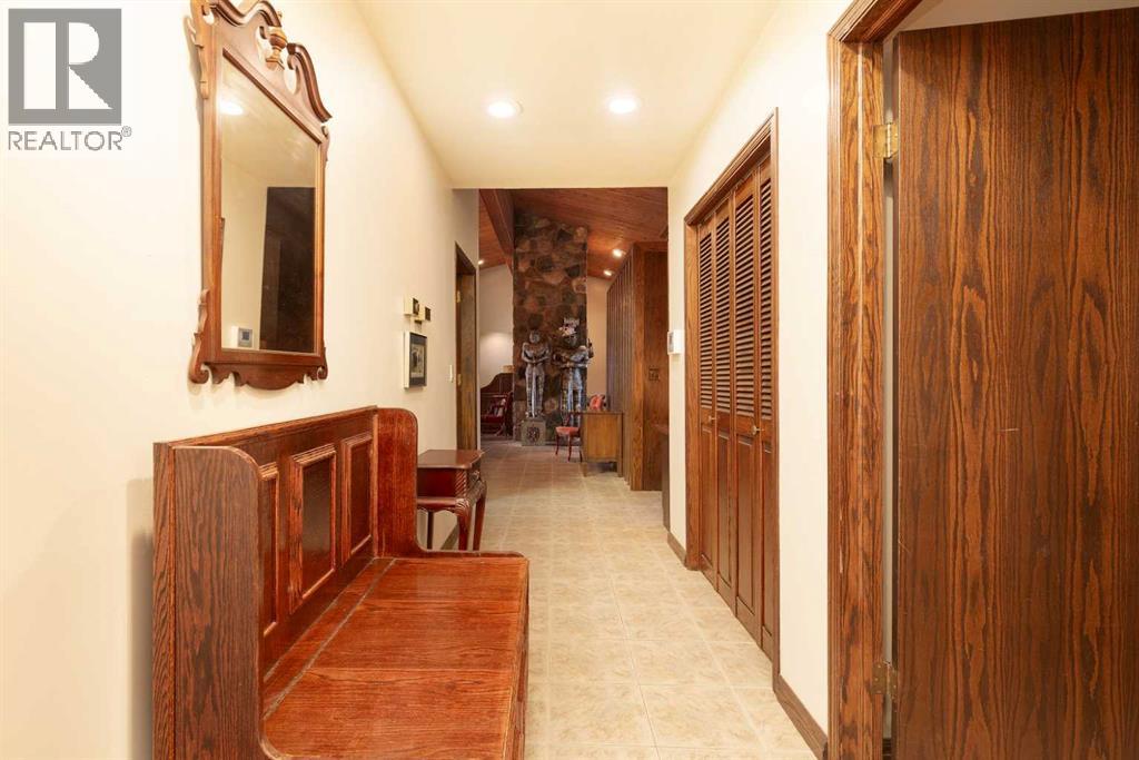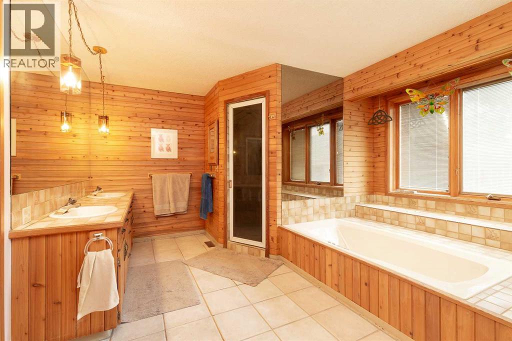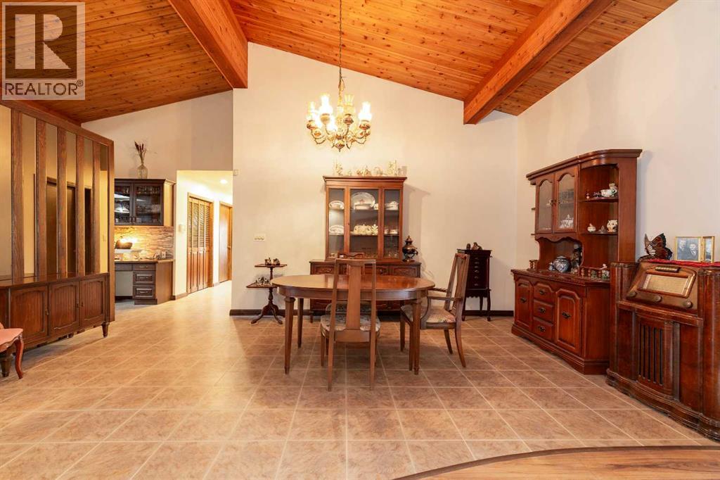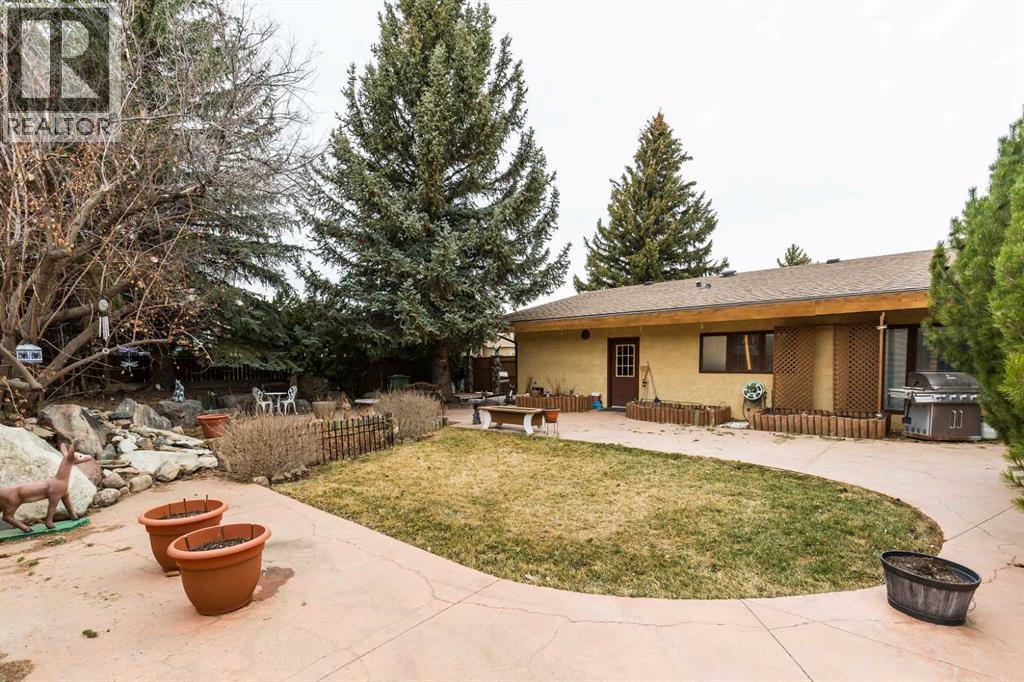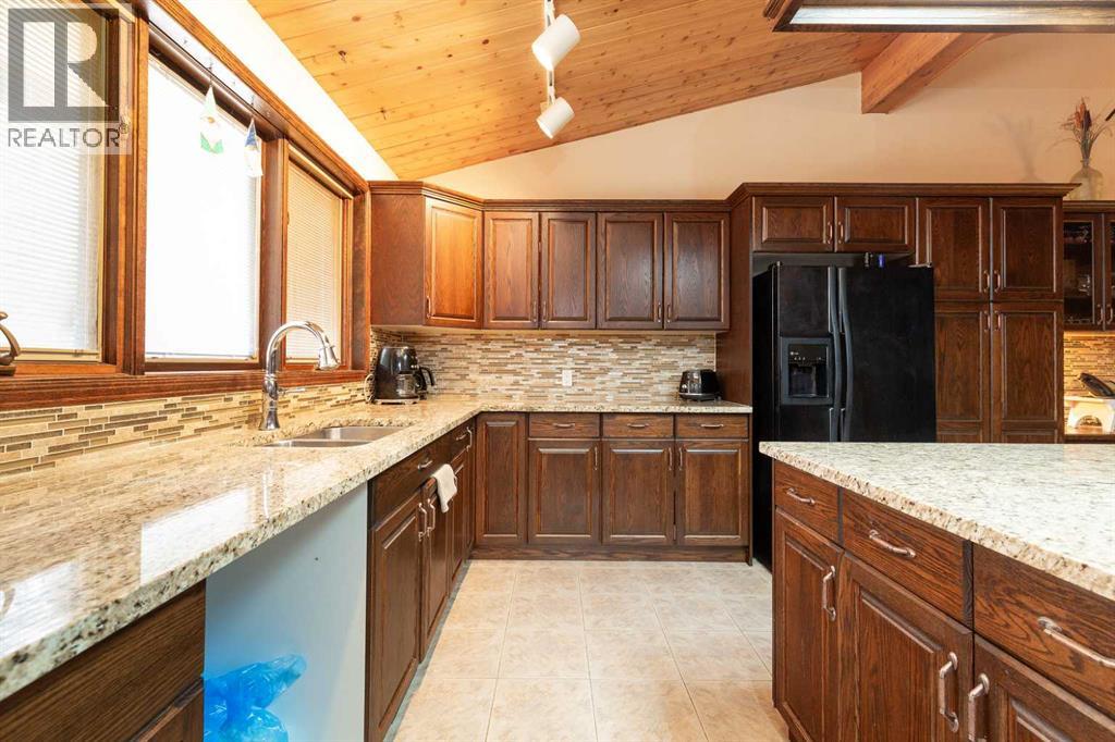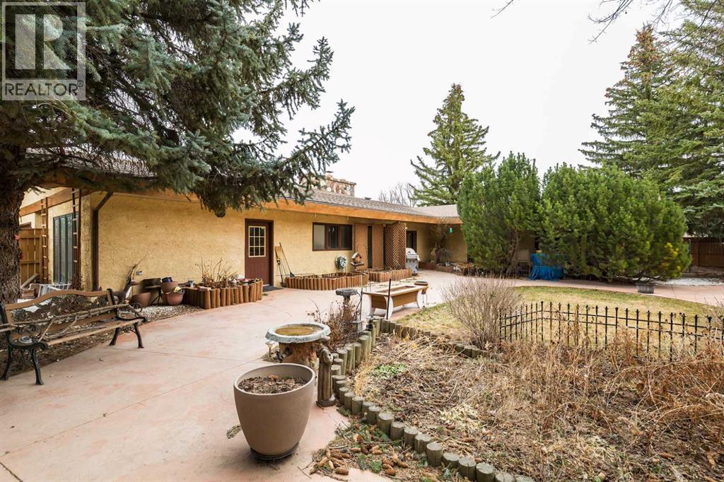 Welcome to 2125 25 St. Tucked away in a quiet cul-de-sac, this impressive 3,420 sq. ft. bungalow offers a rare blend of space, character, and refined design, all set on a beautifully treed 12,775 sq. ft. lot. Showcasing a warm mid-century modern influence, the home features timeless architectural elements, natural materials, and a layout that emphasizes both form and function. The main living area is truly striking, highlighted by soaring beamed cedar vaulted ceilings and a thoughtfully designed layout that balances formal and casual spaces. A floor-to-ceiling custom rock wood-burning fireplace serves as a stunning focal point, gracefully separating the formal living and sitting rooms from the inviting family room, kitchen, and breakfast nook. The expansive kitchen is well-appointed with a large island, built-in oven, and a distinctive brick surround stovetop. The home features 3 bedrooms, a separate office, and 3 full bathrooms, with all 3 bedrooms enjoying direct access to a bathroom, including two bedrooms with private ensuites,. The primary suite is a luxurious retreat, complete with a walk-in closet and a spacious ensuite offering dual vanities, a soaker tub, and a separate shower. Just off the primary bedroom, a private hot tub room with a skylight and sliding glass doors opens to the patio—creating a serene, spa-like escape. Outdoors, the fully fenced and landscaped yard is framed by mature trees, providing both privacy and a tranquil setting. A double attached garage and space for RV parking compliment this exceptional property. A distinctive home offering timeless appeal in a sought-after Coaldale location. (id:63190)
