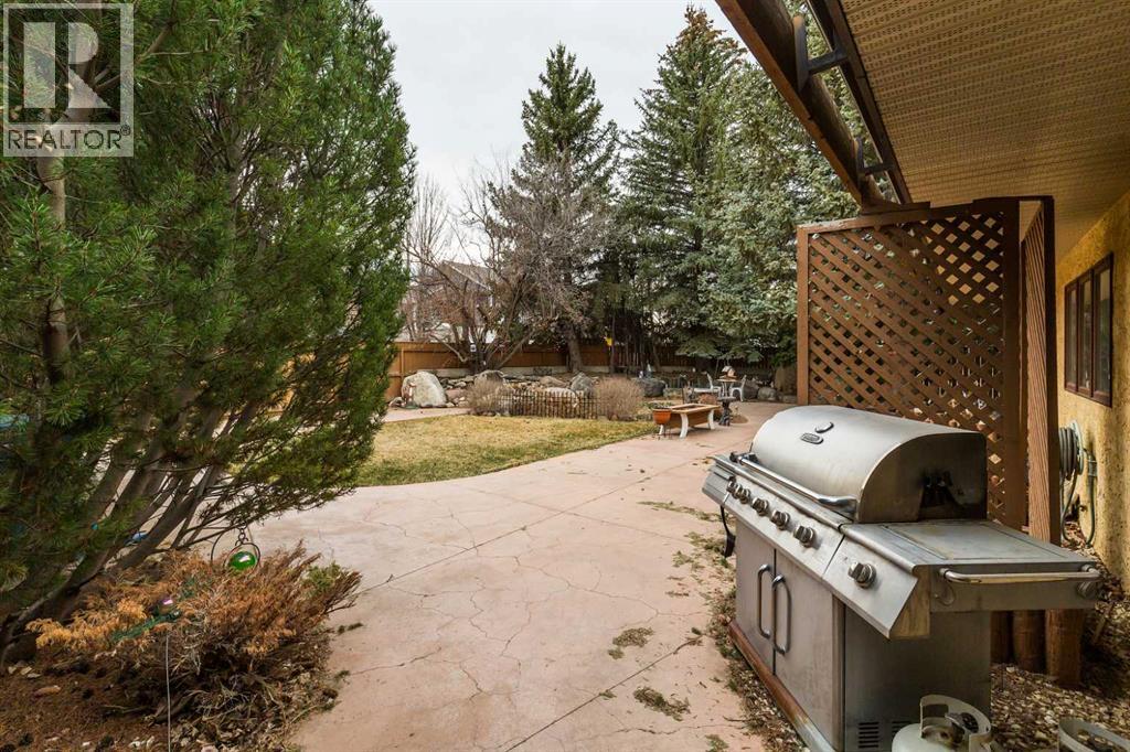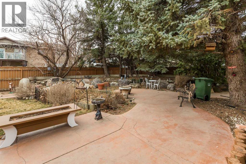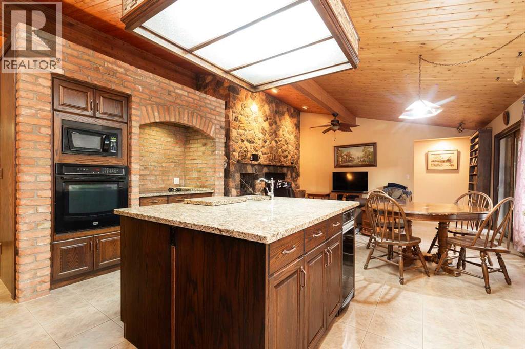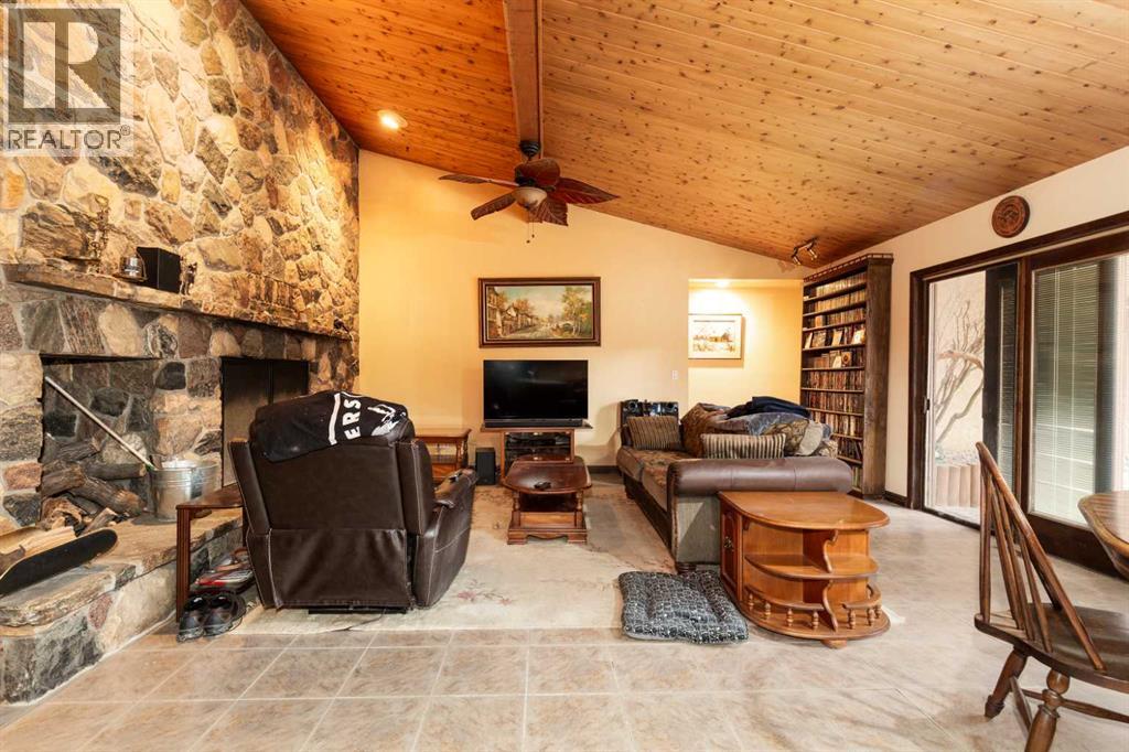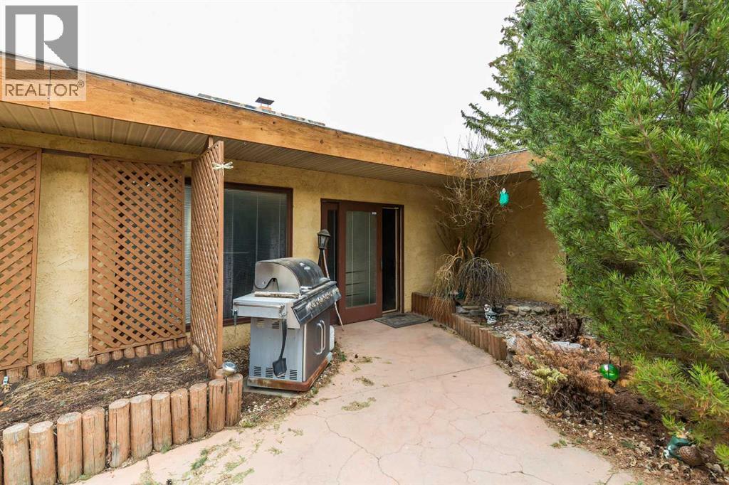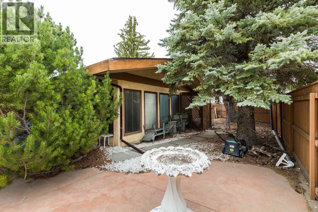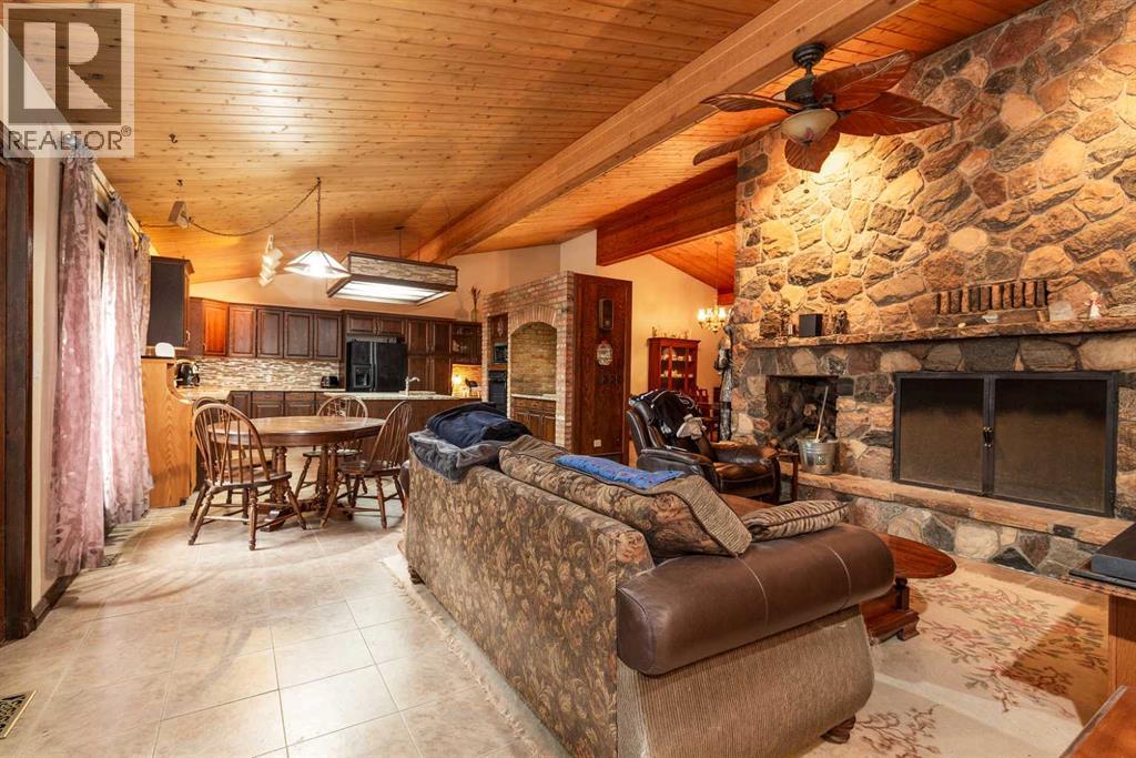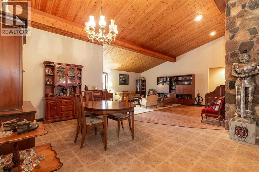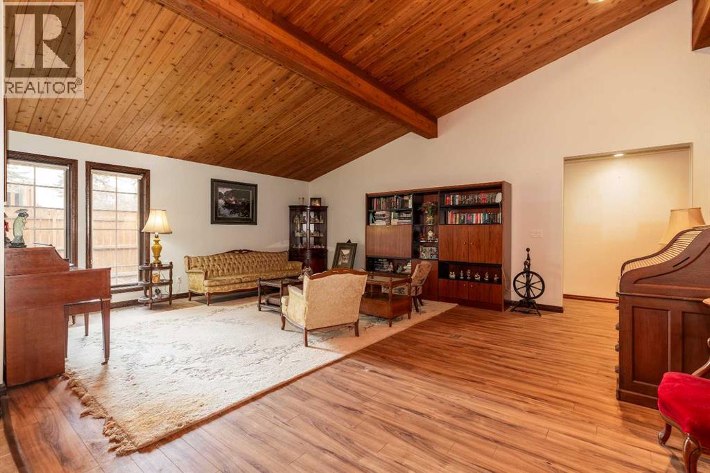 Welcome to 2125 25 St. Tucked away in a quiet cul-de-sac, this impressive 3,420 sq. ft. bungalow offers a rare blend of space, character, and refined design, all set on a beautifully treed 12,775 sq. ft. lot. Showcasing a warm mid-century modern influence, the home features timeless architectural elements, natural materials, and a layout that emphasizes both form and function. The main living area is truly striking, highlighted by soaring beamed cedar vaulted ceilings and a thoughtfully designed layout that balances formal and casual spaces. A floor-to-ceiling custom rock wood-burning fireplace serves as a stunning focal point, gracefully separating the formal living and sitting rooms from the inviting family room, kitchen, and breakfast nook. The expansive kitchen is well-appointed with a large island, built-in oven, and a distinctive brick surround stovetop. The home features 3 bedrooms, a separate office, and 3 full bathrooms, with all 3 bedrooms enjoying direct access to a bathroom, including two bedrooms with private ensuites,. The primary suite is a luxurious retreat, complete with a walk-in closet and a spacious ensuite offering dual vanities, a soaker tub, and a separate shower. Just off the primary bedroom, a private hot tub room with a skylight and sliding glass doors opens to the patio—creating a serene, spa-like escape. Outdoors, the fully fenced and landscaped yard is framed by mature trees, providing both privacy and a tranquil setting. A double attached garage and space for RV parking compliment this exceptional property. A distinctive home offering timeless appeal in a sought-after Coaldale location. (id:63190)