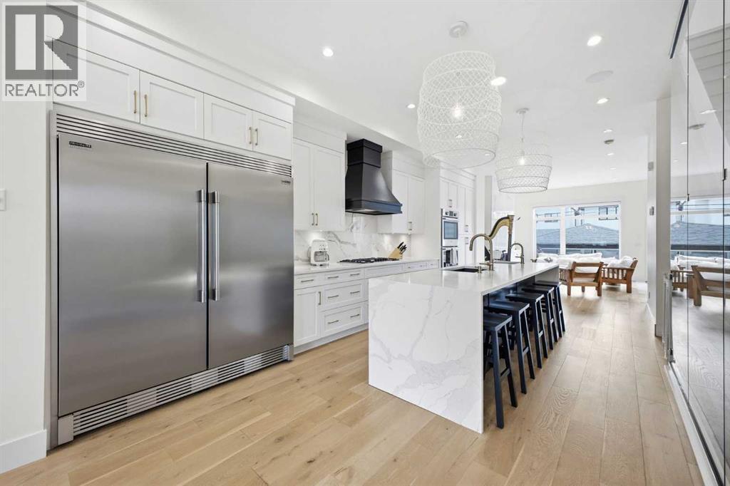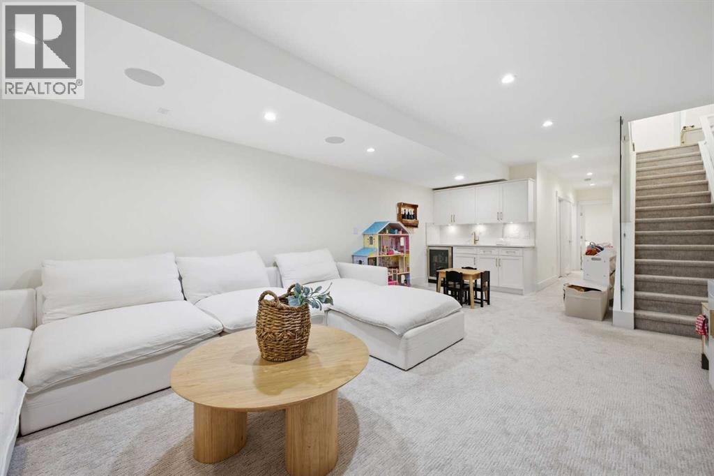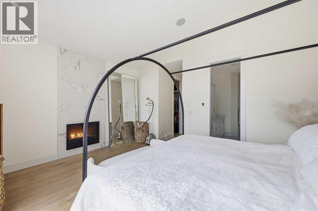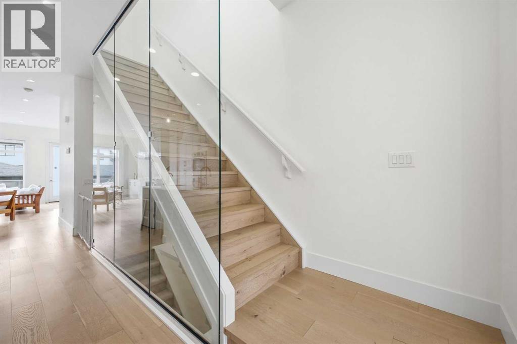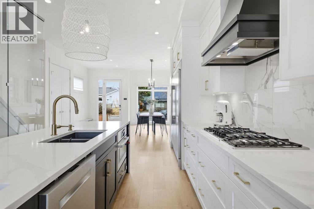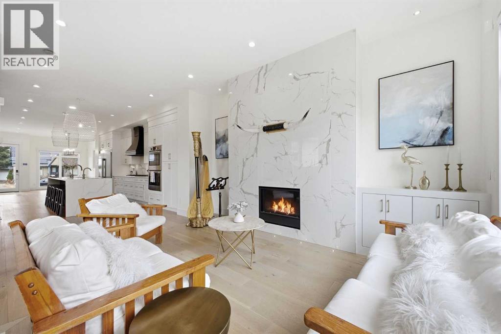 Perfectly positioned in the established community of Shaganappi, this beautifully designed 3+1 bedroom home offers over 2,900 sq ft of modern, elegant living space. The open main level features luxury engineered hardwood flooring, lofty ceilings, and stylish lighting throughout. A spacious front dining room provides ample room to host family and friends and flows seamlessly into the chef’s kitchen, thoughtfully appointed with quartz countertops, a large island with both double and single sinks for effortless prep, custom designed rangehood, abundant storage, and stainless steel appliances. The inviting living room is anchored by a striking floor to ceiling fireplace, creating a warm focal point for everyday living. A 2 piece powder room completes the main level. A glass walled staircase leads to the second floor, where you’ll find three generous bedrooms, engineered hardwood throughout hallways and second floor, a 4 piece main bath, and convenient laundry facilities with a sink and storage. The luxurious primary retreat features a cozy fireplace, walk in closet, and a spa inspired 5 piece ensuite with in floor heat, dual sinks, a relaxing jetted tub, and a rejuvenating steam shower. The front bedroom enjoys access to a private balcony—an ideal spot for morning coffee. The fully developed basement extends the living space with a large recreation/media room complete with a wet bar, perfect for movie nights or game day. A fourth bedroom and 4 piece bath offer comfortable accommodations for guests. Additional highlights include central air conditioning, Delta and Aqua fixtures throughout, upgraded flooring, new HWT (2022), upgraded cabinet pulls/handles, Smart home capability, and built in speakers on the main level, basement, and in the primary suite. Outside, enjoy a spacious back deck—also equipped with built in speakers—and access to the double detached garage. This exceptional home is located directly across from Shaganappi Point Golf Course and is close to Edworth y Park, schools, shopping, public transit, and offers quick access to Bow Trail and 37th Street. (id:63190)
