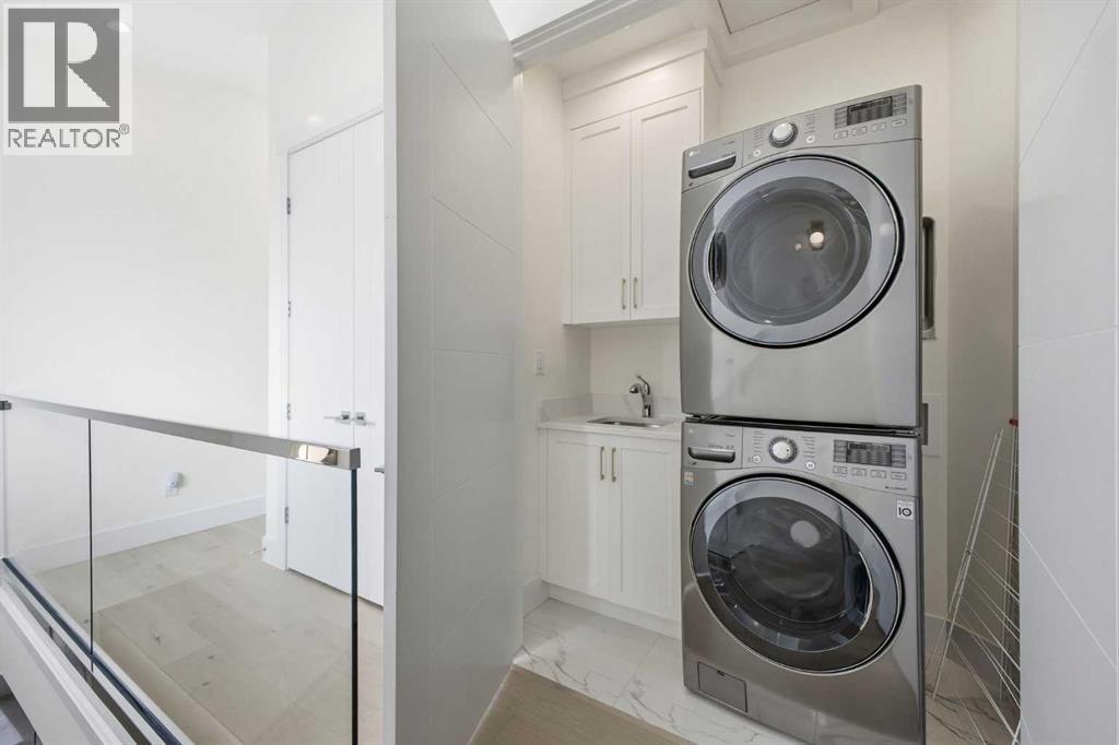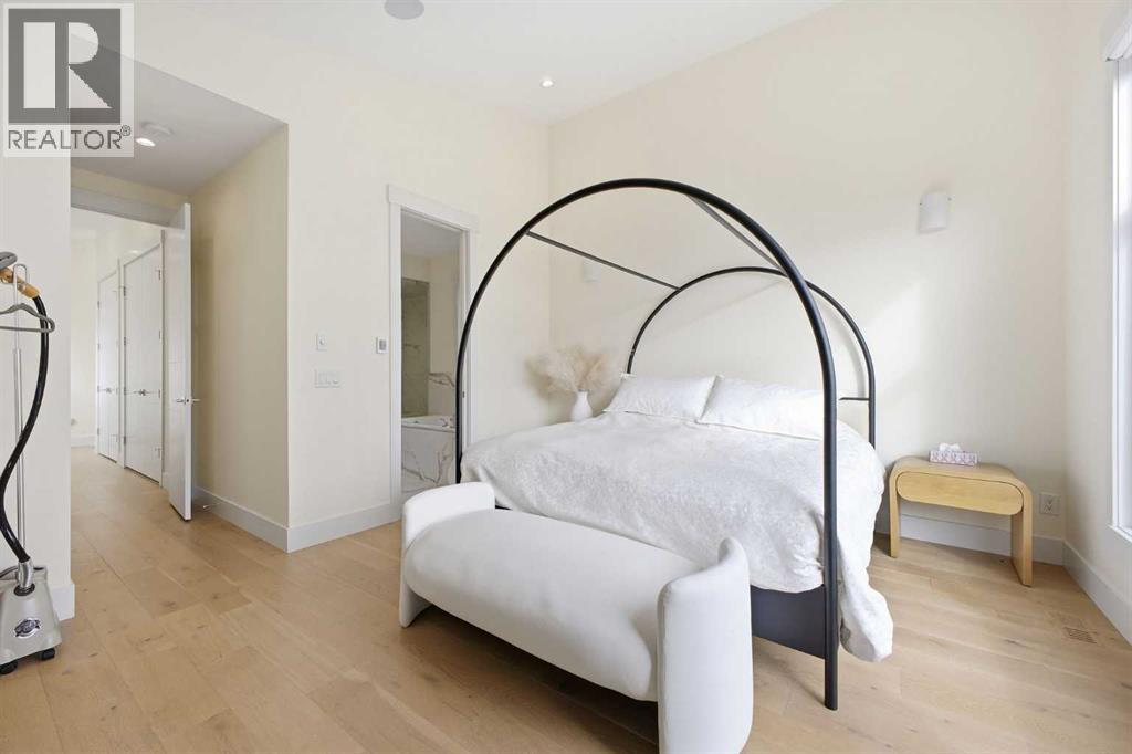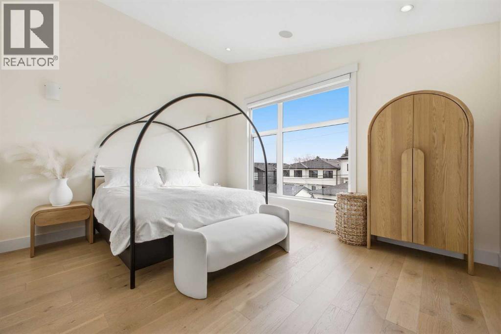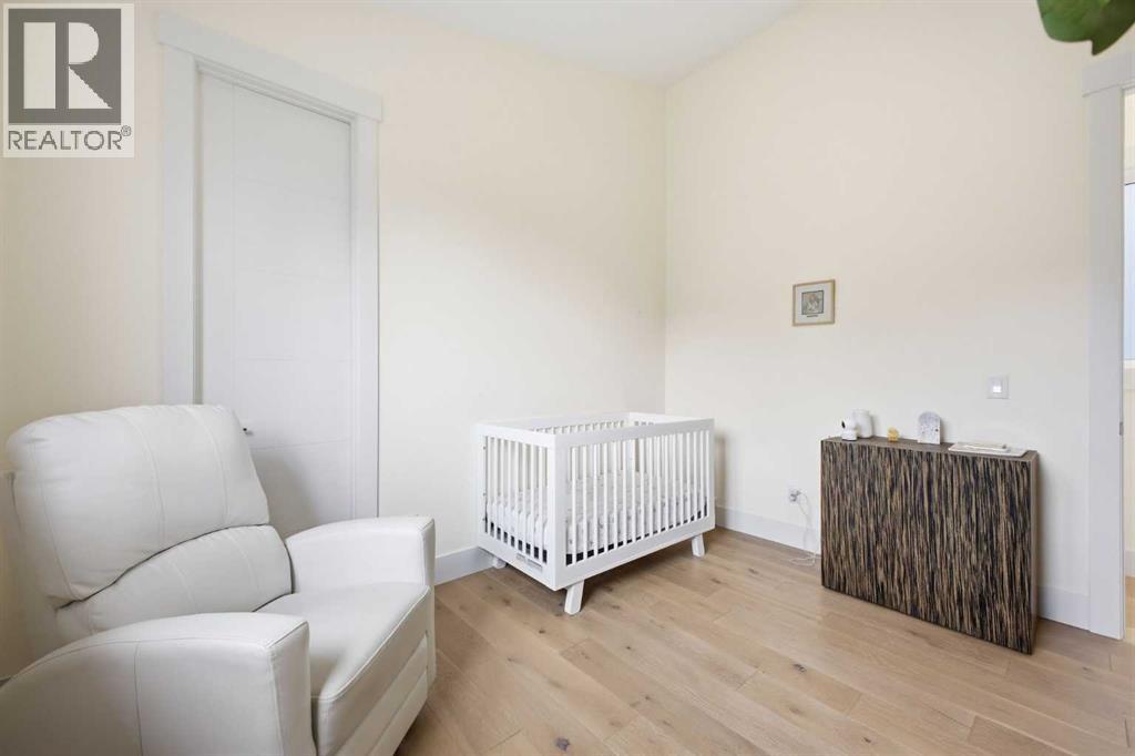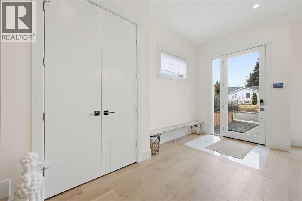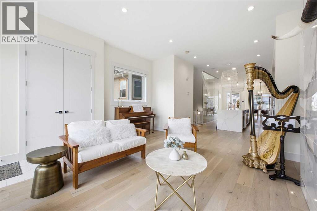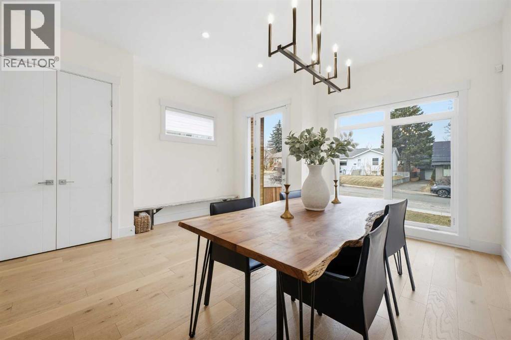 Perfectly positioned in the established community of Shaganappi, this beautifully designed 3+1 bedroom home offers over 2,900 sq ft of modern, elegant living space. The open main level features luxury engineered hardwood flooring, lofty ceilings, and stylish lighting throughout. A spacious front dining room provides ample room to host family and friends and flows seamlessly into the chef’s kitchen, thoughtfully appointed with quartz countertops, a large island with both double and single sinks for effortless prep, custom designed rangehood, abundant storage, and stainless steel appliances. The inviting living room is anchored by a striking floor to ceiling fireplace, creating a warm focal point for everyday living. A 2 piece powder room completes the main level. A glass walled staircase leads to the second floor, where you’ll find three generous bedrooms, engineered hardwood throughout hallways and second floor, a 4 piece main bath, and convenient laundry facilities with a sink and storage. The luxurious primary retreat features a cozy fireplace, walk in closet, and a spa inspired 5 piece ensuite with in floor heat, dual sinks, a relaxing jetted tub, and a rejuvenating steam shower. The front bedroom enjoys access to a private balcony—an ideal spot for morning coffee. The fully developed basement extends the living space with a large recreation/media room complete with a wet bar, perfect for movie nights or game day. A fourth bedroom and 4 piece bath offer comfortable accommodations for guests. Additional highlights include central air conditioning, Delta and Aqua fixtures throughout, upgraded flooring, new HWT (2022), upgraded cabinet pulls/handles, Smart home capability, and built in speakers on the main level, basement, and in the primary suite. Outside, enjoy a spacious back deck—also equipped with built in speakers—and access to the double detached garage. This exceptional home is located directly across from Shaganappi Point Golf Course and is close to Edworth y Park, schools, shopping, public transit, and offers quick access to Bow Trail and 37th Street. (id:63190)