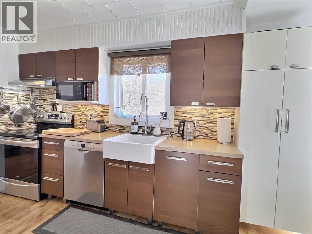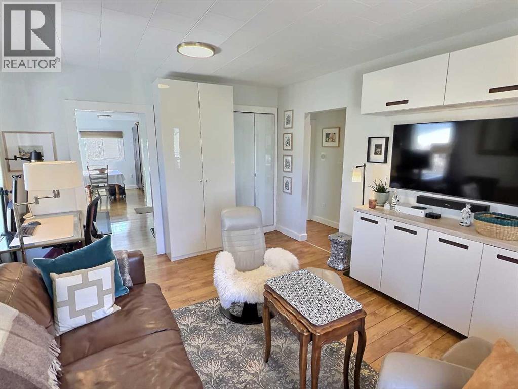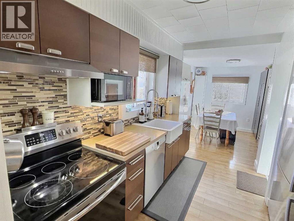 Step inside this lovingly cared for 2 bedroom/1 bathroom bungalow located on a picturesque tree lined street in central Ponoka. This home shines with well thought out space saving design combined with a historic charm. The main floor is comprised of an open flowing living room, kitchen, and dining area. Off the living room are the 2 bedrooms with built in cabinets and the 4-piece bathroom. The basement is a functional space currently used for laundry, a workout area, an office space, and storage. The mature yard is full of trees, shrubs, and a hedge that adds to the beauty of the property. There is a fenced area at the back of the house for pets, or privacy while sitting at your patio. This yard leads straight into the oversized double detached garage. With room for 2 cars plus storage this is every mans dream. The garage is wired and has a gas line ran to it. Over the years this home has underwent a major renovation which included new windows throughout (2015) , a new kitchen (2015), new bathroom, all lighting upgraded, paint and flooring updated, new roof (2011), newer appliances (stove 2023) (dishwasher 2022), furnace has been inspected and maintained and had parts replaced as necessary by the professionals (new blower and humidifier installed) (id:63190)