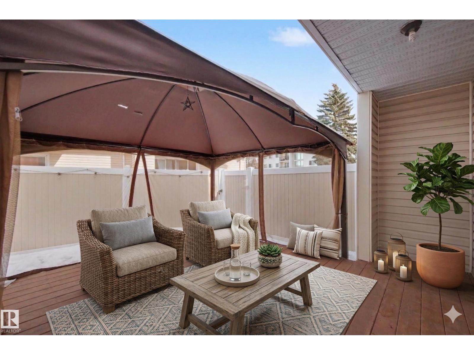 Pet Friendly!! Beautifully maintained 2 bedroom, 2 bathroom end unit offering comfort, convenience, and thoughtful updates throughout (new paint and some new light fixtures)! This bright corner unit features an updated kitchen with modern backsplash, opening to a functional living space perfect for everyday living. Enjoy outdoor living with a new deck, new fence, and a convenient side gate—ideal for easy access on garbage day. The welcoming front porch adds charm, while the energized parking stall is located right out front—no more long winter walks to start your car! Additional storage is found in the basement and under the stairs, providing plenty of space to stay organized. Located in a fantastic area with easy access to Clareview Transit Centre, LRT, schools, shopping, restaurants, and all amenities. A perfect opportunity for first-time buyers, investors, or anyone looking for low-maintenance living in a great location! - some photos are virtually staged (id:63190)