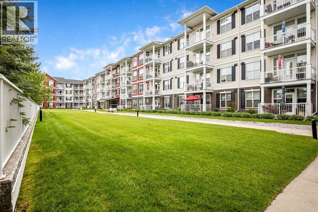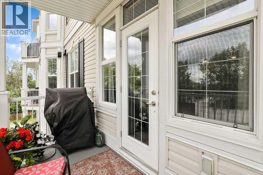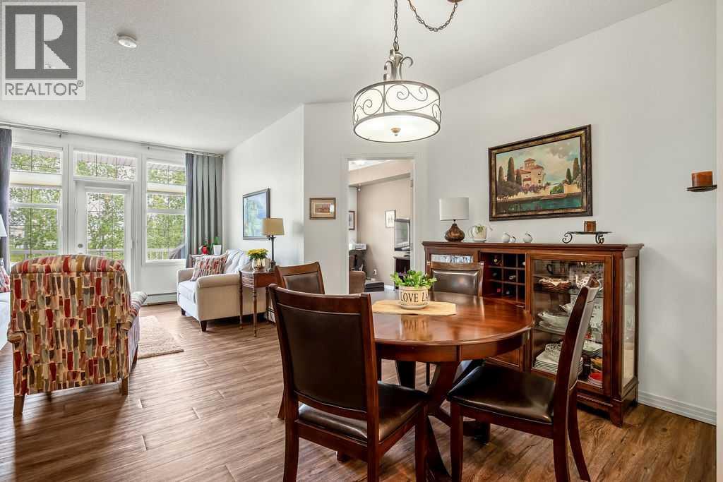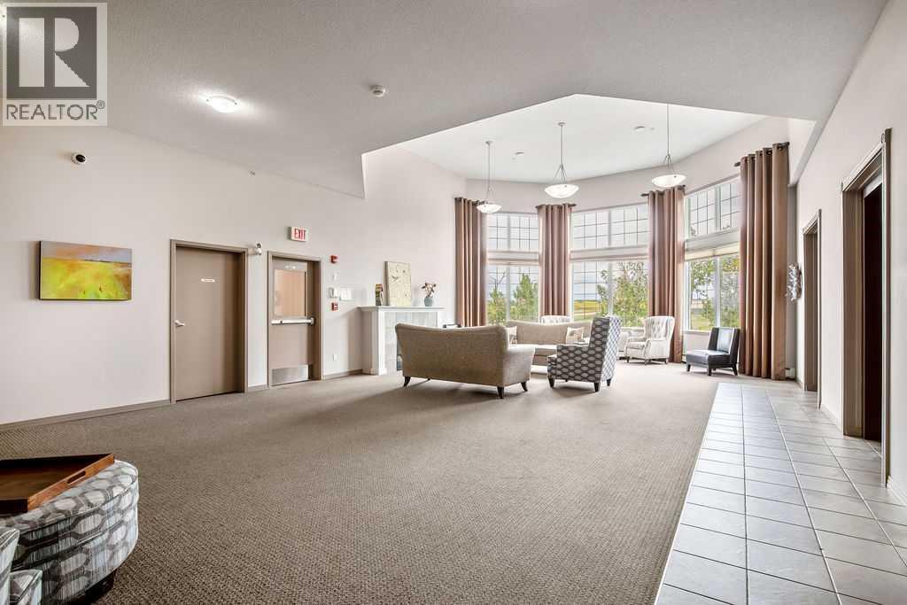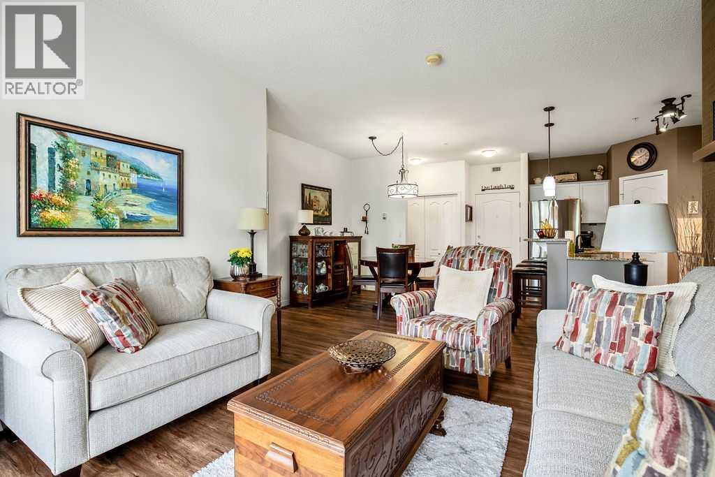 This is a lovely, immaculately maintained, 2 bedroom, 2 bath condo in the attractive Penncross condo building which is located next door to the Crystal Green Golf Course in the north side of Okotoks, convenient to all of Okotoks services, facilities & conveniences. The condo has lots of light filled rooms, a spacious feel with 9’ ceilings, easy care luxury vinyl plank in the main great room, all the stainless steel kitchen appliances have been upgraded in the last year inviting cooks to enjoy the modern kitchen, while providing plenty of storage for your cooking needs. The master bedroom has a large walk through closet area and a private 3 piece ensuite. The second bedroom is currently used as a cozy den/office area with walk through storage to the 4 piece bath and laundry area. The balcony is a welcoming outdoor space to spend leisure time with a gas BBQ hook up in place. There is one underground titled, heated parking space with storage in front and 1 assigned parking stall above ground. The building features amenities of a welcoming foyer with comfortable seating, themed areas off the elevators – a putting green, library, sitting and games area to enjoy, as well as a large fitness room that leads to the fully landscaped, south facing courtyard. Living here also facilitates access to Crystal Shores Lake with beach house & lake access for additional activities (Lake HOA fees are included in the monthly condo fee). When you enter the front door you will appreciate the secure, quiet ambiance. This may be the one for you! (id:63190)