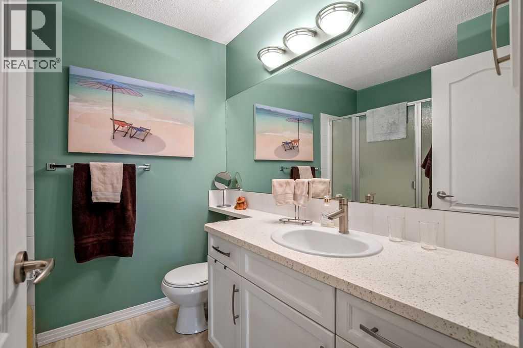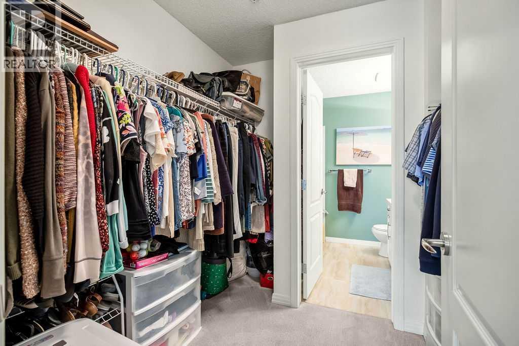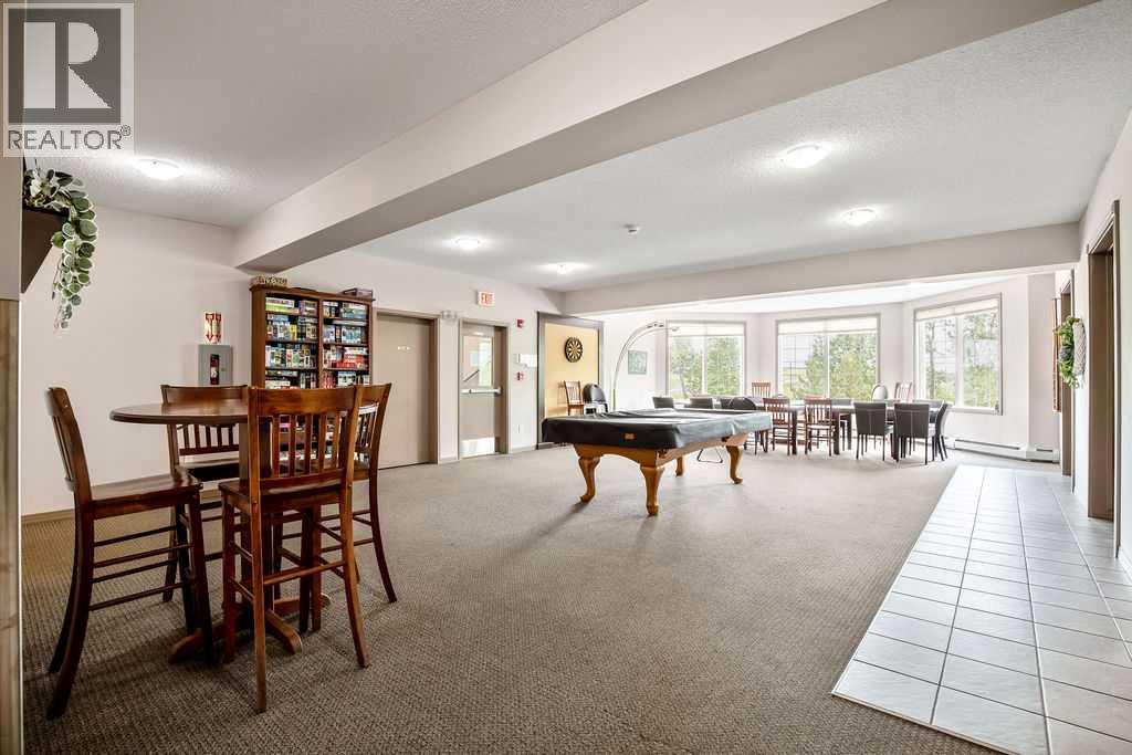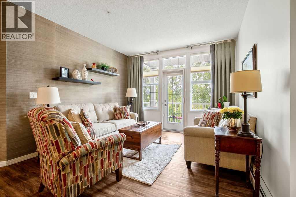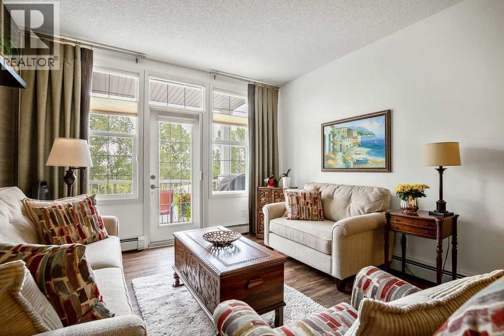 This is a lovely, immaculately maintained, 2 bedroom, 2 bath condo in the attractive Penncross condo building which is located next door to the Crystal Green Golf Course in the north side of Okotoks, convenient to all of Okotoks services, facilities & conveniences. The condo has lots of light filled rooms, a spacious feel with 9’ ceilings, easy care luxury vinyl plank in the main great room, all the stainless steel kitchen appliances have been upgraded in the last year inviting cooks to enjoy the modern kitchen, while providing plenty of storage for your cooking needs. The master bedroom has a large walk through closet area and a private 3 piece ensuite. The second bedroom is currently used as a cozy den/office area with walk through storage to the 4 piece bath and laundry area. The balcony is a welcoming outdoor space to spend leisure time with a gas BBQ hook up in place. There is one underground titled, heated parking space with storage in front and 1 assigned parking stall above ground. The building features amenities of a welcoming foyer with comfortable seating, themed areas off the elevators – a putting green, library, sitting and games area to enjoy, as well as a large fitness room that leads to the fully landscaped, south facing courtyard. Living here also facilitates access to Crystal Shores Lake with beach house & lake access for additional activities (Lake HOA fees are included in the monthly condo fee). When you enter the front door you will appreciate the secure, quiet ambiance. This may be the one for you! (id:63190)
