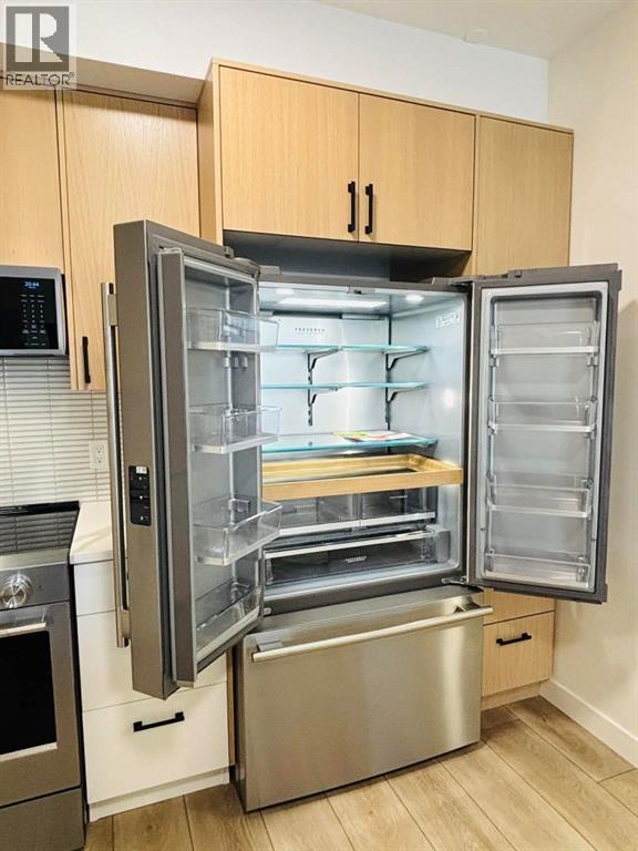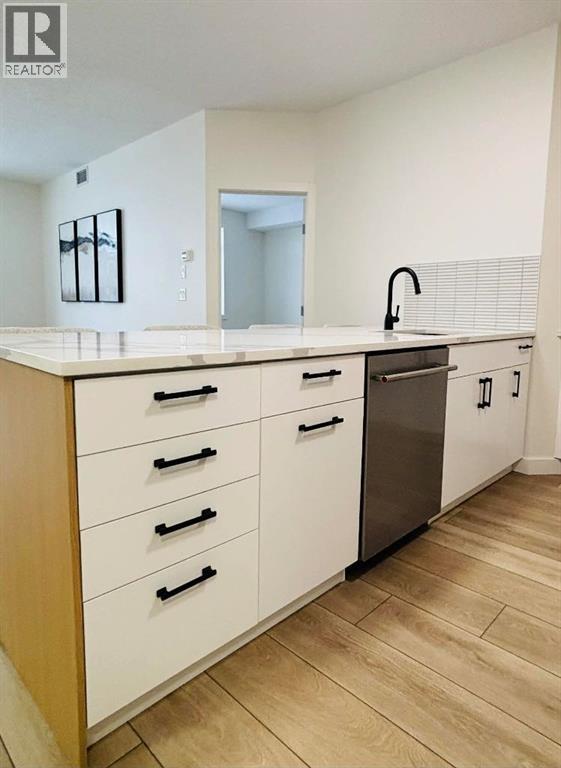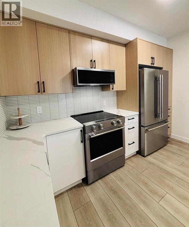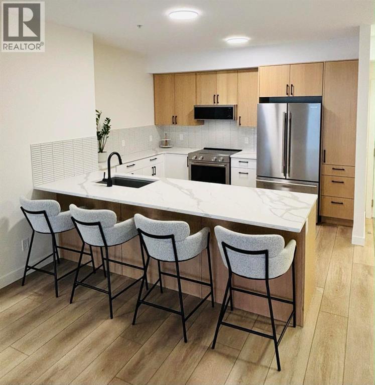 This Eagle Rock condominium is truly one of a kind. Showcasing a magazine-worthy design, this unit features top-of-the-line finishes and exceptional attention to detail throughout. From the luxury vinyl plank flooring to the state-of-the-art kitchen complete with quartz countertops, premium KitchenAid appliances, beautiful white oak cabinetry, and abundant storage, every element has been thoughtfully curated.Ideally located on the main level and facing the mountains, this bright and inviting unit offers 2 bedrooms and 2 full 4-piece bathrooms, both finished with the same stunning white oak cabinetry for a cohesive, high-end feel. Additional features include in-suite laundry, a cozy fireplace, and a brand new air conditioning unit for year-round comfort.This unit also includes two titled parking stalls—one surface and one in the heated underground parkade.Truly move-in ready, with nothing left to do for years to come. Opportunities like this are rare—book your showing today and experience it for yourself. (id:63190)