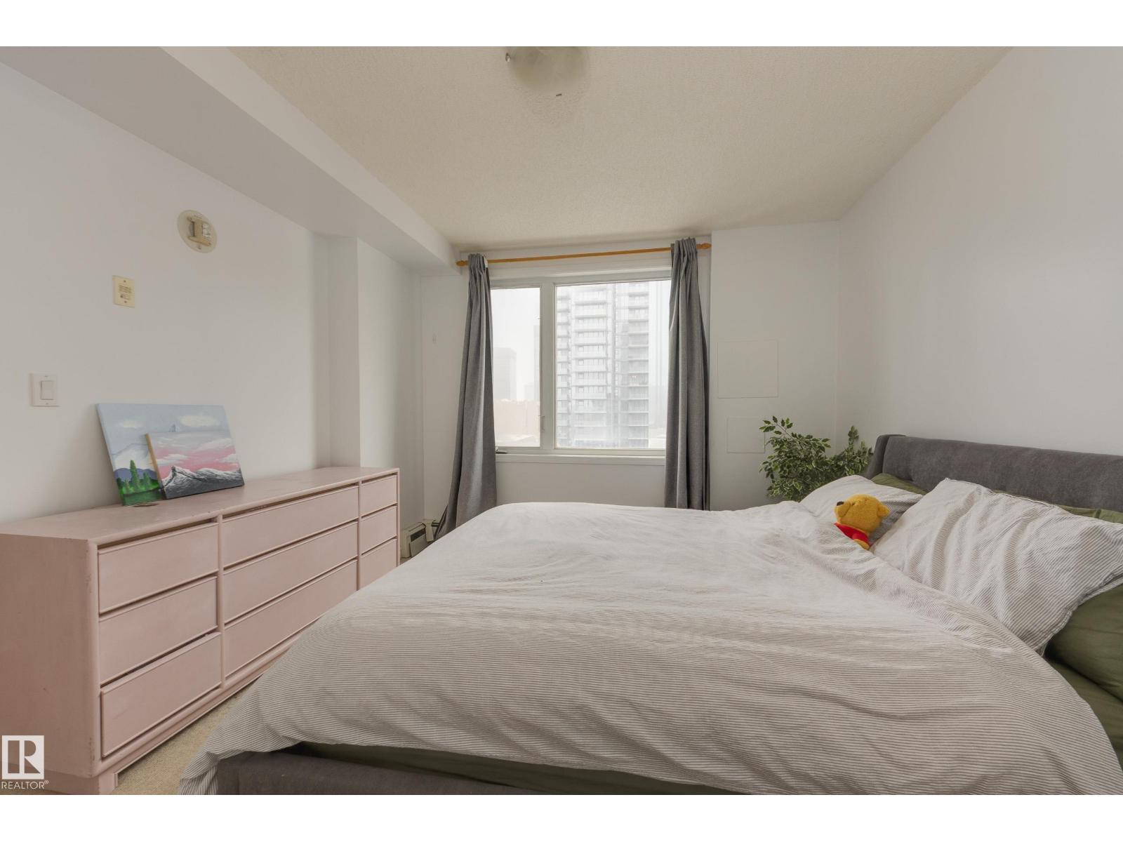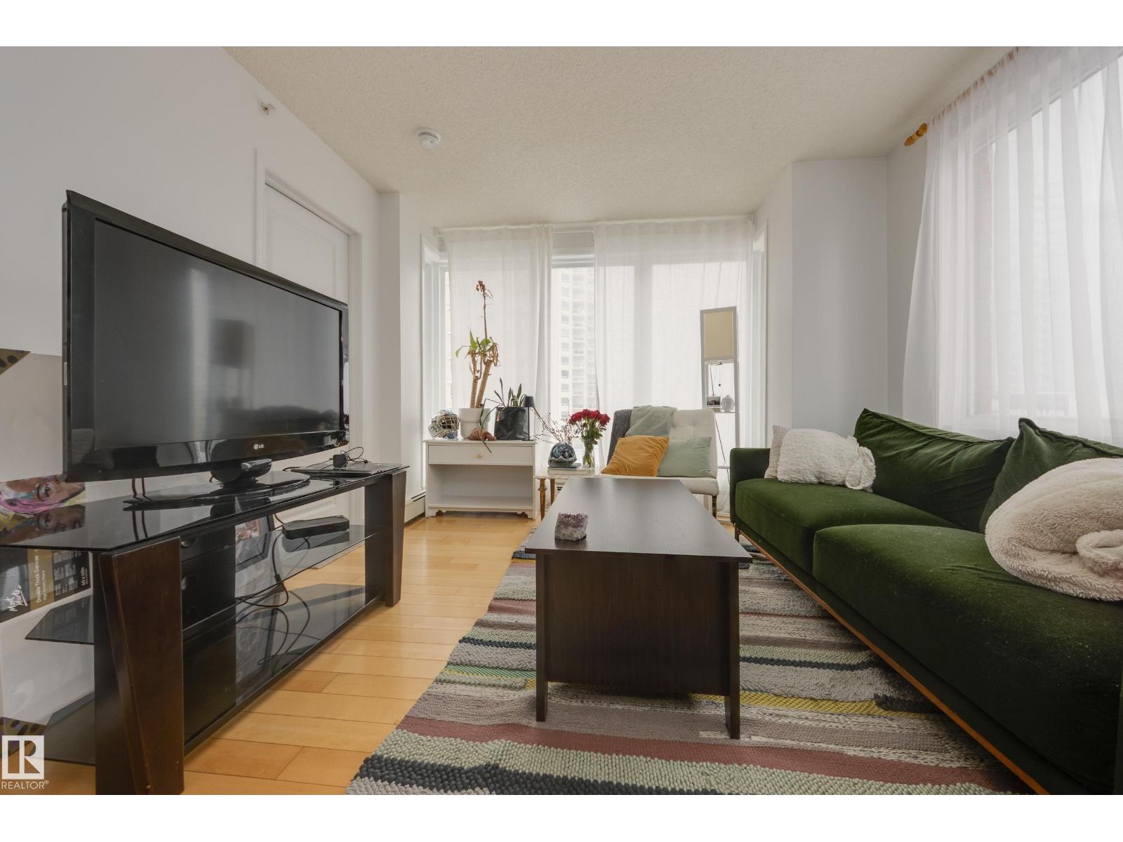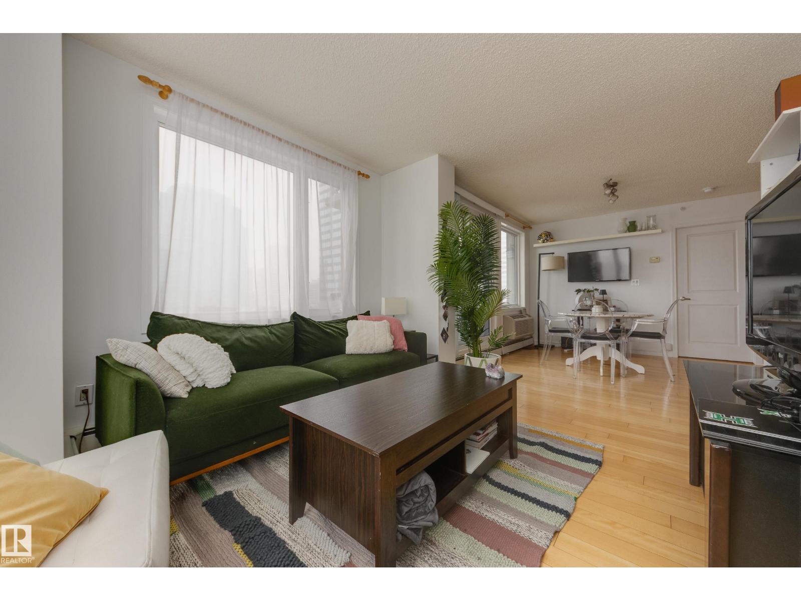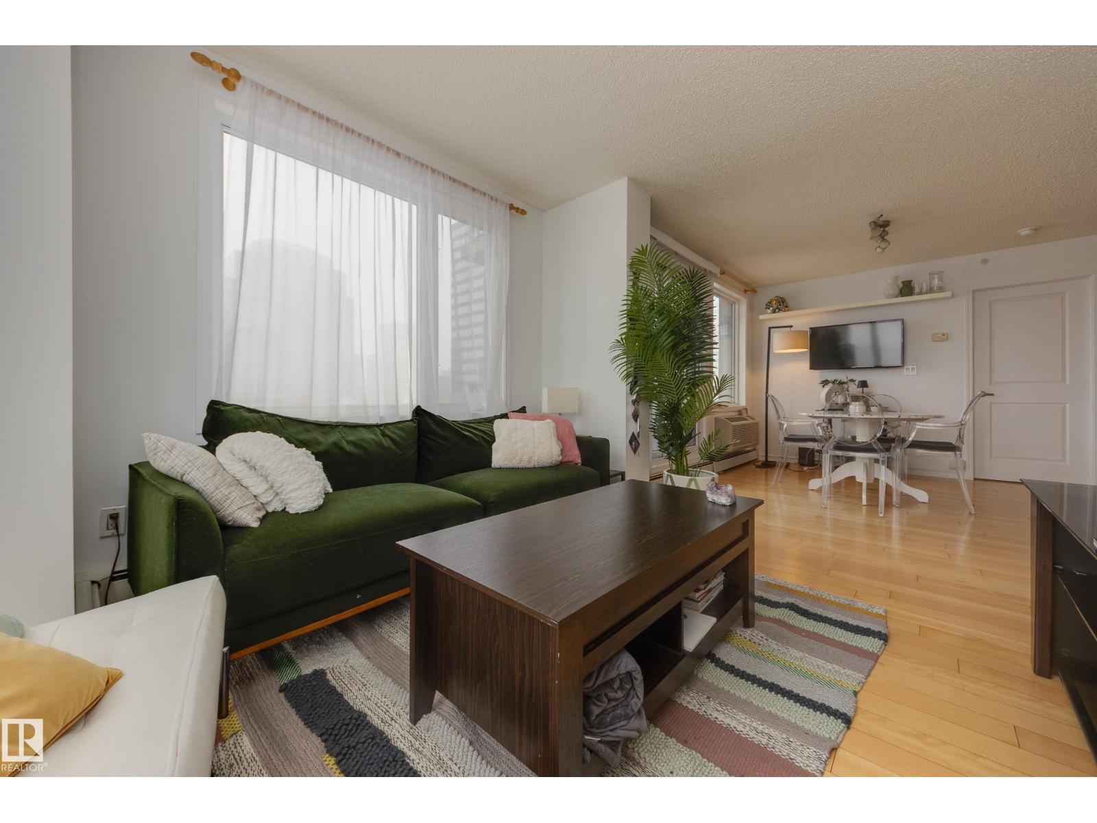 Bright and well-maintained NE corner 2-bedroom air-conditioned condo in the heart of downtown Edmonton with impressive city views. The open concept offers a functional layout with large NE-facing windows to bring in natural light throughout the day. Hardwood flooring runs through the main living areas, with carpet in both bedrooms for comfort. There is also a large storage unit and heated parking. The kitchen and living space flow into the private balcony, creating an ideal setting to enjoy downtown views. The spacious primary bedroom features convenient access to the semi-ensuite bathroom, which is also accessible from the main living room. In-suite laundry adds everyday practicality. Located steps from Rogers Place, Churchill Square, Edmonton City Centre, Winspear Centre, and the LRT, this home offers exceptional walkability to downtown amenities, restaurants, entertainment, and Edmonton's river valley. A great opportunity for first-time buyers, professionals or investors seeking urban living. (id:63190)