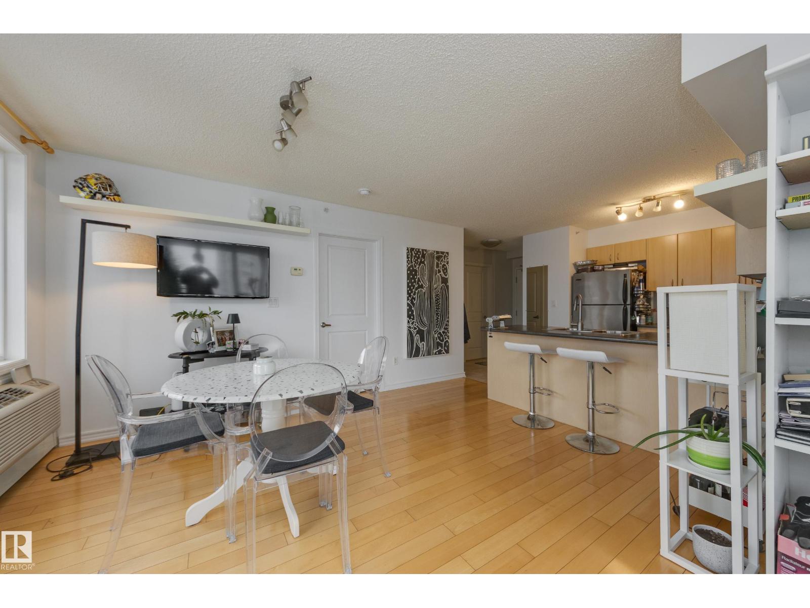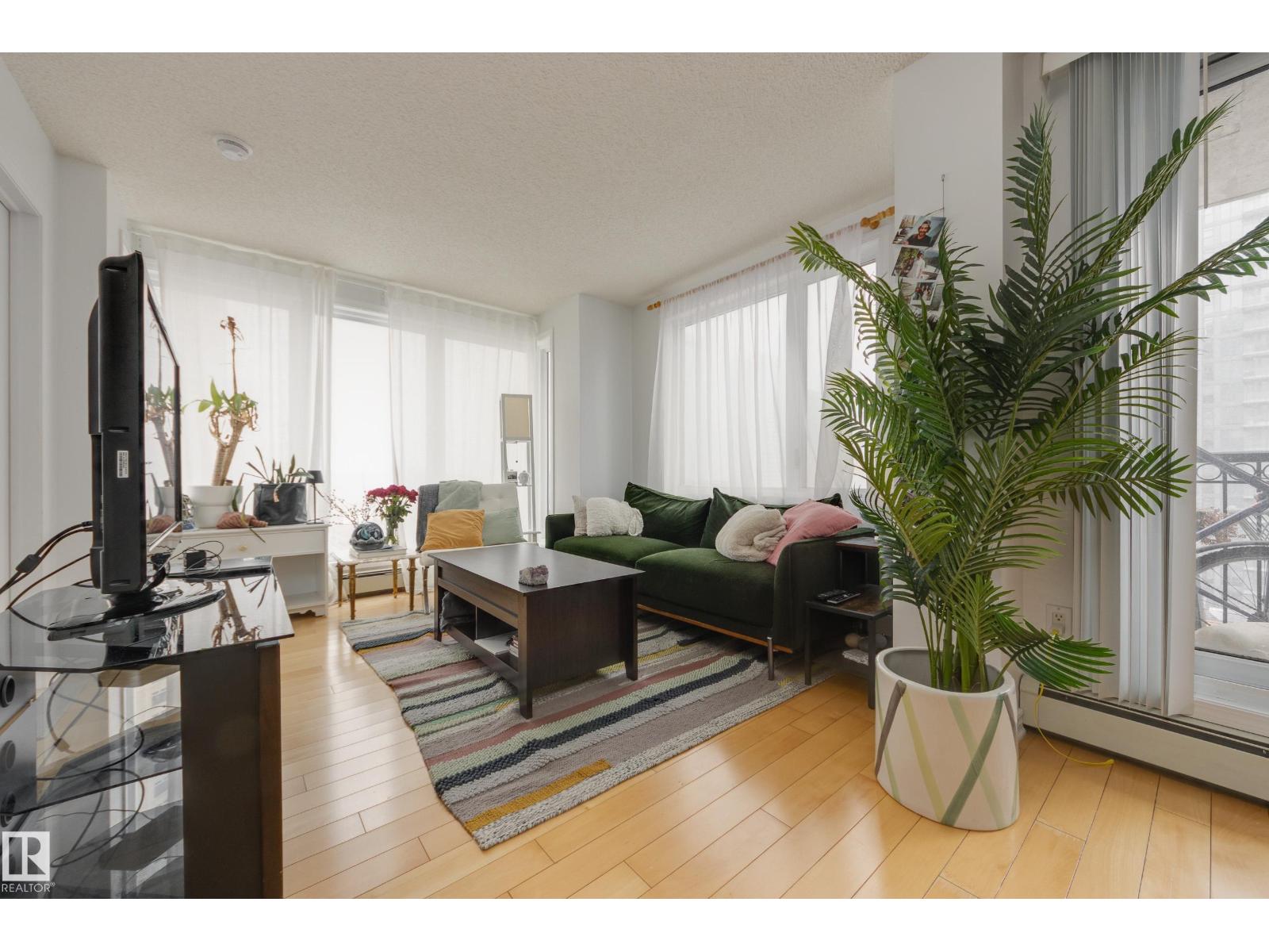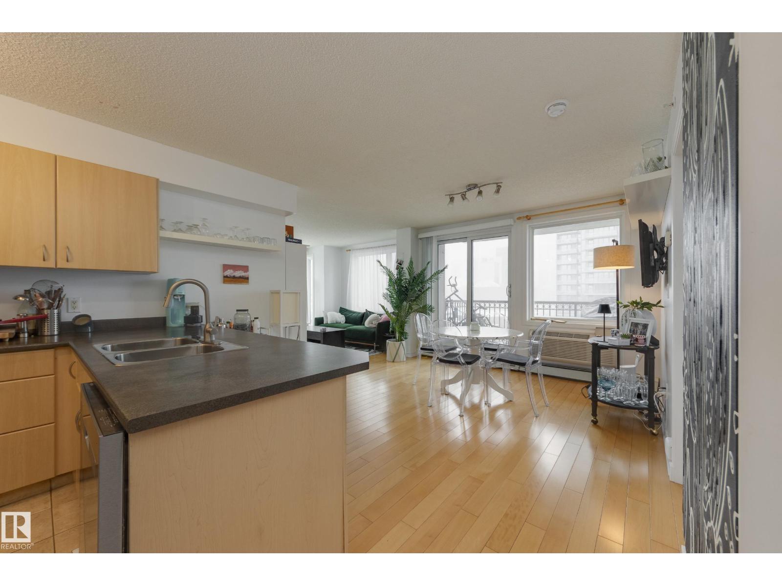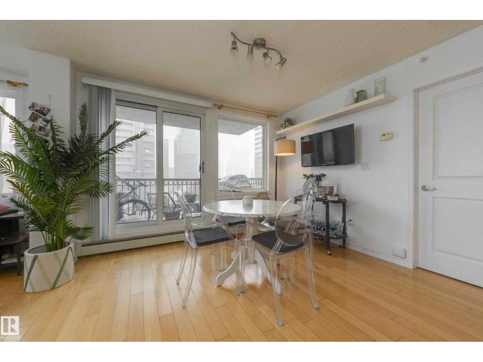Bright and well-maintained NE corner 2-bedroom air-conditioned condo in the heart of downtown Edmonton with impressive city views. The open concept offers a functional layout with large NE-facing windows to bring in natural light throughout the day. Hardwood flooring runs through the main living areas, with carpet in both bedrooms for comfort. There is also a large storage unit and heated parking. The kitchen and living space flow into the private balcony, creating an ideal setting to enjoy downtown views. The spacious primary bedroom features convenient access to the semi-ensuite bathroom, which is also accessible from the main living room. In-suite laundry adds everyday practicality. Located steps from Rogers Place, Churchill Square, Edmonton City Centre, Winspear Centre, and the LRT, this home offers exceptional walkability to downtown amenities, restaurants, entertainment, and Edmonton's river valley. A great opportunity for first-time buyers, professionals or investors seeking urban living. (id:63190)