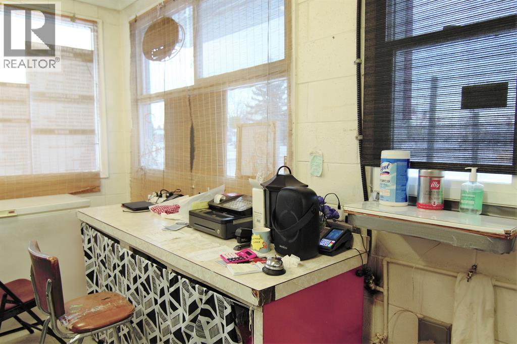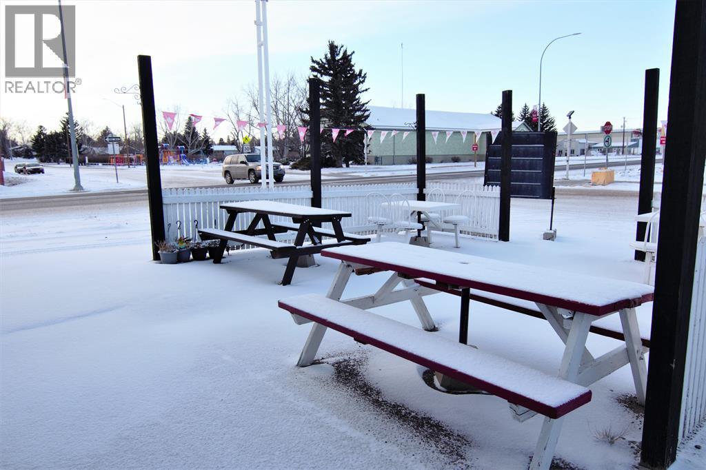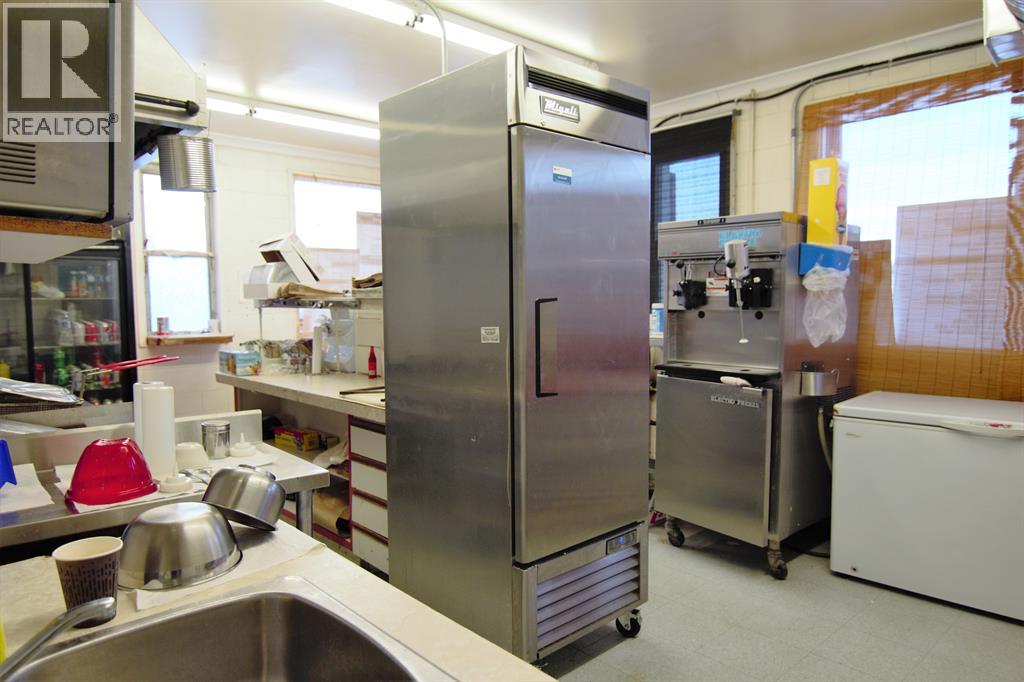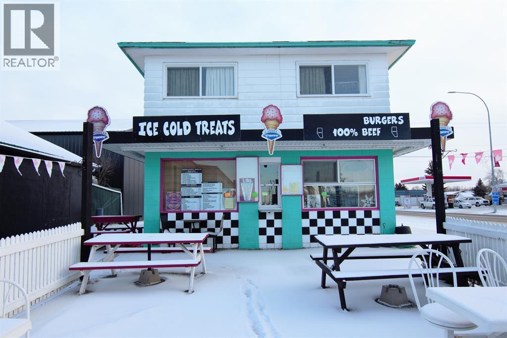 Location , location, location!! Great opportunity for a business down and live up. Great location on the main highway going south on #2. Burger and ice-cream drive-thru is excellent for clients wanting to stop quickly on their way through town. Also great for customers taking a drive on a Sunday. 40 mins south of Calgary city limits. Over 1500 sq ft. Upstairs has a one bedroom resident for the owner operator. The residence has been completely renovated a year ago. One bedroom, 4 pce bath, large open kitchen living room. Shingles 2010, Furnace and hot water tank 2014. Large storage shed attached to the main building for great storage. South, and west patio in front for customers to sit on those great spring and summer days. With town approval it could be easily covered to add more sq ft to the main building. Plenty of parking in back as well as on the street. This has amazing value and would be a great investment !! Tons of potential. Client is motivated. (id:63190)