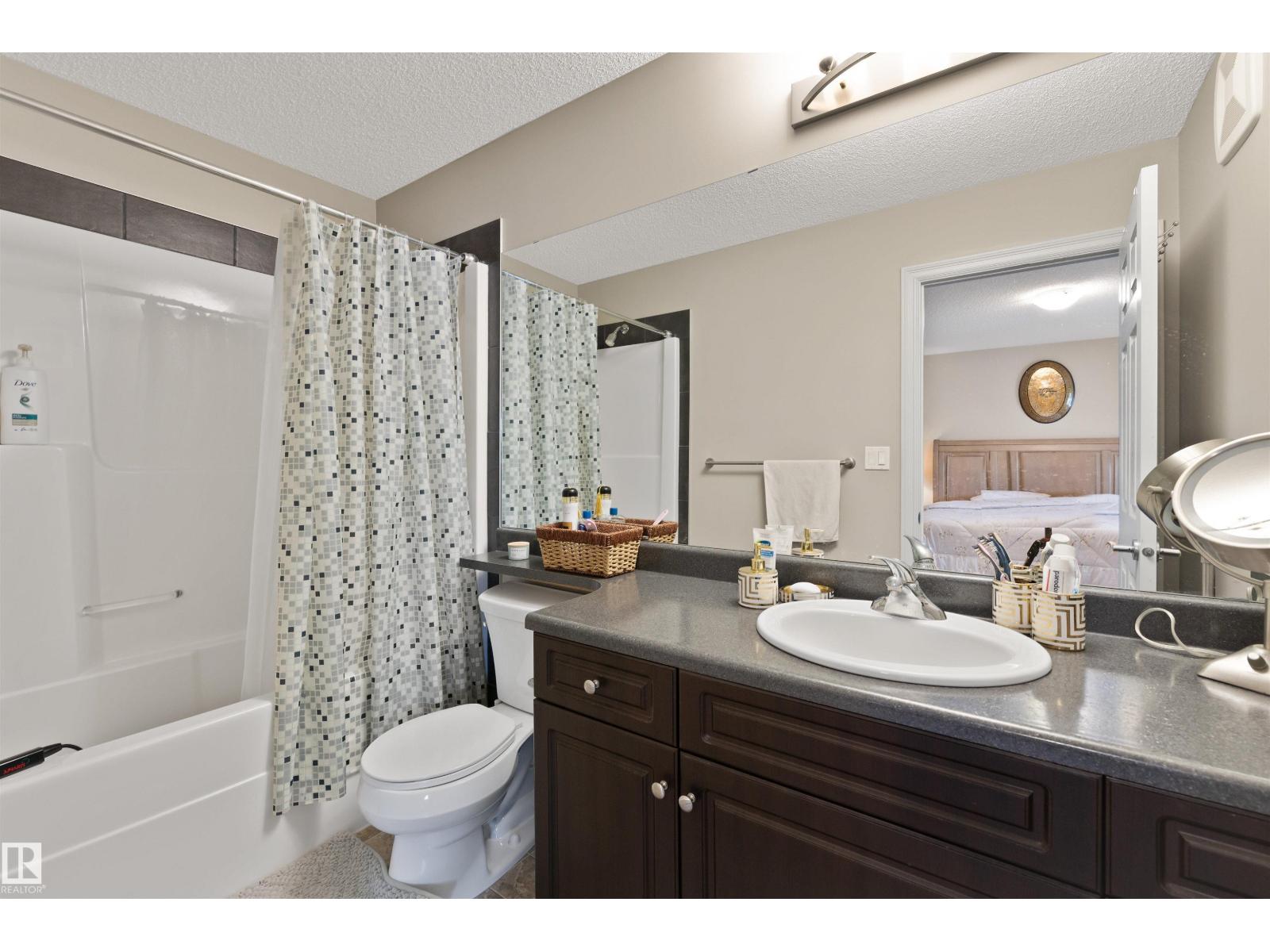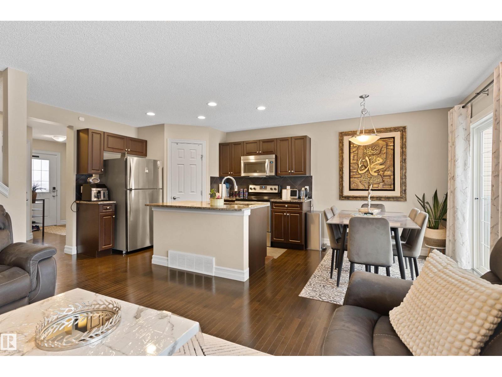 Discover this stylish Half Duplex in a prime location in Albany, northwest Edmonton! This beautifully maintained 2-bedroom half duplex is ideal for small families, professionals, or anyone looking for comfort and convenience. The main floor is an open floor concept- perfect for entertaining. The kitchen features dark cabinetry with GRANITE countertops, stainless steel appliances, corner pantry and a great view of the large backyard. HARDWOOD floors and a two piece bathroom complete the main floor. The second floor features two spacious bedrooms both with their own four piece ensuite and walk in closets! The laundry room is conventiently located on the upper level for comfort and ease. The basement is FULLY FINISHED with VINYL PLANK. A single attached garage (11'3 x 21'7) and high-velocity mini-duct system furnace complete this fantasic home. Close to shopping centres and easy access to the Anthony Henday! (id:63190)