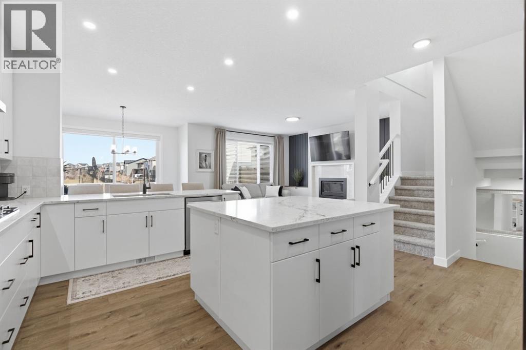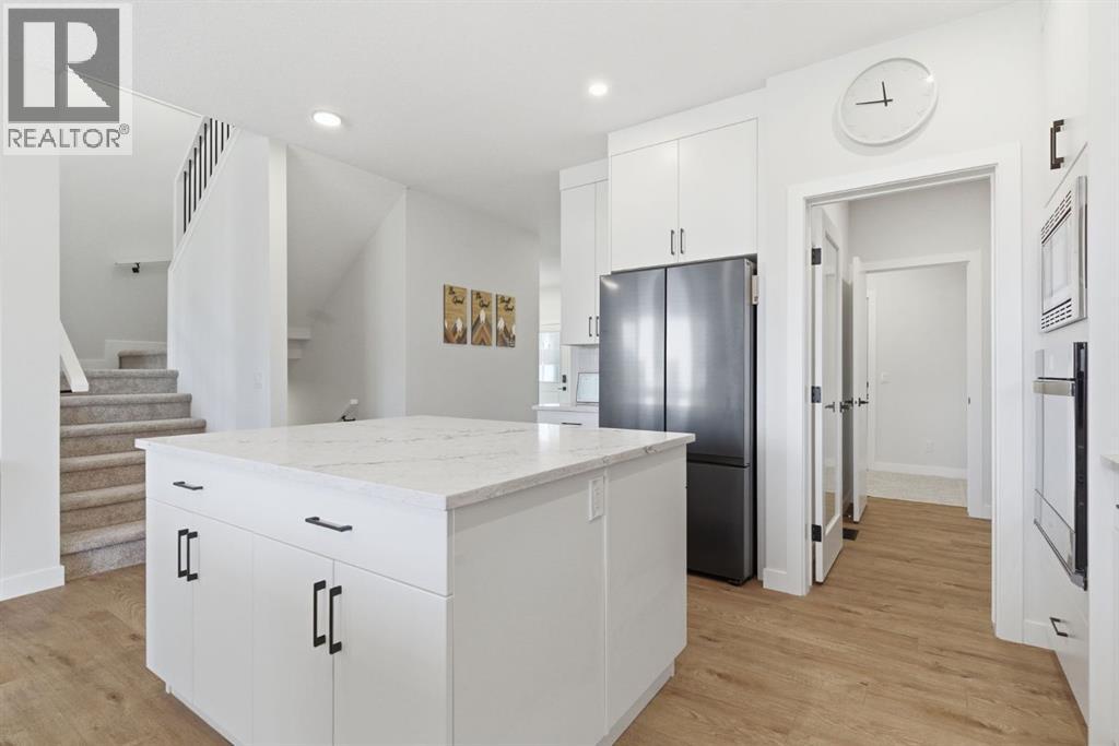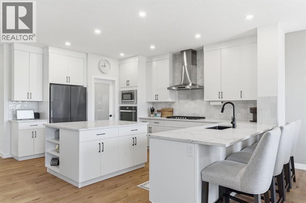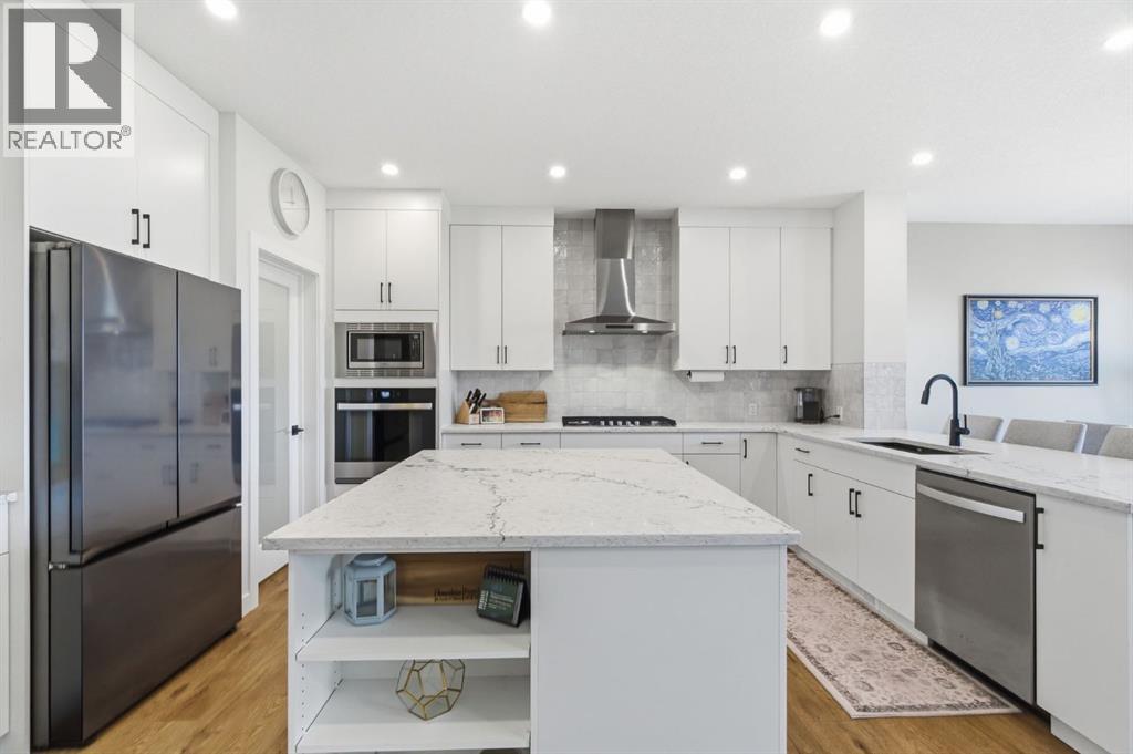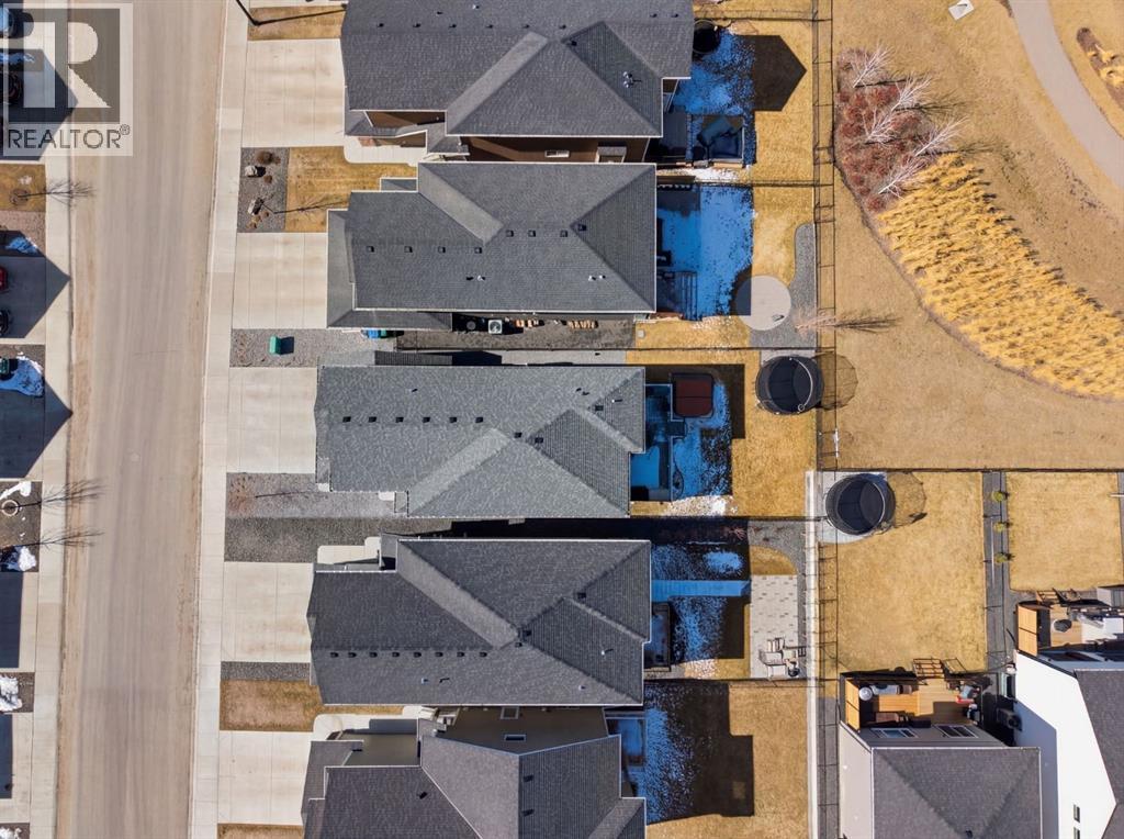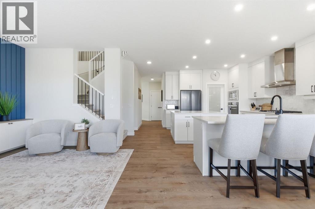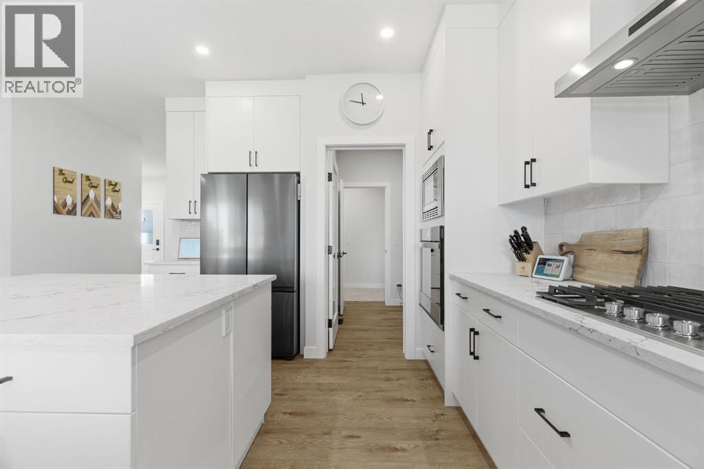 **OPEN HOUSE: 1 - 3PM, April 11, 2026 (Saturday)** Welcome to 117 Ranchers View in Okotoks. This home is better than brand new. Built just over a year ago by Sterling Homes and still offering New Home Warranty, it has been kept in meticulous condition and delivers what new builds don’t. A fully finished basement, Gemstone Lights, completed landscaping with a fenced yard and irrigation, window coverings already in place, and a washer and dryer included. All the extras are done, so you can just move in and enjoy. Offering just under 2,500 sqft above grade and over 3,400 sqft of total developed living space, this home checks every box. You’ll notice the curb appeal right away with hardie-board siding on both the front and back, along with an oversized double attached garage. Out back, the home backs onto a green belt with open sightlines across the green space, creating a private and peaceful setting. The main floor features durable vinyl plank flooring, a front office, a half bath, and a functional mudroom off the garage with built-in shelving. A walk-through pantry leads you into the upgraded kitchen, complete with ceiling-height cabinetry, quartz countertops, two islands, a stainless steel fridge, built-in microwave and oven, and a gas cooktop. This is a true chef’s kitchen designed for both everyday living and entertaining. The open concept layout flows seamlessly into the living room with a fireplace, and into the dining area with patio doors leading to your composite deck. From here, you’ll enjoy incredible views of the large yard and green space behind. Upstairs features the highly sought-after four bedrooms on one level, along with a spacious bonus room. Two of the bedrooms are positioned perfectly for kids with a nearby bathroom, while the third bedroom sits closer to the primary. The primary bedroom offers a large walk-in closet and expansive windows overlooking the green space and pathway. The ensuite includes double sinks, a soaker tub, tiled shower, and a separate water closet. The recently developed basement offers 9-foot ceilings, a dry bar with included fridge, and a feature wall with a TV, along with a great open flex space perfect for a kids homework zone or easily converted into a fifth bedroom. Around the corner is a beautifully finished bathroom with custom tile, along with additional storage under the stairs. Located in one of Okotoks’ most desirable areas, you’ll love the quick access to the highway and proximity to schools. Why buy brand new when you can own better than brand new. (id:63190)
