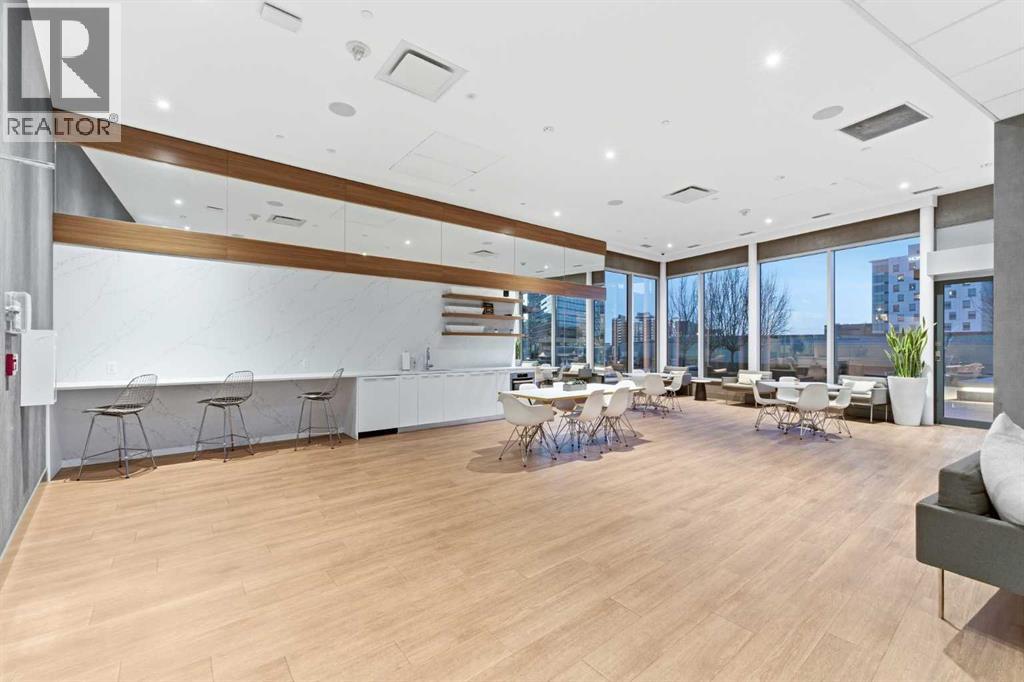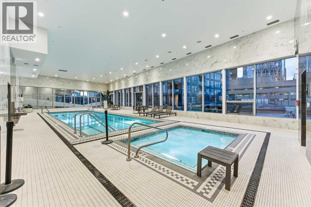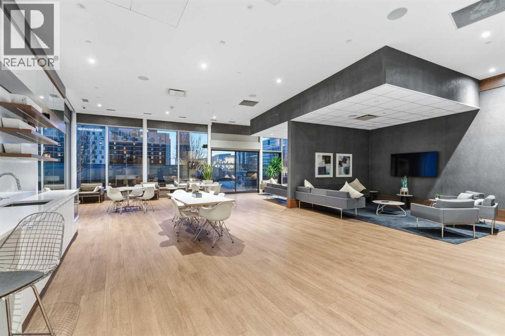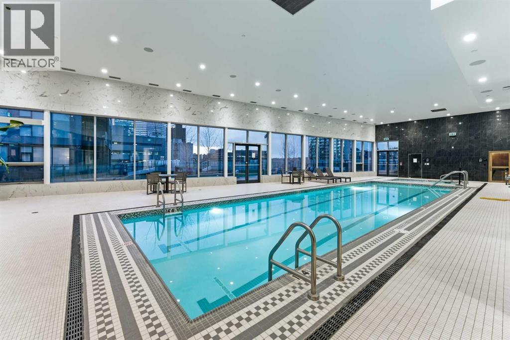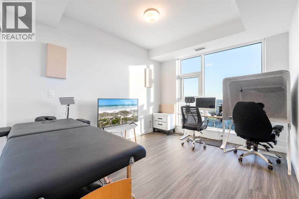 Unobstructed views of the Rocky Mountains, the Bow River, and the Calgary skyline — all from the 35th-floor southwest corner of Arris in East Village, Calgary, Alberta. This 1,150-square-foot, 2-bedroom plus den, 2-bathroom condominium features floor-to-ceiling windows on two exposures flooding the unit with natural light throughout the day.The open-concept kitchen includes a Fulgor Milano wall oven, a 5-burner gas cooktop, quartz countertops with a marble-pattern backsplash, flat-panel white cabinetry with soft-close drawers, a stainless steel refrigerator, and an integrated hood fan with a cabinet-matching cover. Luxury vinyl plank flooring runs throughout the living and dining areas. The southwest corner living space offers direct sightlines to the Calgary Tower and the Bow River.The primary bedroom accommodates a king-size bed and features a tiled ensuite bathroom. An open den off the main hallway provides dedicated home office space with room for a dual-monitor workstation. The second bedroom and second full bathroom complete the layout.Arris offers world-class, resort-style amenities — widely regarded as the best in any Calgary condominium. The entire second floor is dedicated to resident amenities including an indoor swimming pool, hot tub, sauna, steam room, commercial-grade fitness centre with a dedicated spin and yoga studio, social lounge with bar counter and kitchenette, and a party room opening to an outdoor terrace. A rooftop turf dog park with city views and multiple outdoor gathering areas with fire features and seating complete the package.Two heated underground parking stalls and a separate storage locker are included. Ground-floor retail within Arris provides direct access to a Superstore grocery, Shoppers Drug Mart pharmacy, and a liquor store — daily errands without leaving the building. The Bow River pathway system is a short walk from the front door, connecting to Prince's Island Park, St. Patrick's Island, and the East Village RiverWalk. East Village offers direct access to the National Music Centre, Central Library, and the restaurants and shops along International Avenue. (id:63190)