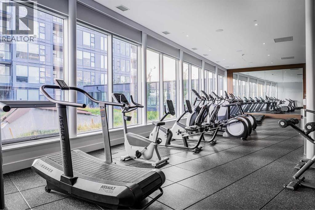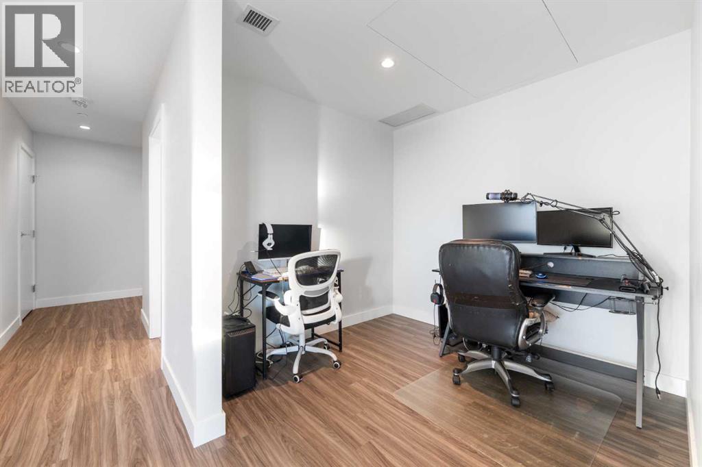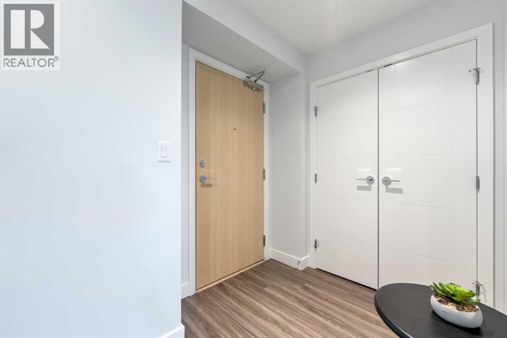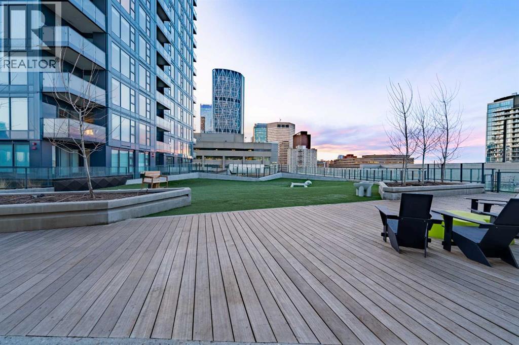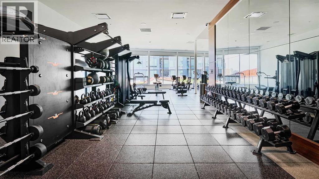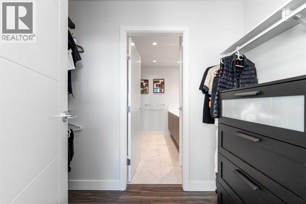 Unobstructed views of the Rocky Mountains, the Bow River, and the Calgary skyline — all from the 35th-floor southwest corner of Arris in East Village, Calgary, Alberta. This 1,150-square-foot, 2-bedroom plus den, 2-bathroom condominium features floor-to-ceiling windows on two exposures flooding the unit with natural light throughout the day.The open-concept kitchen includes a Fulgor Milano wall oven, a 5-burner gas cooktop, quartz countertops with a marble-pattern backsplash, flat-panel white cabinetry with soft-close drawers, a stainless steel refrigerator, and an integrated hood fan with a cabinet-matching cover. Luxury vinyl plank flooring runs throughout the living and dining areas. The southwest corner living space offers direct sightlines to the Calgary Tower and the Bow River.The primary bedroom accommodates a king-size bed and features a tiled ensuite bathroom. An open den off the main hallway provides dedicated home office space with room for a dual-monitor workstation. The second bedroom and second full bathroom complete the layout.Arris offers world-class, resort-style amenities — widely regarded as the best in any Calgary condominium. The entire second floor is dedicated to resident amenities including an indoor swimming pool, hot tub, sauna, steam room, commercial-grade fitness centre with a dedicated spin and yoga studio, social lounge with bar counter and kitchenette, and a party room opening to an outdoor terrace. A rooftop turf dog park with city views and multiple outdoor gathering areas with fire features and seating complete the package.Two heated underground parking stalls and a separate storage locker are included. Ground-floor retail within Arris provides direct access to a Superstore grocery, Shoppers Drug Mart pharmacy, and a liquor store — daily errands without leaving the building. The Bow River pathway system is a short walk from the front door, connecting to Prince's Island Park, St. Patrick's Island, and the East Village RiverWalk. East Village offers direct access to the National Music Centre, Central Library, and the restaurants and shops along International Avenue. (id:63190)