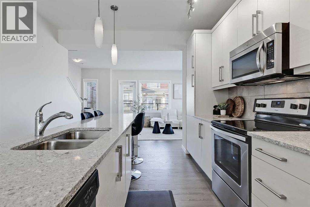 Welcome to refined townhome living, set within one of Cochrane’s most scenic and thoughtfully planned communities! Backing onto rolling natural landscapes with elevated sightlines, this modern three-storey residence offers the rare balance of contemporary design, functional space, and everyday comfort, all just minutes from downtown Cochrane and the Bow River pathway system.Spanning over 1,715 sq ft of developed living space, this home is bright, airy, and beautifully laid out across three levels, designed for both daily living and entertaining. The main floor features an open-concept design anchored by a sleek white kitchen with full-height cabinetry, stainless steel appliances, and generous quartz countertops. Clean lines, soft neutral tones, and wide-plank flooring create a calm, modern backdrop that feels effortless and inviting. The dining area is perfectly positioned between the kitchen and upper balcony, creating an easy flow for everyday meals and summer entertaining, with space for outdoor dining and BBQs. On the opposite side, the living room is set at the front of the home, offering a bright, open space framed by large windows and an additional private balcony. This separation creates distinct zones for dining and relaxing, while maintaining an airy, connected feel throughout the main level.Upstairs, the private living quarters are smartly arranged. The primary suite is bright and inviting, complete with a walk-in closet and a well-appointed ensuite featuring a glass-enclosed shower and contemporary finishes. Two additional bedrooms provide excellent versatility for family, guests, or a dedicated home office, all supported by a full four-piece bathroom. Thoughtful proportions and natural light continue throughout the upper level, creating a sense of space rarely found in townhome living.The ground floor adds valuable functionality with an oversized tandem garage offering ample room for vehicles, bikes, storage, or seasonal gear. This level also incl udes mechanical space and direct access to the home, making daily routines seamless and practical. Beyond the home itself, River Heights is known for its elevated setting, peaceful surroundings, and strong sense of community. Residents enjoy quick access to walking and biking trails, playgrounds, schools, and local amenities, while still being moments from Cochrane’s historic downtown, cafés, and shops. With Calgary less than 30 minutes away and the Rocky Mountains within easy reach, this location offers a lifestyle that blends convenience with natural beauty.Modern, low-maintenance, and thoughtfully designed, #408, 501 River Heights Drive is an exceptional opportunity to own a turnkey townhome in one of Cochrane’s most desirable communities. A home that feels current, comfortable, and effortlessly livable. (id:63190)