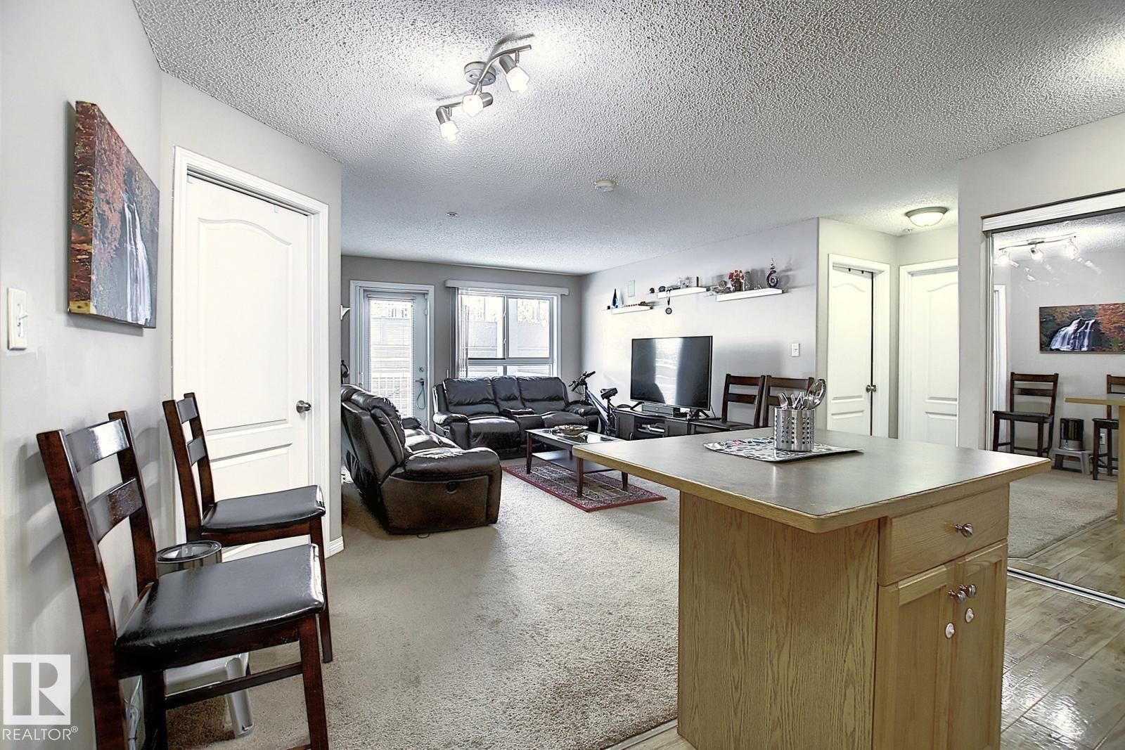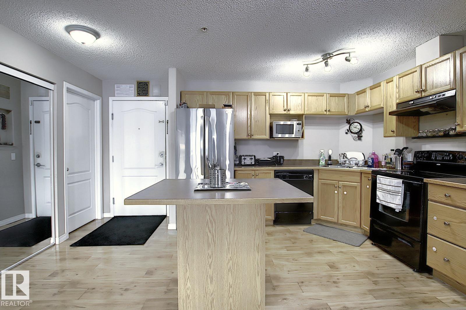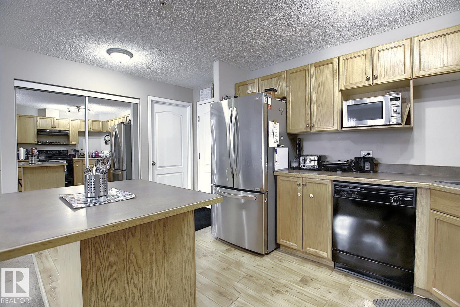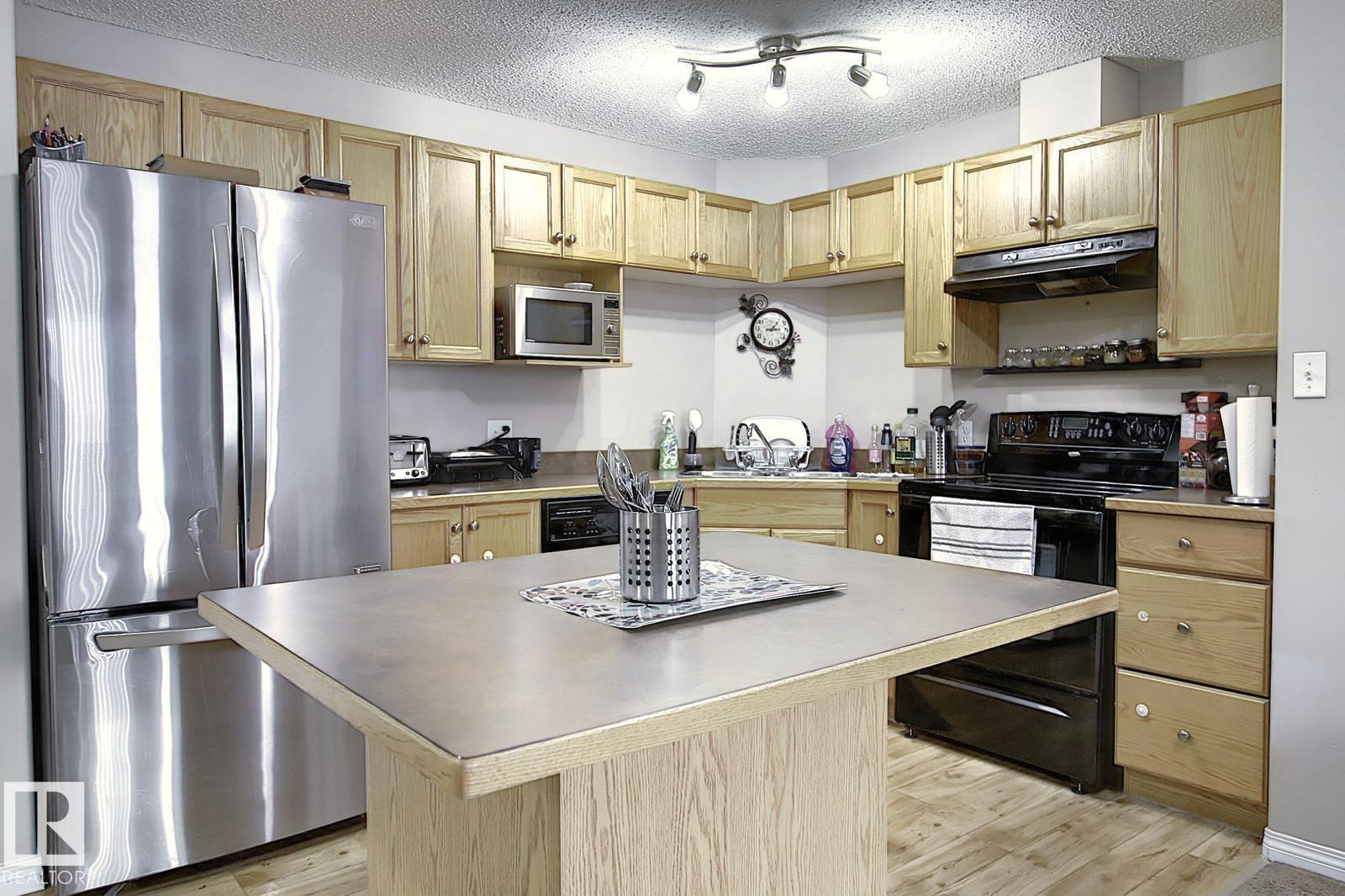 Welcome to Park Place Hampton. This well-kept 2 bedroom, 2 bathroom condo offers a functional layout with comfortable living space. The kitchen features upgraded oak cabinets, plenty of counter space, black appliances, and a large island that’s great for everyday use or casual dining. The primary bedroom includes a walk-in closet and a full ensuite, while the second bedroom is set on the opposite side, making it ideal for guests or a home office. You’ll also find in-suite laundry, extra storage, and a titled above-ground parking stall. Conveniently located within walking distance to schools and just minutes from Anthony Henday, Whitemud Drive, and West Edmonton Mall, with easy access to all amenities. (id:63190)