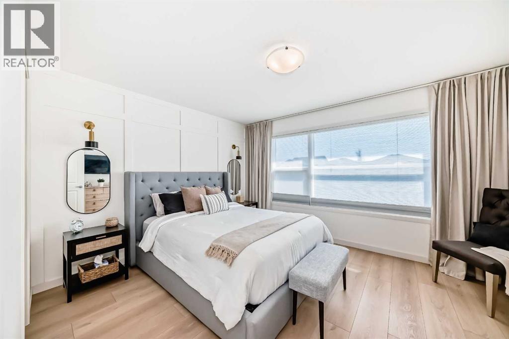 Spacious primary retreat featuring large windows, designer feature wall, and soft natural light