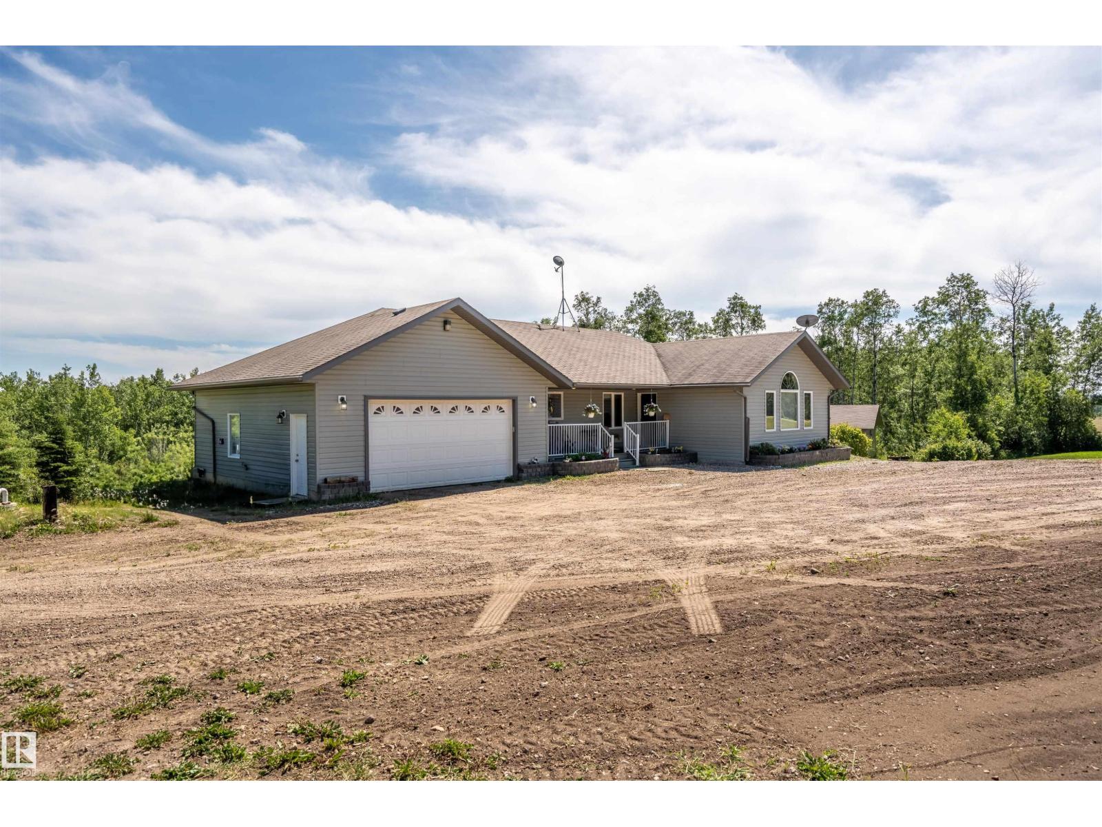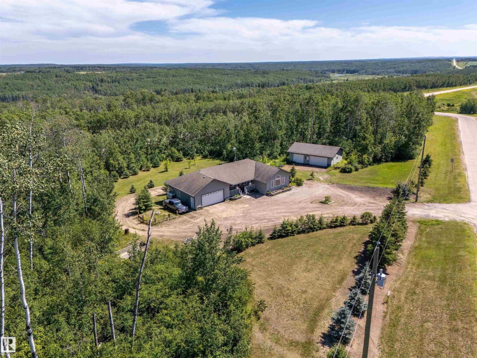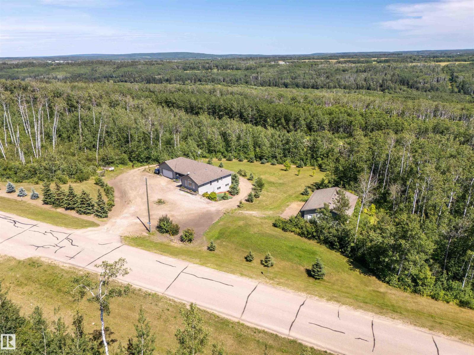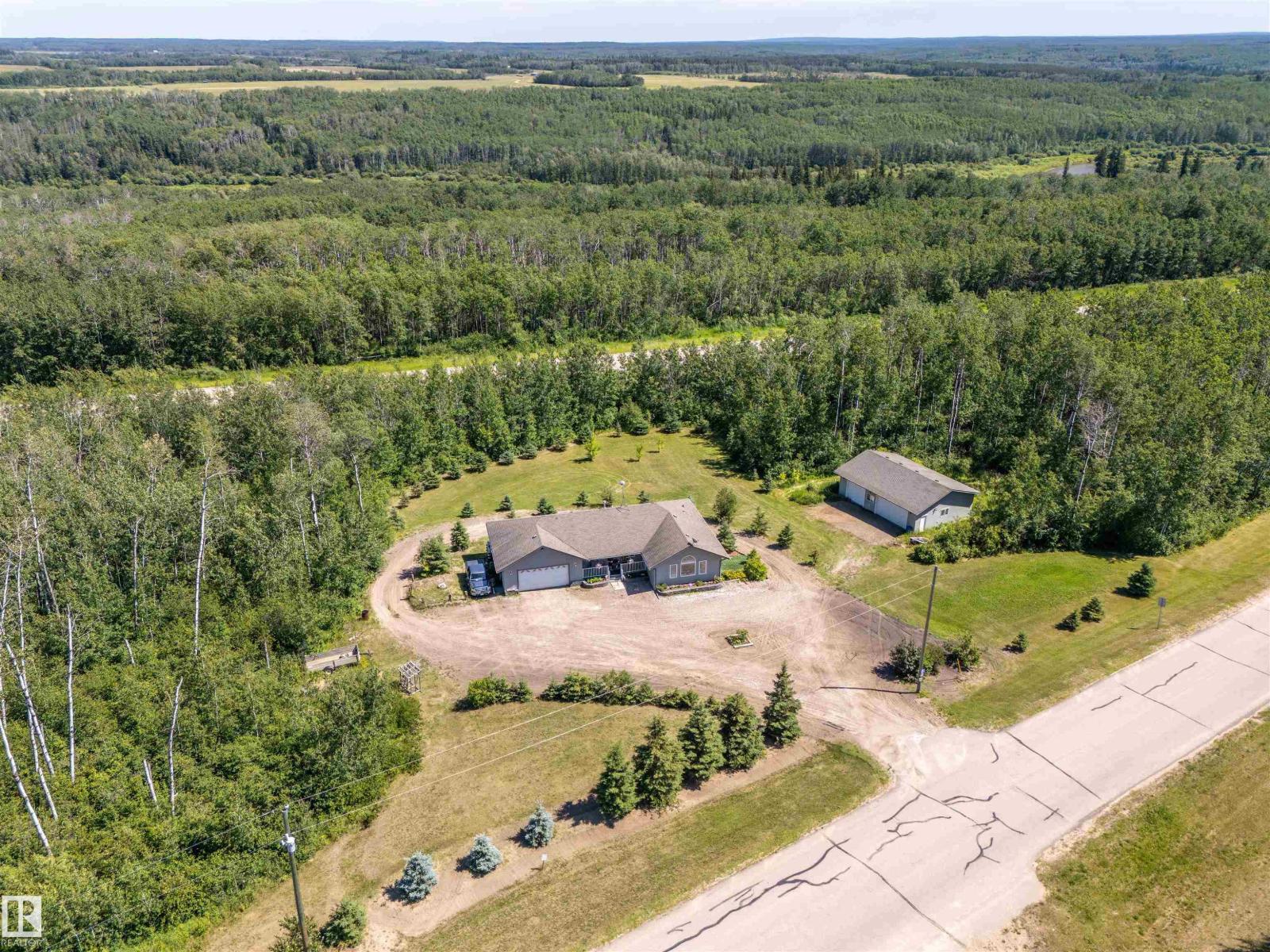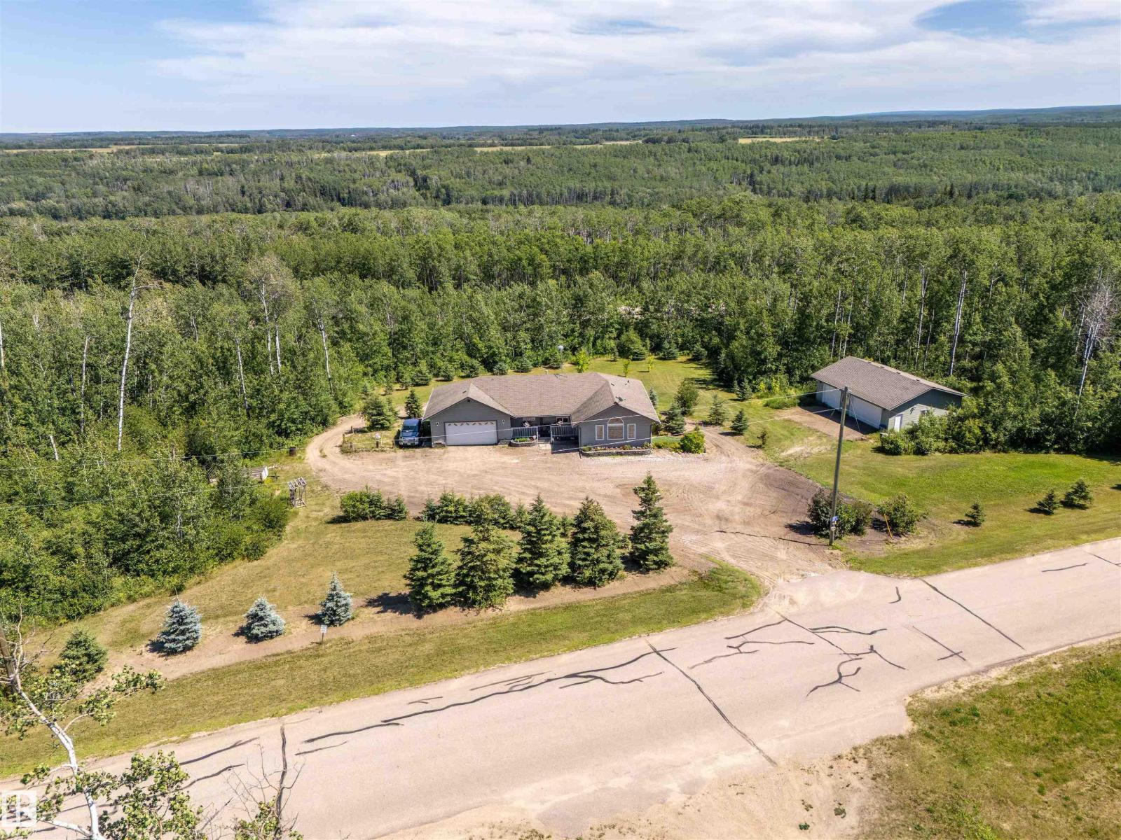 A custom-built original owner home, ideally located on 3.6 acres just a 10-minute drive from Cold Lake. As you enter, you have inviting hardwood floors that flow through the main level. The spacious living room features vaulted ceilings while seamlessly connecting to the open-concept dining and kitchen area. The kitchen showcases hickory cabinets and eat up area. The main floor provides practical living with three comfortable bedrooms, including a primary suite with a 4-piece ensuite, plus a second 4-piece bathroom. The walkout basement is a bright and welcoming space, offering a second kitchen, an additional bedroom, a dedicated office, a 3-piece bathroom, and a laundry area. There's in-floor heating throughout the basement, along with central air conditioning and efficient double-pane windows for the entire home. There's also an attached heated two-car garage, complemented by a detached triple-car garage (power but no heat) (id:63190)