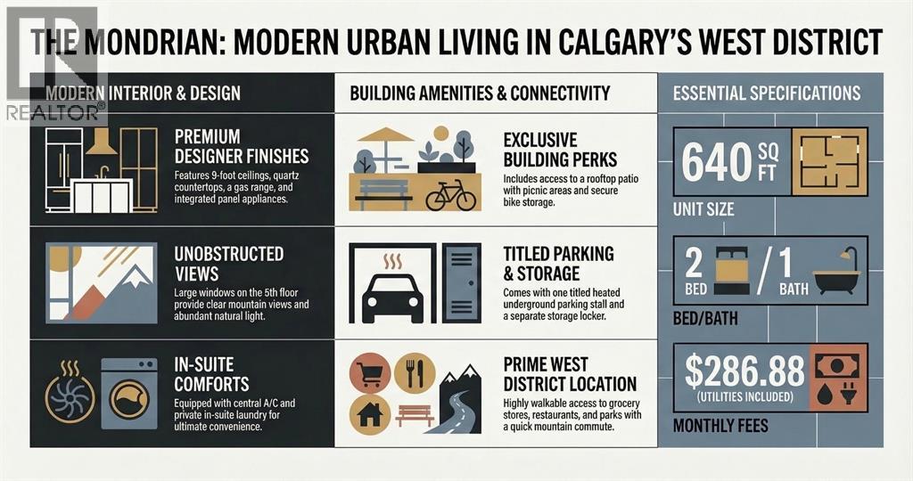 BRAND NEW, NEVER OCCUPIED 2-BEDROOM unit on the 5TH FLOOR with SUNSET AND MOUNTAIN VIEWS and WINDOWS NOT FACING OTHER BUILDINGS, offering added privacy and natural light. Bright and open layout with LARGE WINDOWS, 9-FT CEILINGS, and MODERN WINDOW COVERINGS throughout.Contemporary kitchen with QUARTZ COUNTERTOPS, GAS RANGE, and PANEL FRIDGE. Includes CENTRAL A/C, IN-SUITE LAUNDRY, TITLED HEATED UNDERGROUND PARKING, SEPARATE STORAGE UNIT, and BIKE STORAGE.Enjoy LOW CONDO FEES (UTILITIES INCLUDED EXCEPT ELECTRICITY), CLEAN WIDE HALLWAYS, and a ROOFTOP PATIO WITH PICNIC AREA. Located in WEST DISTRICT with WALKING DISTANCE TO RESTAURANTS, GROCERY STORES, AND PARKS, QUICK COMMUTE TO DOWNTOWN, and EASY ACCESS TO BANFF, BRAGG CREEK, AND THE MOUNTAINS. (id:63190)