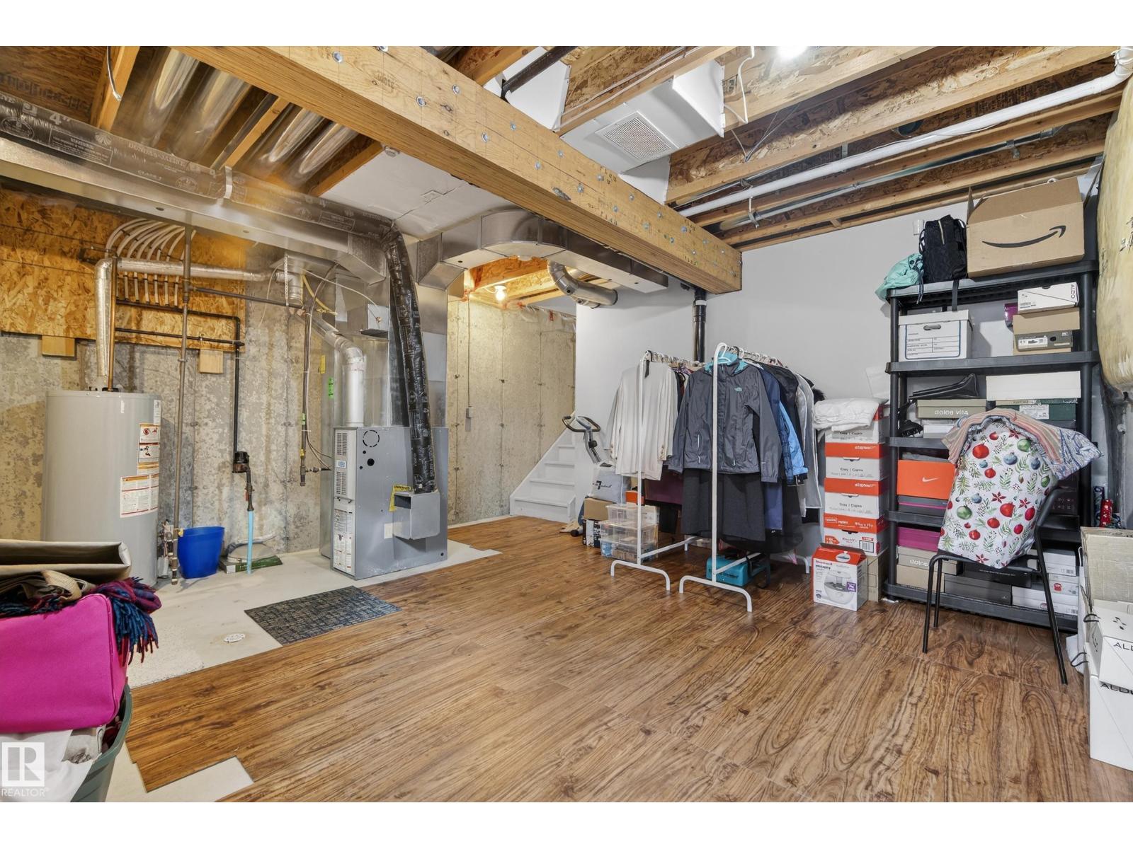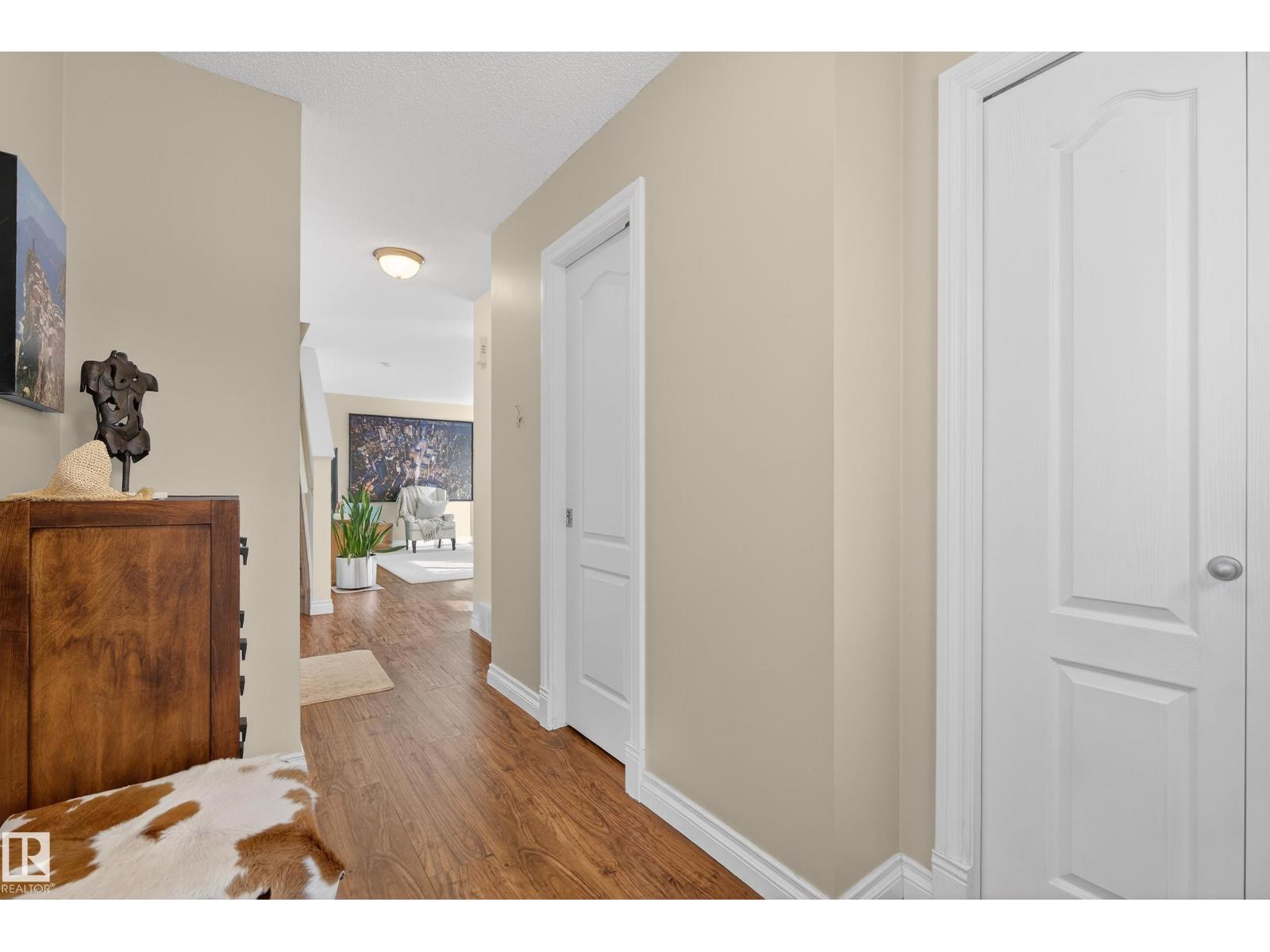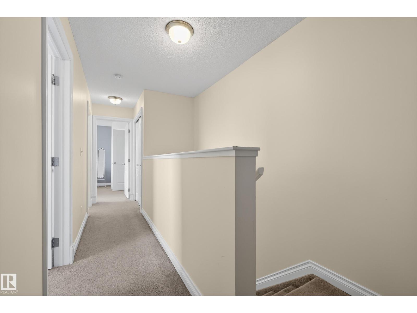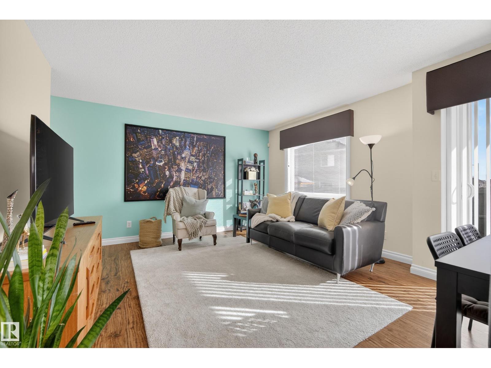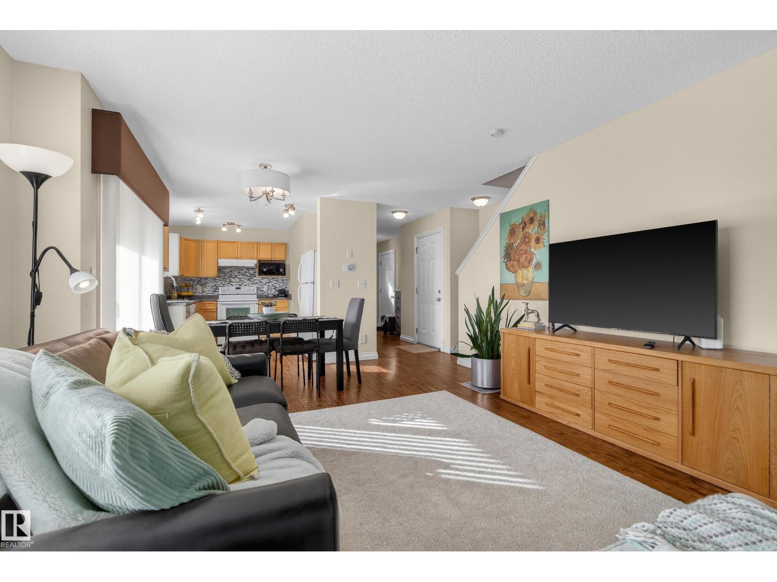 SERENE END-UNIT WITH UNBEATABLE VIEWS. Experience one of the best locations in Rutherford! This charming end-unit townhouse offers the rare luxury of backing directly onto a lush green space and scenic walking trails. The main floor features an inviting open-concept layout with durable vinyl flooring and large windows that bathe the home in natural light. Step through the sliding patio doors to your private outdoor space, the perfect spot for morning coffee overlooking the green backyard space. The functional kitchen and dining area provide a cozy heart to the home, while the upper level houses a spacious primary suite with a walk-in closet, a well-sized second bedroom, and convenient laundry. A true standout feature is the unfinished basement: featuring a large window and an open layout, it is a hidden gem ready to be finished into an additional bedroom or a bright family room. Complete with a garage and parking pad. Close to schools, shopping, and the Henday. Welcome home! (id:63190)