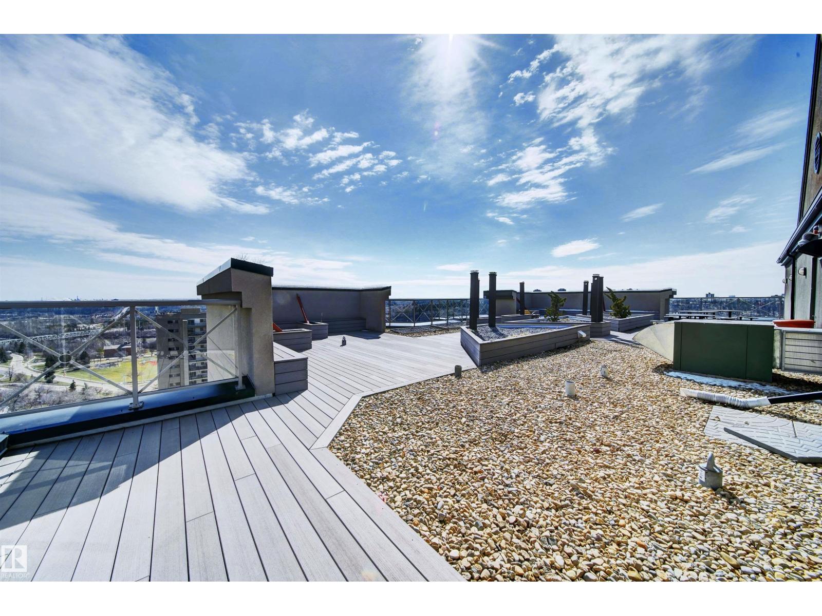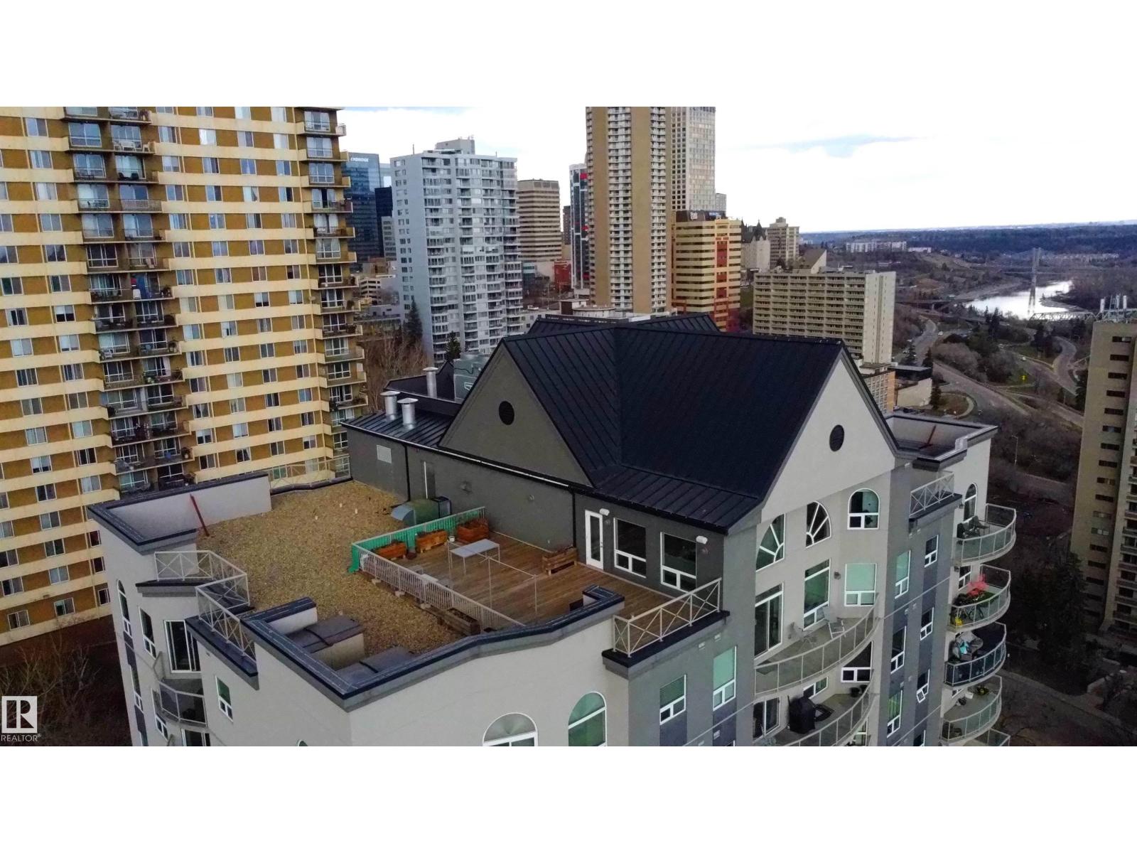 Experience downtown living at its finest in this stunning 1,252 sq. ft. high-rise condo with southwest views of Edmonton’s skyline and river valley. This 2 bedroom, 2 bathroom home offers soaring 10 ft ceilings, central air conditioning, rich hardwood, and ceramic tile flooring that create an open and inviting feel. The spacious living room, dining area, and kitchen are filled with natural light from the large windows, making it perfect for both relaxing and entertaining. The primary suite is a true retreat with a walk-in closet, a 4-piece ensuite, and direct access to a private balcony where you can unwind and take in the views. A second bedroom and another full 4-piece bath add comfort and convenience for guests. Step outside your unit and enjoy the rooftop terrace with plenty of space for summer gatherings or quiet evenings under the stars. Just minutes from Victoria Golf Course, the river valley, and shopping along Jasper Avenue, this condo offers not just a home but an exceptional downtown lifestyle. (id:63190)