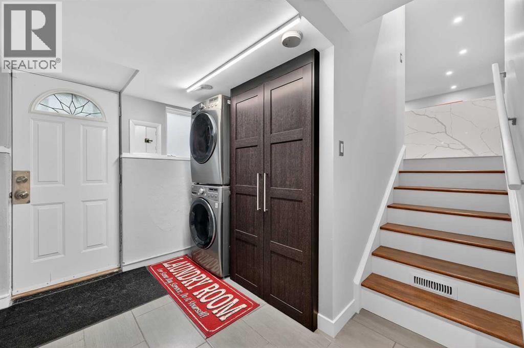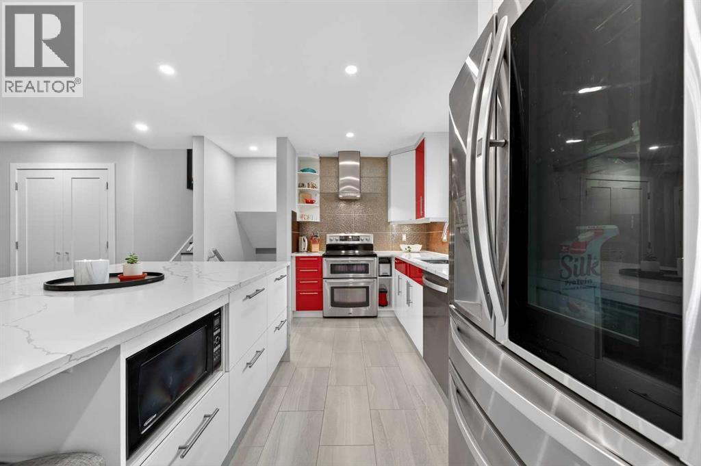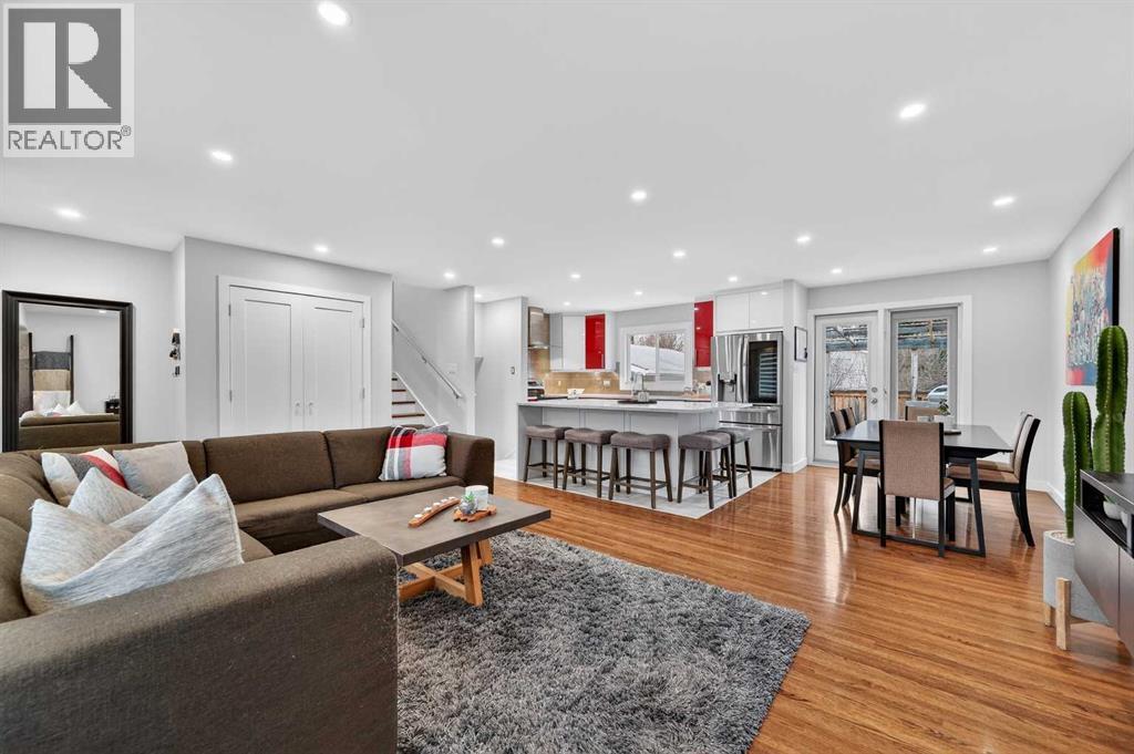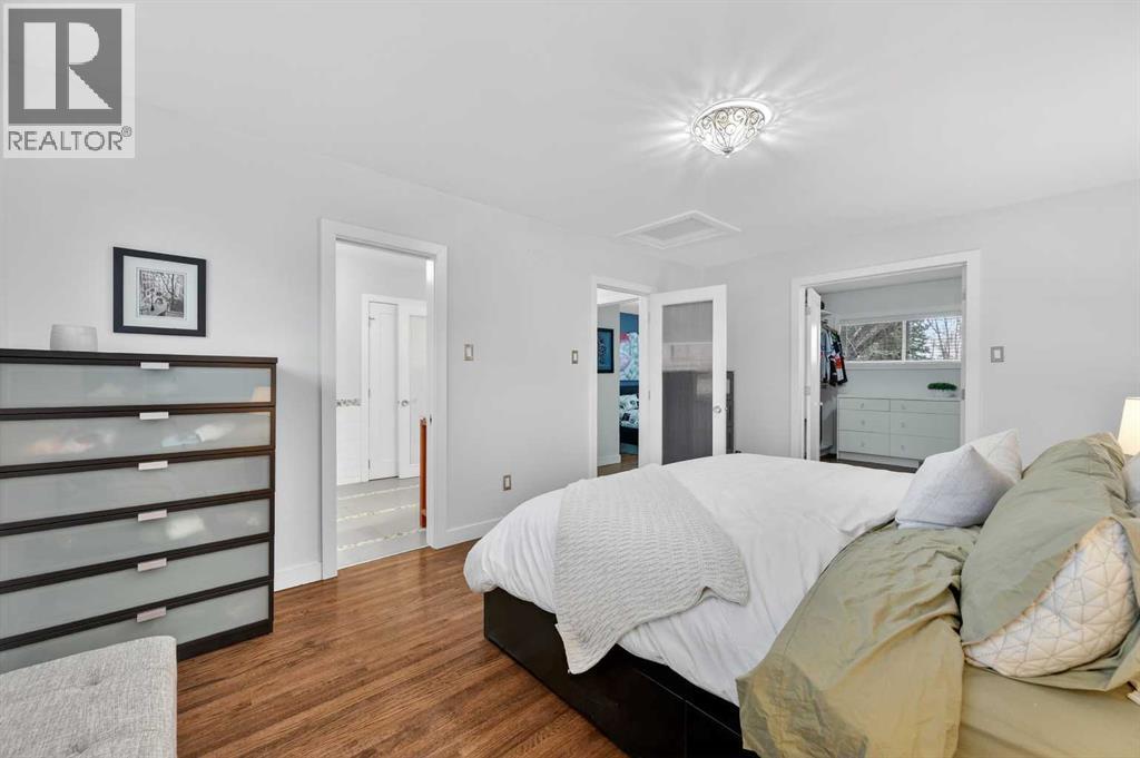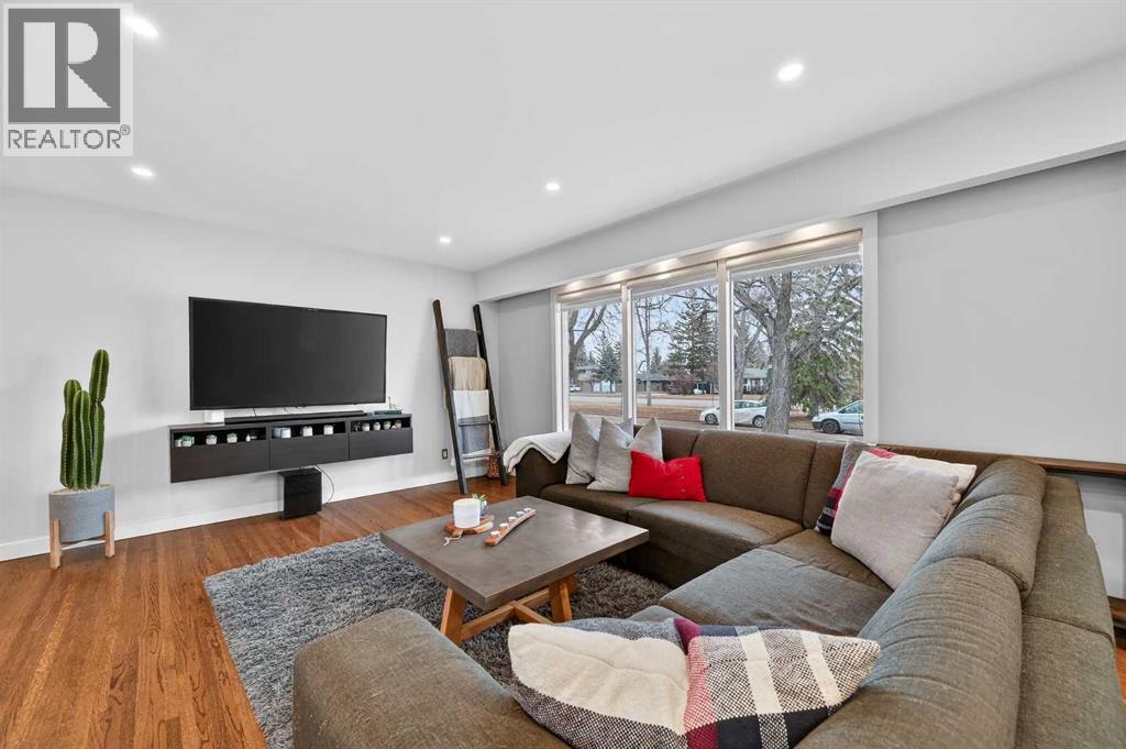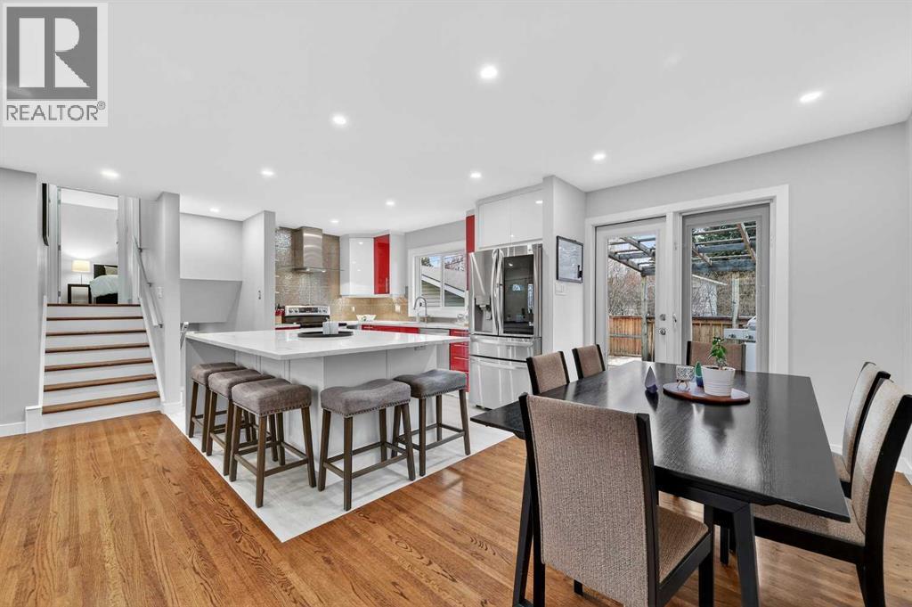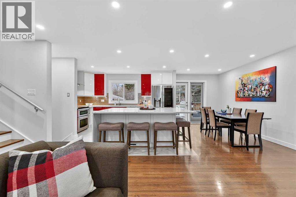 Beautifully maintained home in sought-after Chinook Park, ideally positioned across the boulevard from Elbow Drive with green space directly in front! This thoughtfully updated home features a bright, open-concept main level with rich oak hardwood floors and large windows that flood the space with natural light. The modern kitchen is a true showstopper with sleek cabinetry, quartz countertops, stainless steel appliances, and a large central island that seamlessly connects to the dining area. French doors allow access to a sunny west-facing deck and spacious backyard, perfect for indoor-outdoor living. Upstairs offers a spacious primary retreat with an impressive walk-in closet and room for a full bedroom suite, along with an additional bedroom and a bathroom featuring a luxury oversized walk-in shower with dual showerheads, designer finishes and a large linen closet. The third level provides flexibility with an additional bedroom or office, a fully renovated bathroom with a luxury shower, plus a convenient laundry and mudroom with direct access to the attached garage. The fully renovated lower level adds versatility with a stylish family room and custom wet bar, ideal for entertaining or movie nights. Additional highlights include an attached single garage plus an oversized double detached garage, brand new roof, contemporary finishes throughout, and a large private yard with mature landscaping and upper deck, all located close to top schools, parks, shopping, and transit in one of Calgary’s most desirable communities. (id:63190)