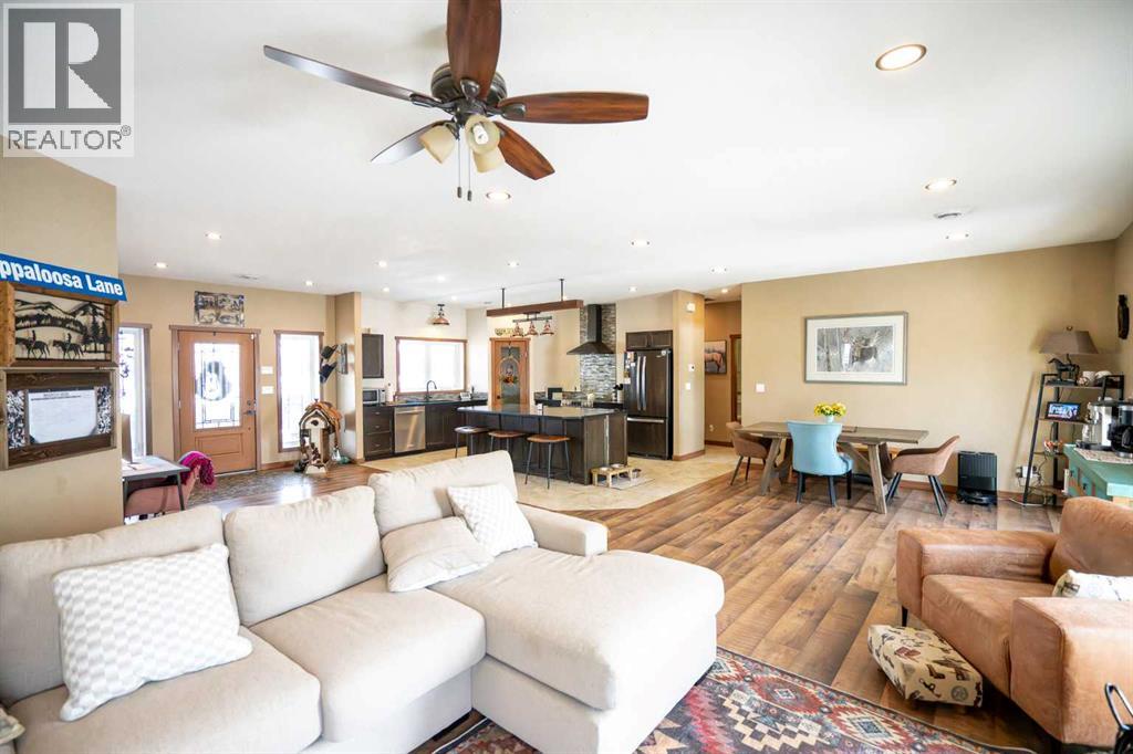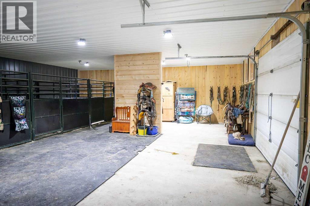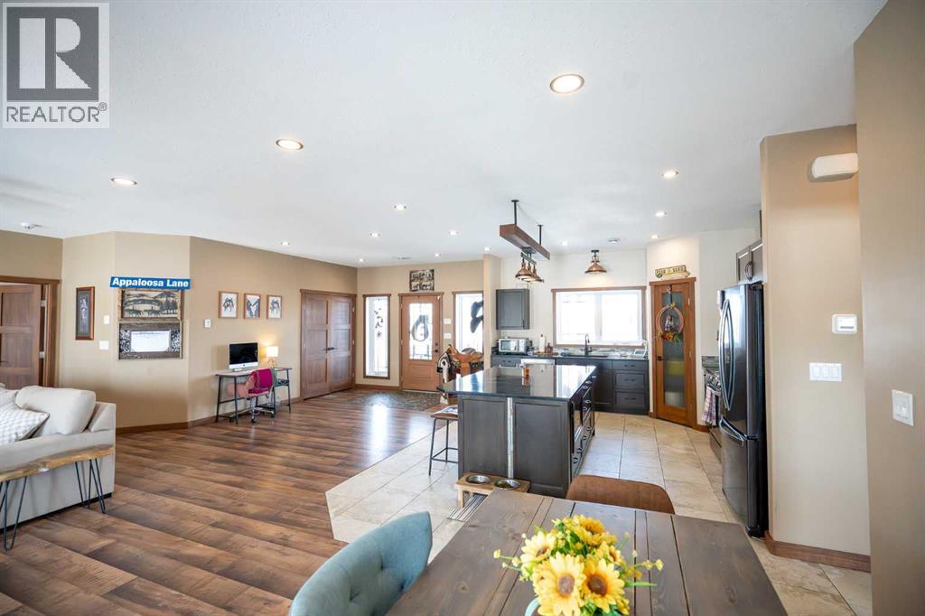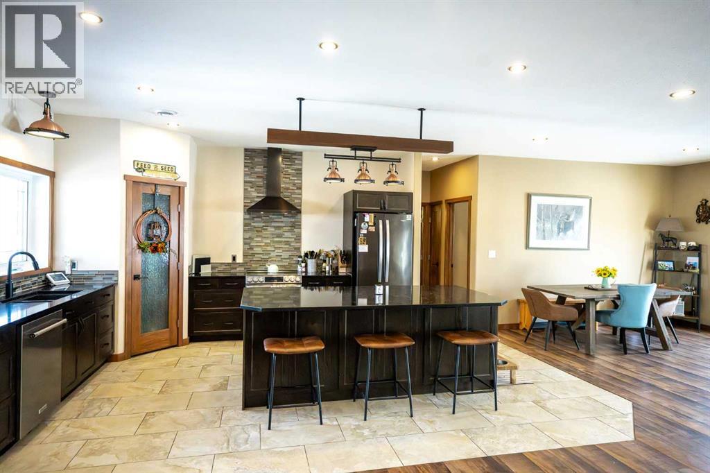 Your rustic paradise in the heart of a thriving ranching and rodeo community—where country living meets serious equestrian function. NEW fencing & a massive steel-railed sand arena (135' x 300') awaits you, built for riders who want space, durability & performance. This charming, quality ranch-style bungalow offers 1,700+ sq ft with 2 bedrooms & 2 full baths, enjoys cosy In-floor heat.. Inside, you’ll find a warm, rustic aesthetic with hemlock doors, stone floor foyer, and an open-concept layout. The chef’s kitchen features a large island, quartz countertops, custom cabinetry & a walk-in pantry, flowing into a living room with a cozy gas fireplace. The primary suite is a Top Shelf standout, with a 5-piece ensuite including a unique Copper tub, custom stone shower, and barnwood-style finishes—plus direct access to laundry and a spacious walk-in closet. Outside, it’s fully equipped: Attached triple garage with In-floor heat, a 40' x 55 x 16 (14ft door)' Shop with office, 2 pc Bthrm, and an attached 40' x 56' barn with box stalls, all with concrete floor—steps from your Arena & expansive pasture. Just 10 mins to Rimbey & its beautiful AG Facility for indoor riding, this is turnkey country living is built for the equestrian lifestyle. (id:63190)
