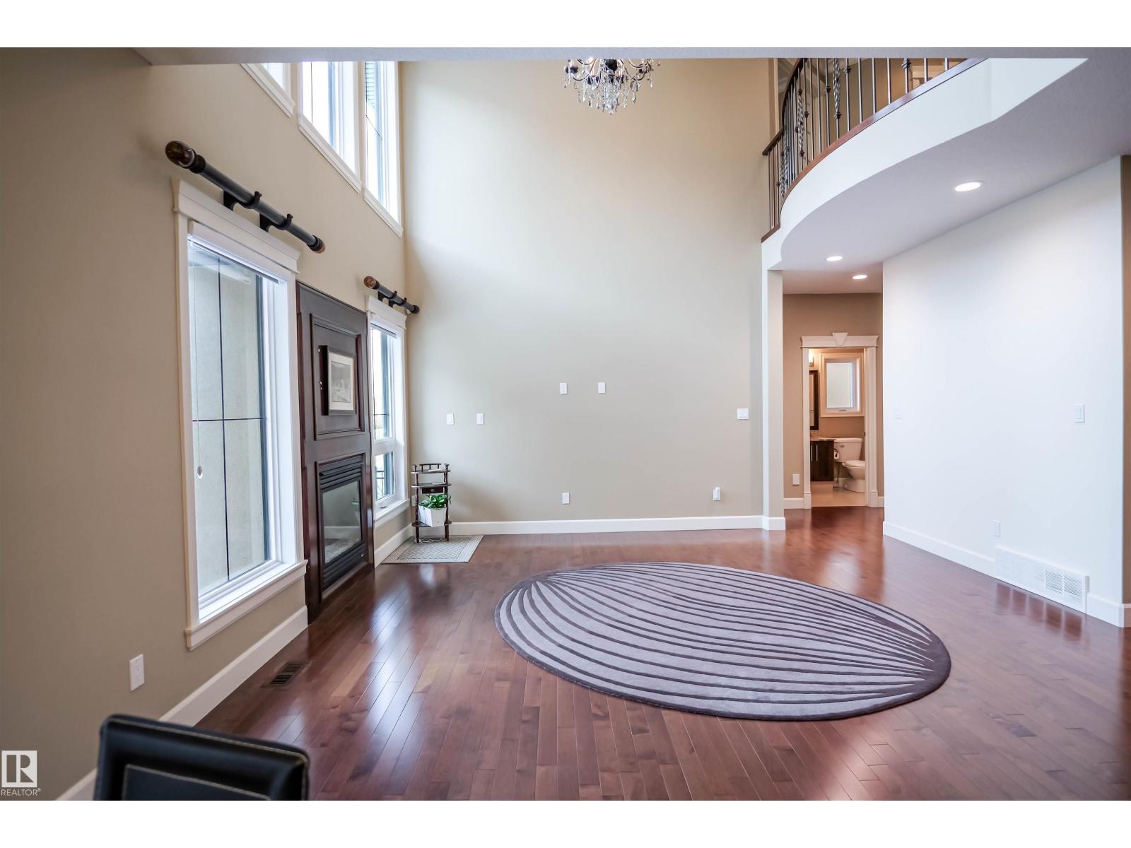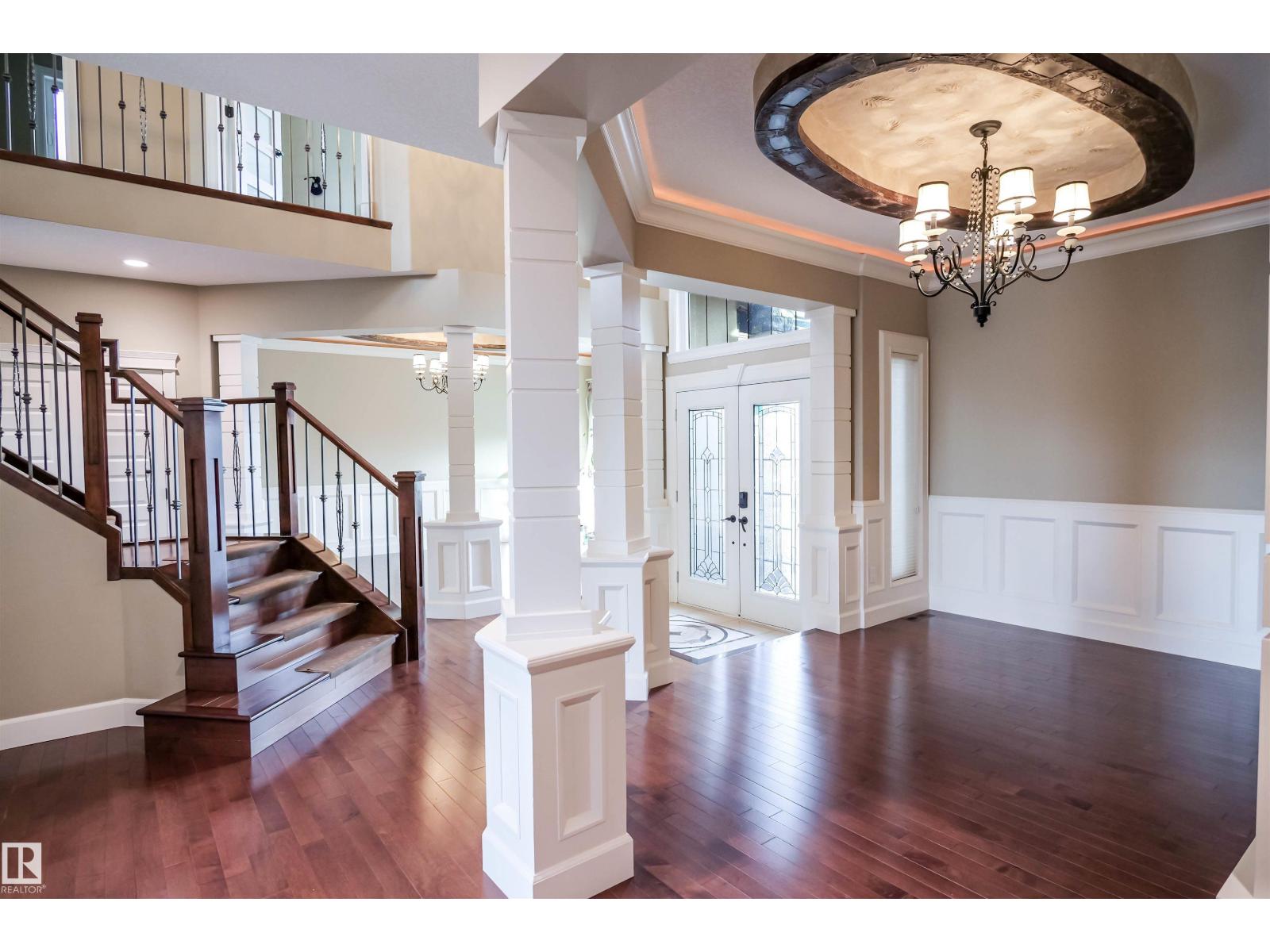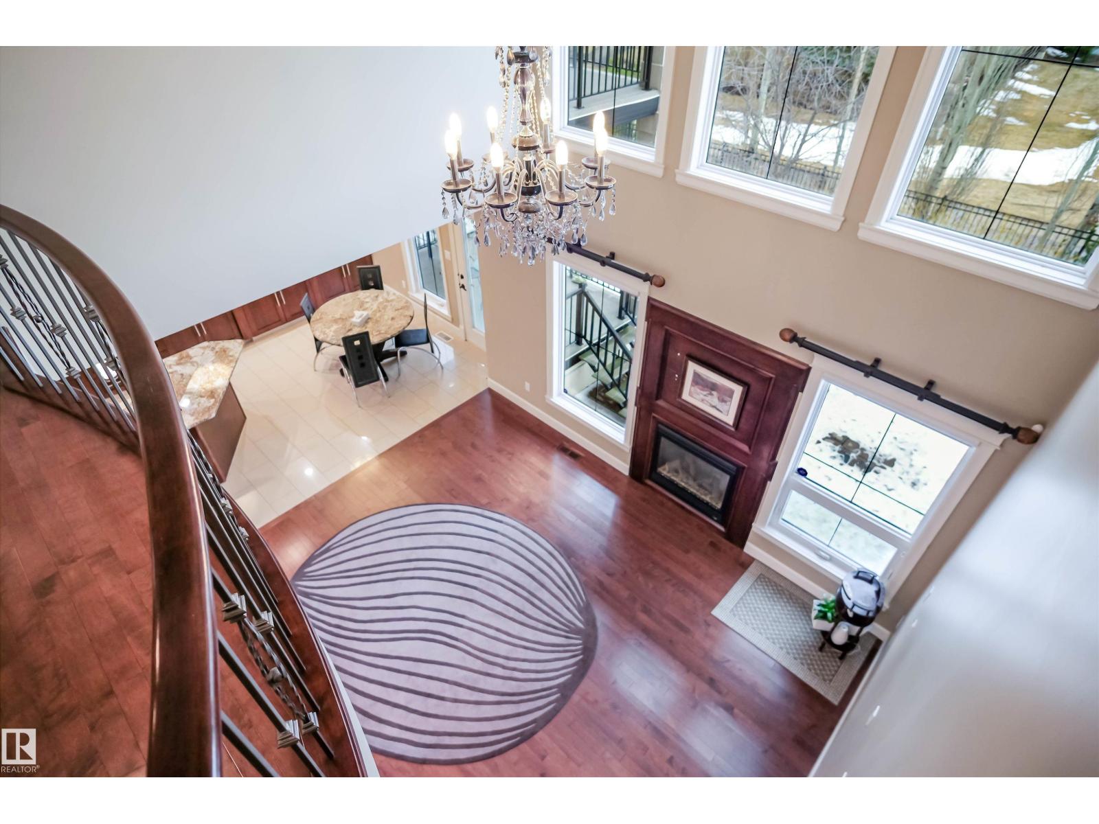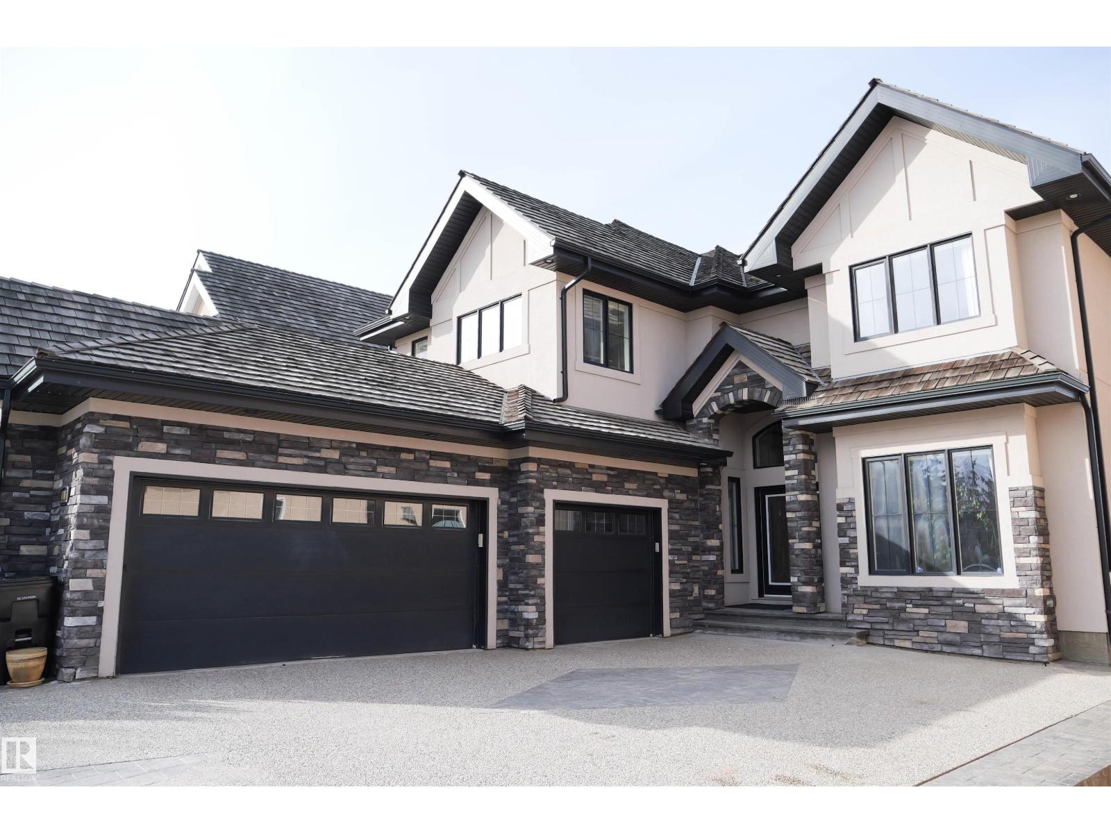 Sunny with stunning water view at Mactaggart! This FAMILY HOME offers 3 levels of upscale living, a TRIPLE garage, and a fenced yard in one of Edmonton’s most prestigious communities. Step inside to soaring 24’ coffered ceilings, grand double doors, and high-end finishes throughout. The gourmet kitchen features built-in appliances, granite countertops, a massive island, and a separate spice kitchen. Enjoy breathtaking views from the family room, highlighted by a statement fireplace and large windows. Main floor includes a bedroom and full 4pc bath, ideal for guests or extended family. Upstairs offers 4 spacious bedrooms and 3 full baths. The primary retreat boasts a private balcony, fireplace, and spa-inspired 6pc ensuite with walk-in closet. The professionally finished basement features HEATED FLOORS, 2 additional bedrooms, a theatre room wired for 7.1 surround sound, wet bar, wine room, gym area, and full bath. Exceptional design property with Direct access to scenic walking trails & parks. (id:63190)