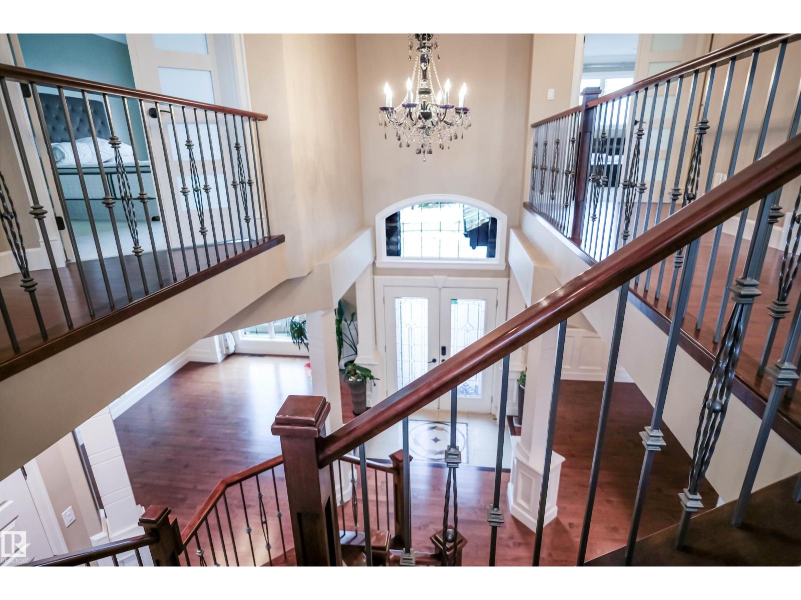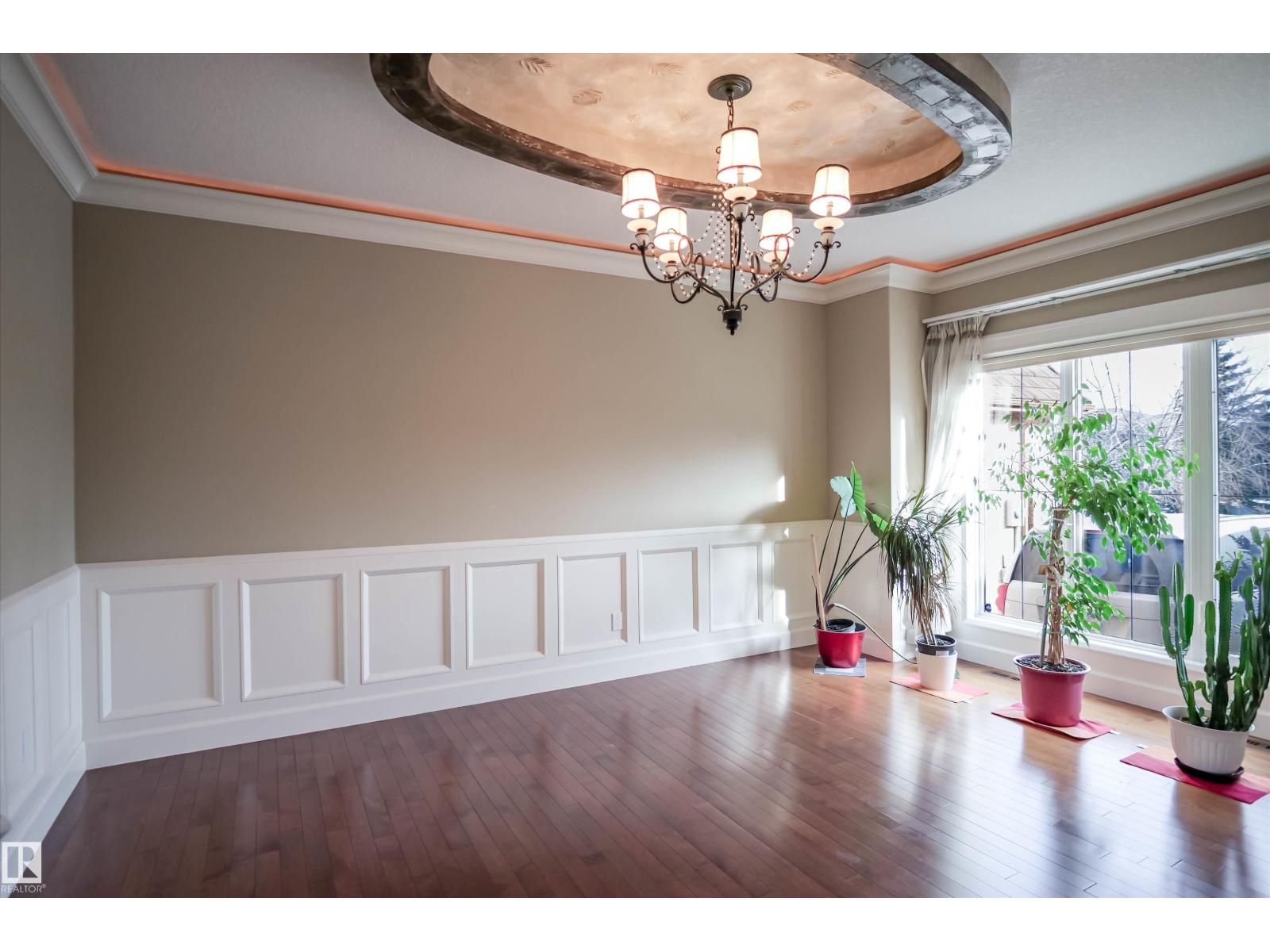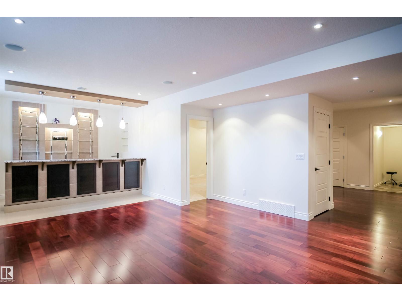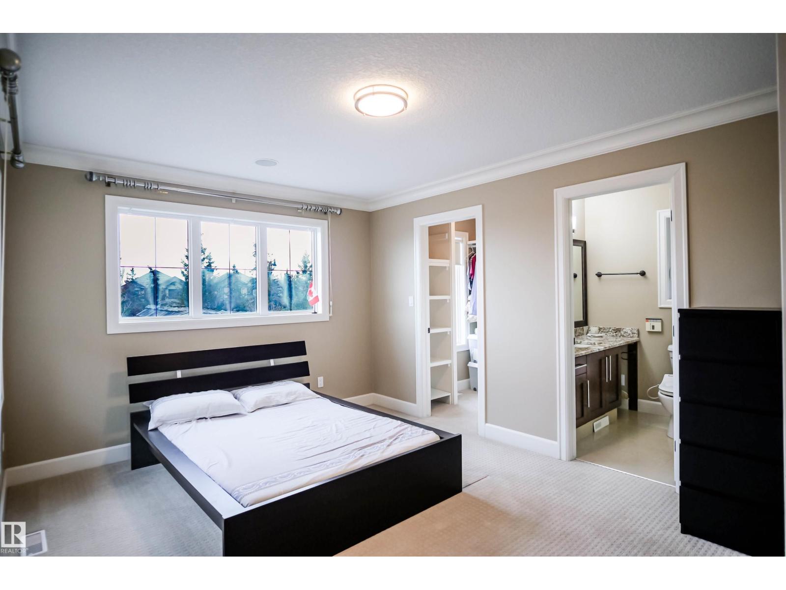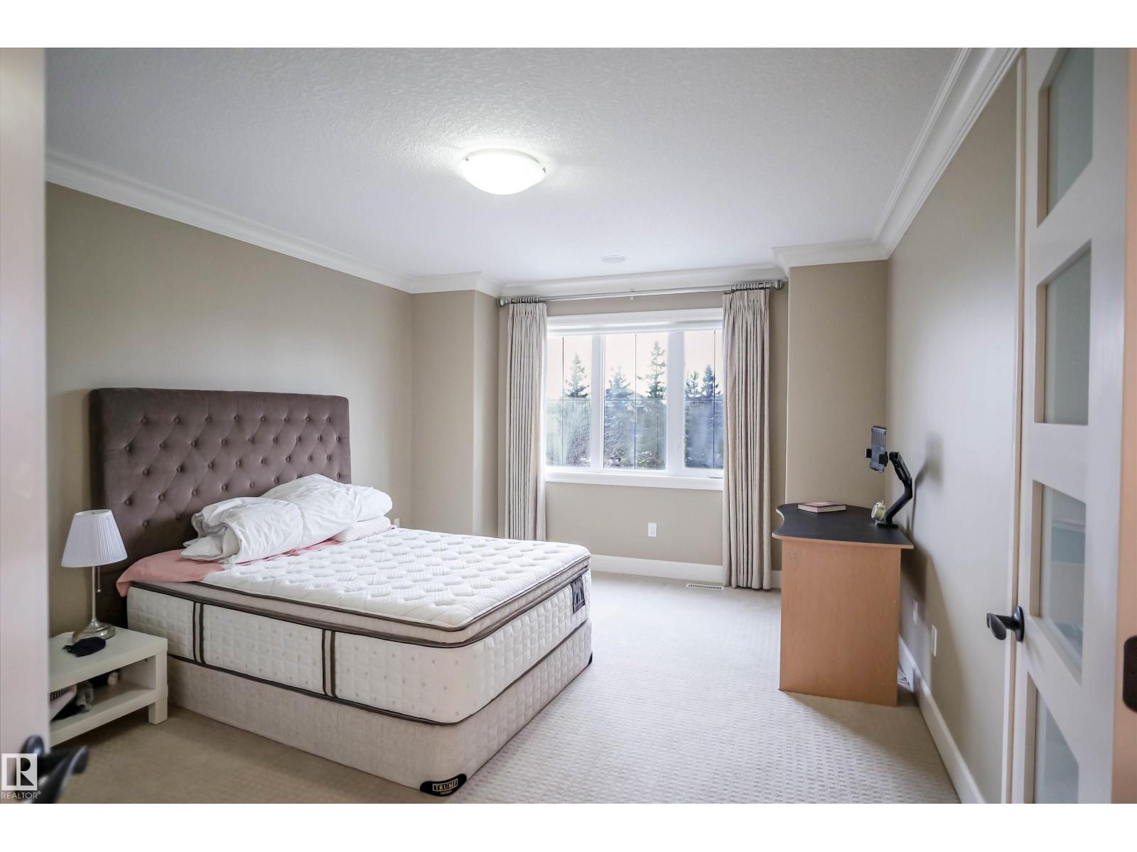 Sunny with stunning water view at Mactaggart! This FAMILY HOME offers 3 levels of upscale living, a TRIPLE garage, and a fenced yard in one of Edmonton’s most prestigious communities. Step inside to soaring 24’ coffered ceilings, grand double doors, and high-end finishes throughout. The gourmet kitchen features built-in appliances, granite countertops, a massive island, and a separate spice kitchen. Enjoy breathtaking views from the family room, highlighted by a statement fireplace and large windows. Main floor includes a bedroom and full 4pc bath, ideal for guests or extended family. Upstairs offers 4 spacious bedrooms and 3 full baths. The primary retreat boasts a private balcony, fireplace, and spa-inspired 6pc ensuite with walk-in closet. The professionally finished basement features HEATED FLOORS, 2 additional bedrooms, a theatre room wired for 7.1 surround sound, wet bar, wine room, gym area, and full bath. Exceptional design property with Direct access to scenic walking trails & parks. (id:63190)