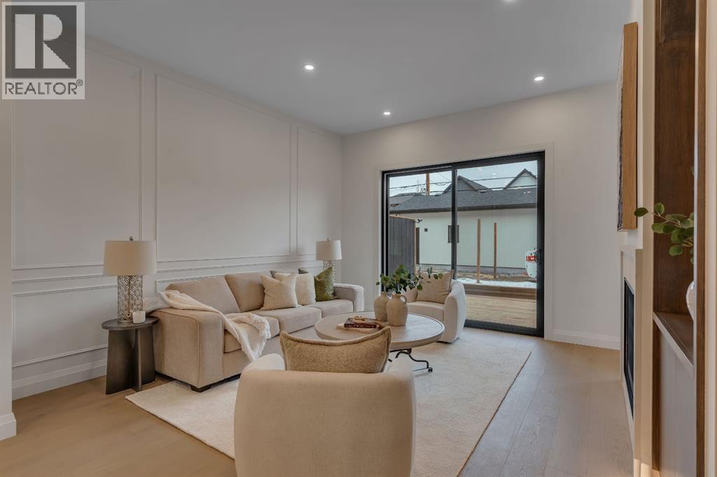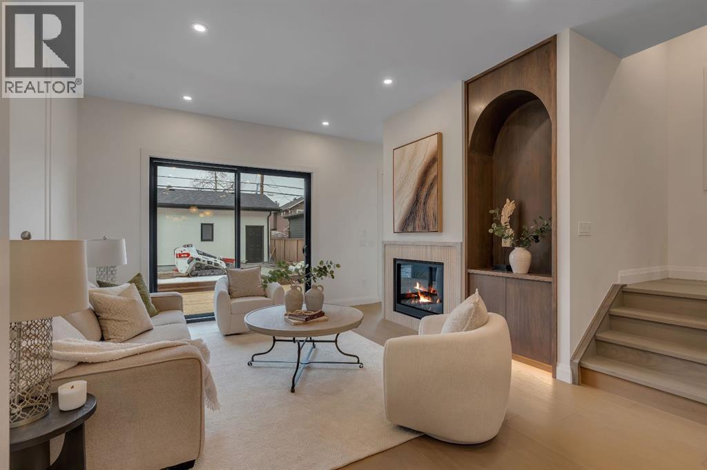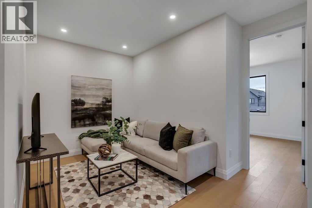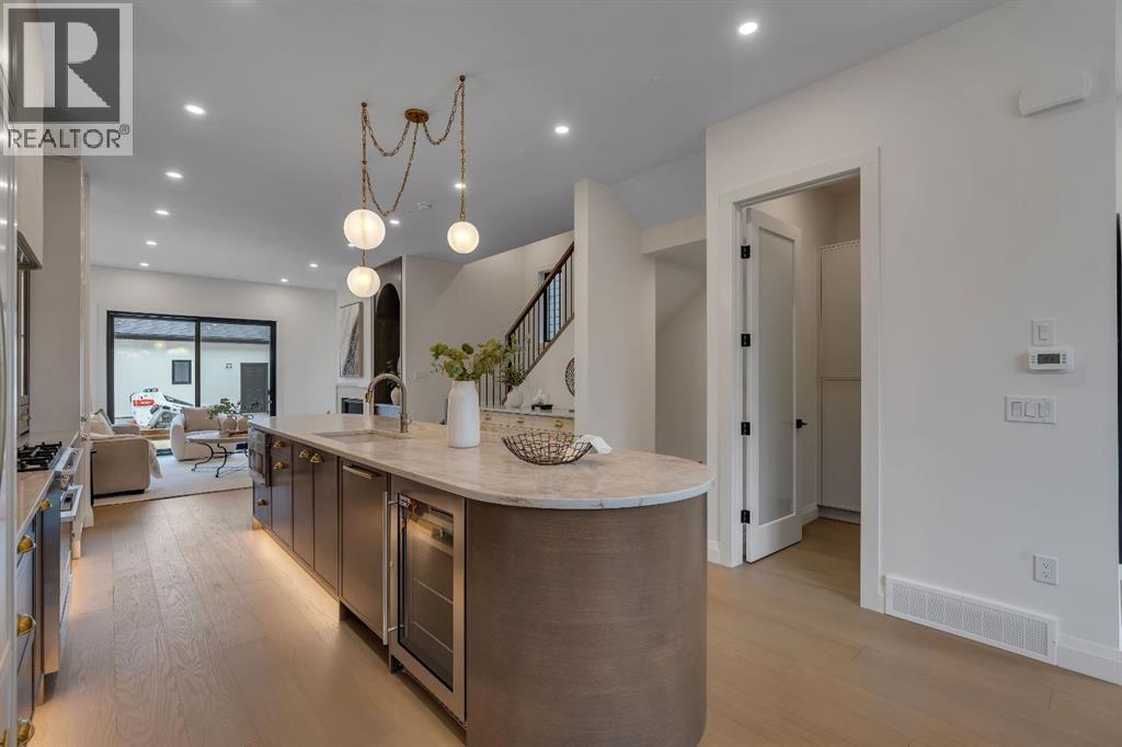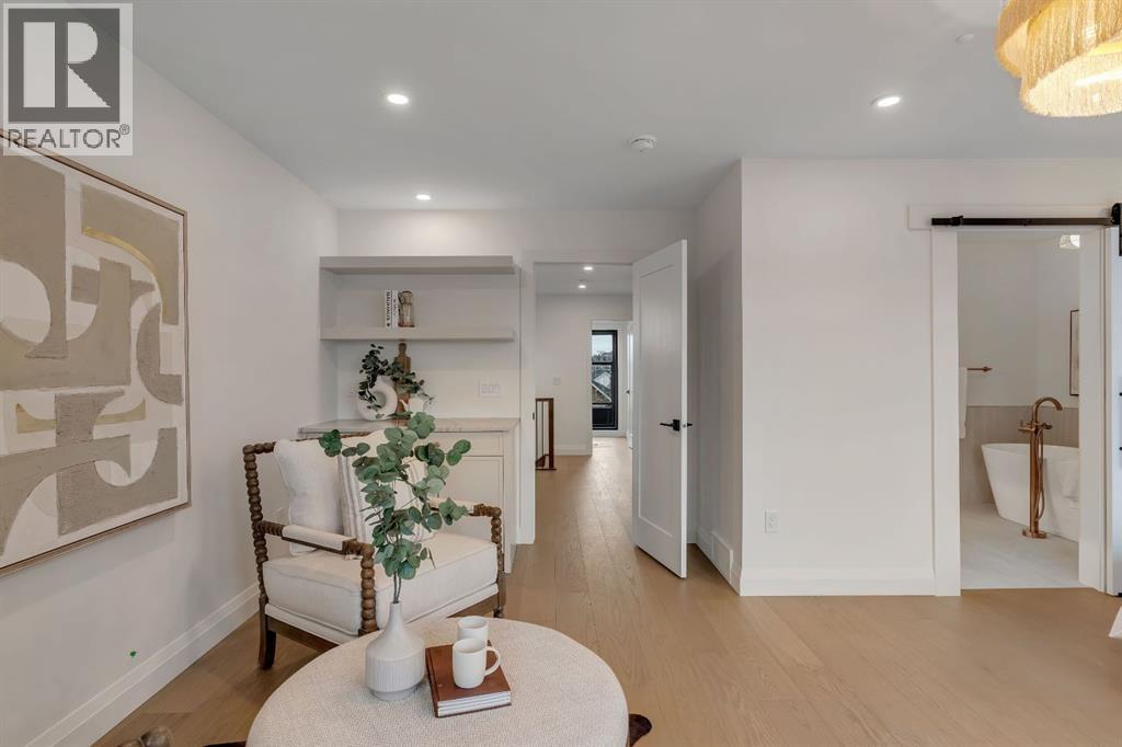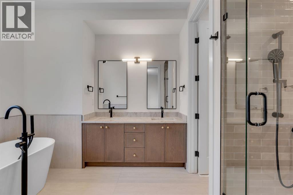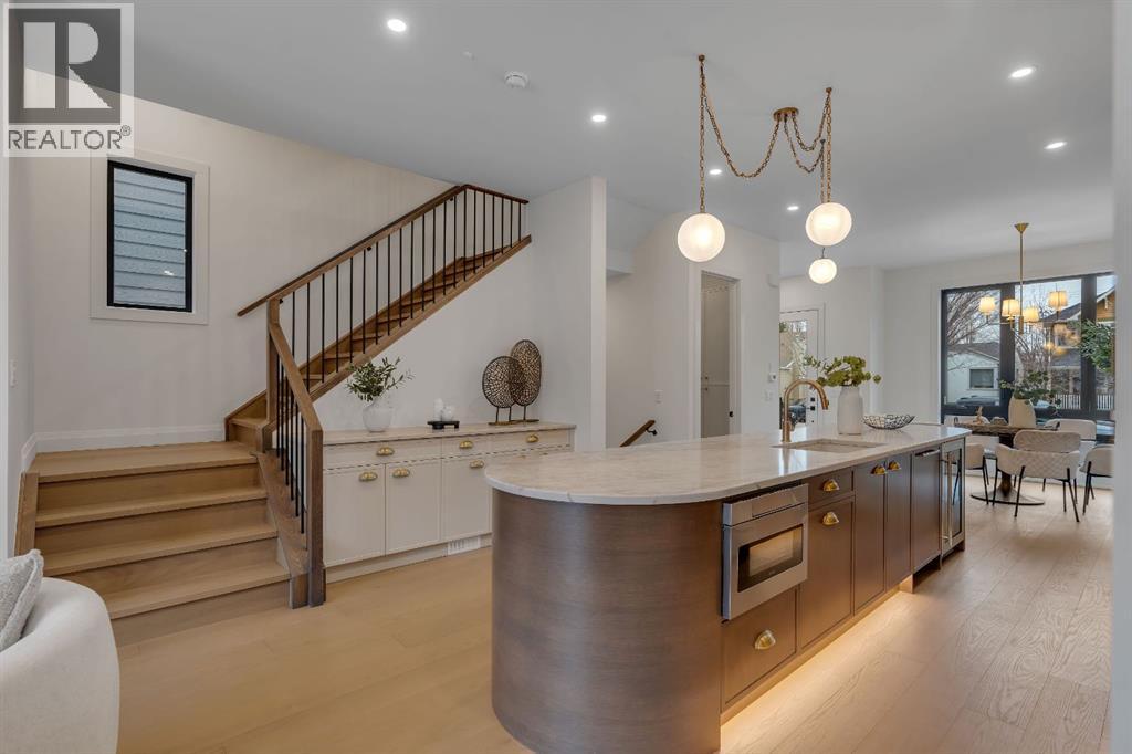 Unit 2 is sold with only Unit 1 remaining, presenting a rare opportunity to own a brand new exceptional three storey semi detached infill offering a total of over 3,700 sqft of thoughtfully curated living space across four levels in the sought after West Hillhurst. This residence showcases elevated inner city living with impeccable craftsmanship and refined contemporary design, highlighted by wide plank hardwood flooring and striking custom oak detailing throughout. The open concept main floor is defined by 10 foot ceilings and a formal dining area with custom wainscoting and large south facing windows that fill the space with natural light, while the kitchen stands out as a true centrepiece with a dramatic 12 foot curved oak island, quartz countertops and backsplash, premium built in appliances, gold and black hardware, two tone cabinetry, a plaster finished curved hood fan, gold pot filler, and under cabinet lighting, complemented by a thoughtfully concealed walk in pantry with custom cabinetry. The living room offers a warm yet sophisticated atmosphere with a designer gas fireplace featuring fluted tile, quartz accents, and curved oak built ins, stepping out to a very large backyard, while a spacious mudroom with built ins leads to a beautifully finished powder room with oak cabinetry, half panelled walls, and under mount lighting. The upper level features two luxurious primary suites, each complete with double oak vanities, freestanding soaker tubs, fully tiled showers, and in-floor heating, along with a versatile bonus room and a full laundry room, all enhanced by carefully selected designer lighting and elegant sconces. The third level loft creates a private retreat with an additional expansive primary bedroom, a large walk in closet with an oak finished island, make-up desk, a spa inspired ensuite with double oak vanity, in-floor heat, and a steam shower, as well as a dedicated office space that opens onto a private balcony with unobstructed downtown views. T he fully developed basement adds further functionality with a generous recreation area, wet bar, fourth bedroom, full bathroom, rough-in for in-floor heat & A/C, and a dedicated home gym, all finished with oversized windows to maximize natural light. Designed by John Trin, this architectural statement home offers a seamless blend of luxury, comfort, and design, ideally located near parks, schools, the river, and everyday amenities. Call today to book your private tour! (id:63190)