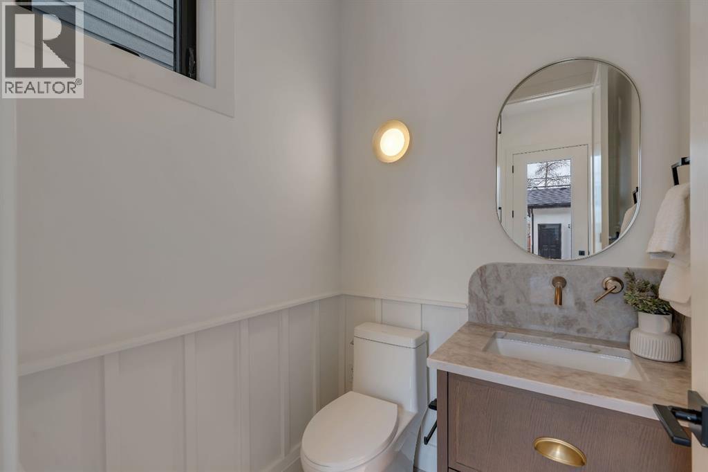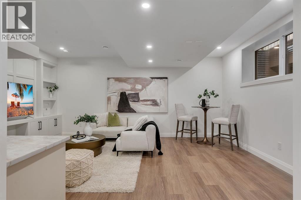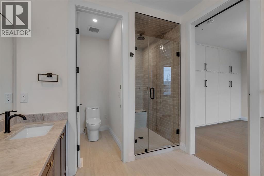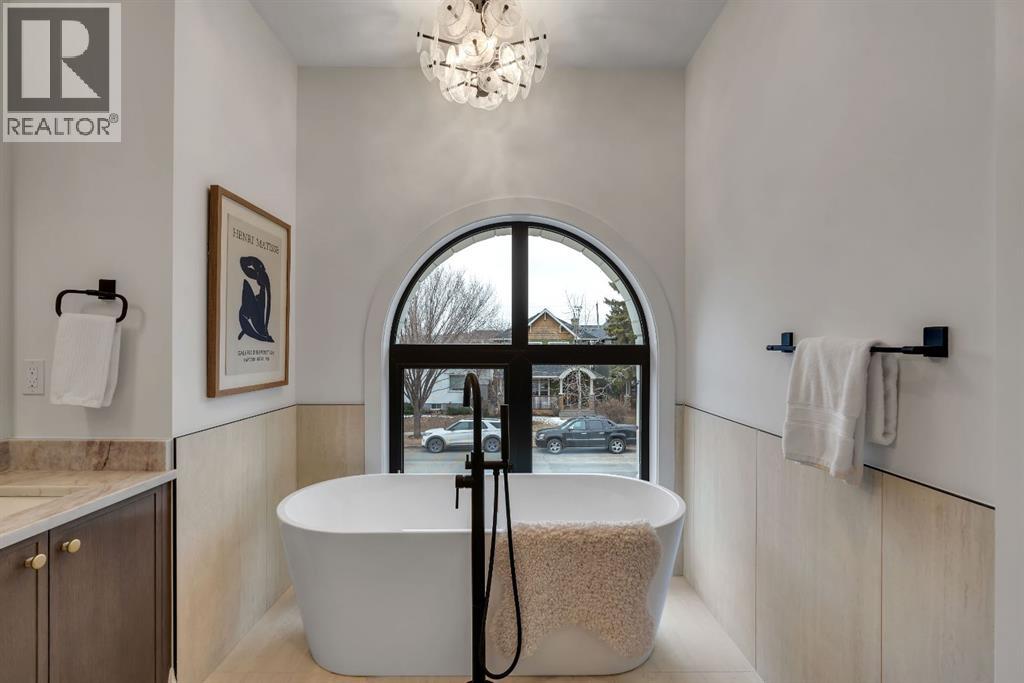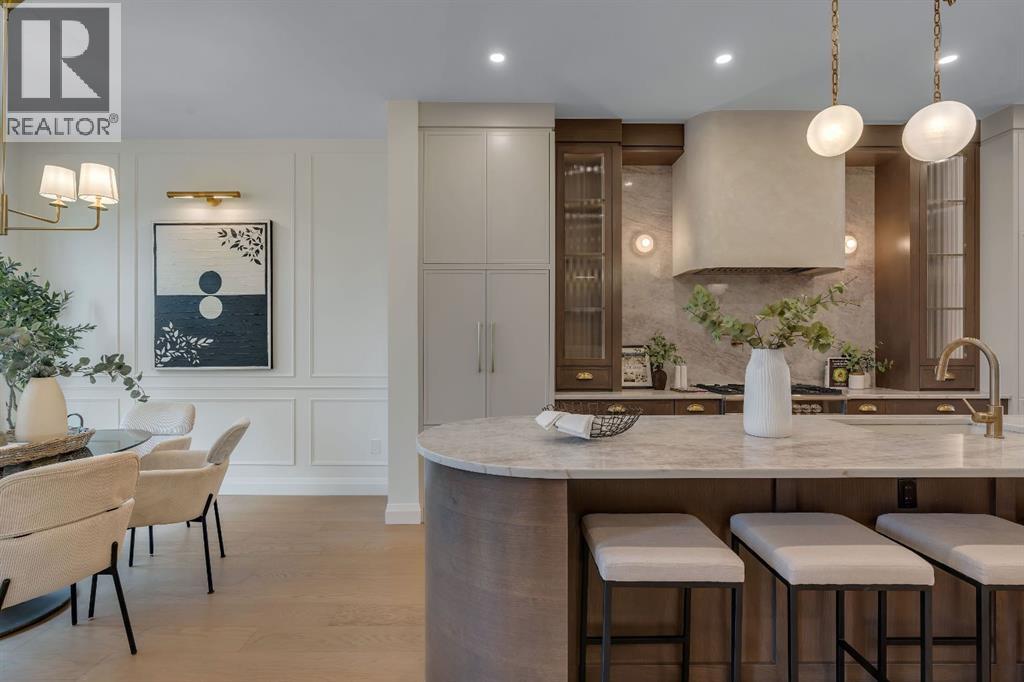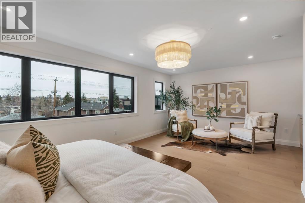 Unit 2 is sold with only Unit 1 remaining, presenting a rare opportunity to own a brand new exceptional three storey semi detached infill offering a total of over 3,700 sqft of thoughtfully curated living space across four levels in the sought after West Hillhurst. This residence showcases elevated inner city living with impeccable craftsmanship and refined contemporary design, highlighted by wide plank hardwood flooring and striking custom oak detailing throughout. The open concept main floor is defined by 10 foot ceilings and a formal dining area with custom wainscoting and large south facing windows that fill the space with natural light, while the kitchen stands out as a true centrepiece with a dramatic 12 foot curved oak island, quartz countertops and backsplash, premium built in appliances, gold and black hardware, two tone cabinetry, a plaster finished curved hood fan, gold pot filler, and under cabinet lighting, complemented by a thoughtfully concealed walk in pantry with custom cabinetry. The living room offers a warm yet sophisticated atmosphere with a designer gas fireplace featuring fluted tile, quartz accents, and curved oak built ins, stepping out to a very large backyard, while a spacious mudroom with built ins leads to a beautifully finished powder room with oak cabinetry, half panelled walls, and under mount lighting. The upper level features two luxurious primary suites, each complete with double oak vanities, freestanding soaker tubs, fully tiled showers, and in-floor heating, along with a versatile bonus room and a full laundry room, all enhanced by carefully selected designer lighting and elegant sconces. The third level loft creates a private retreat with an additional expansive primary bedroom, a large walk in closet with an oak finished island, make-up desk, a spa inspired ensuite with double oak vanity, in-floor heat, and a steam shower, as well as a dedicated office space that opens onto a private balcony with unobstructed downtown views. T he fully developed basement adds further functionality with a generous recreation area, wet bar, fourth bedroom, full bathroom, rough-in for in-floor heat & A/C, and a dedicated home gym, all finished with oversized windows to maximize natural light. Designed by John Trin, this architectural statement home offers a seamless blend of luxury, comfort, and design, ideally located near parks, schools, the river, and everyday amenities. Call today to book your private tour! (id:63190)