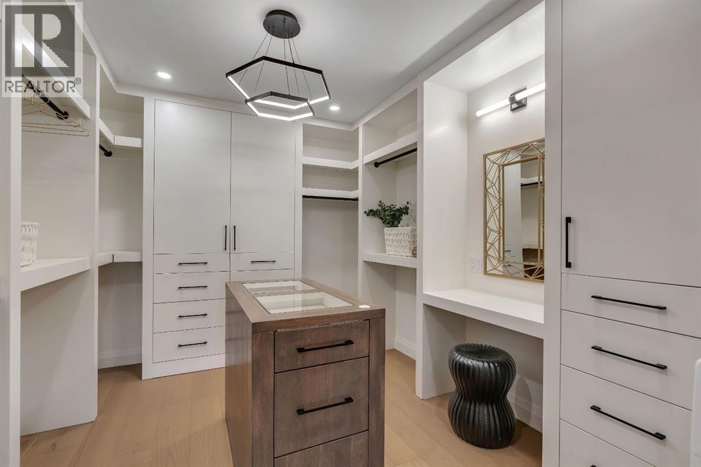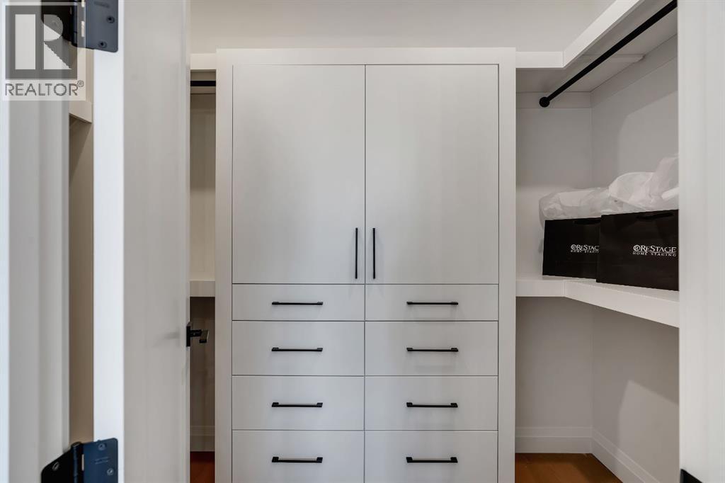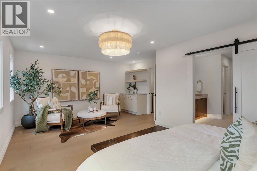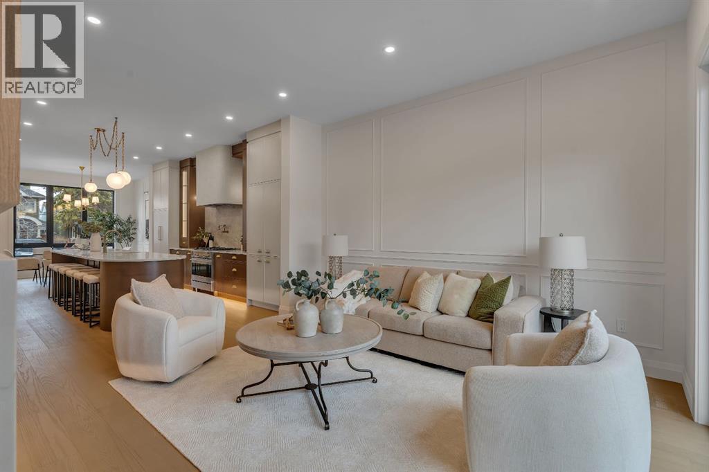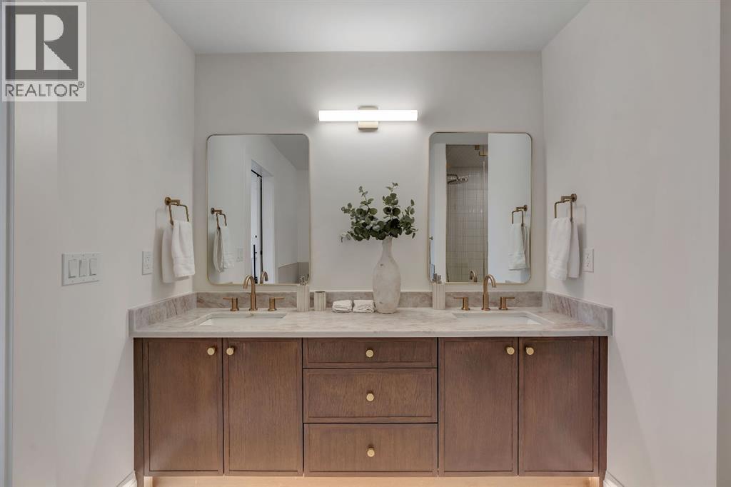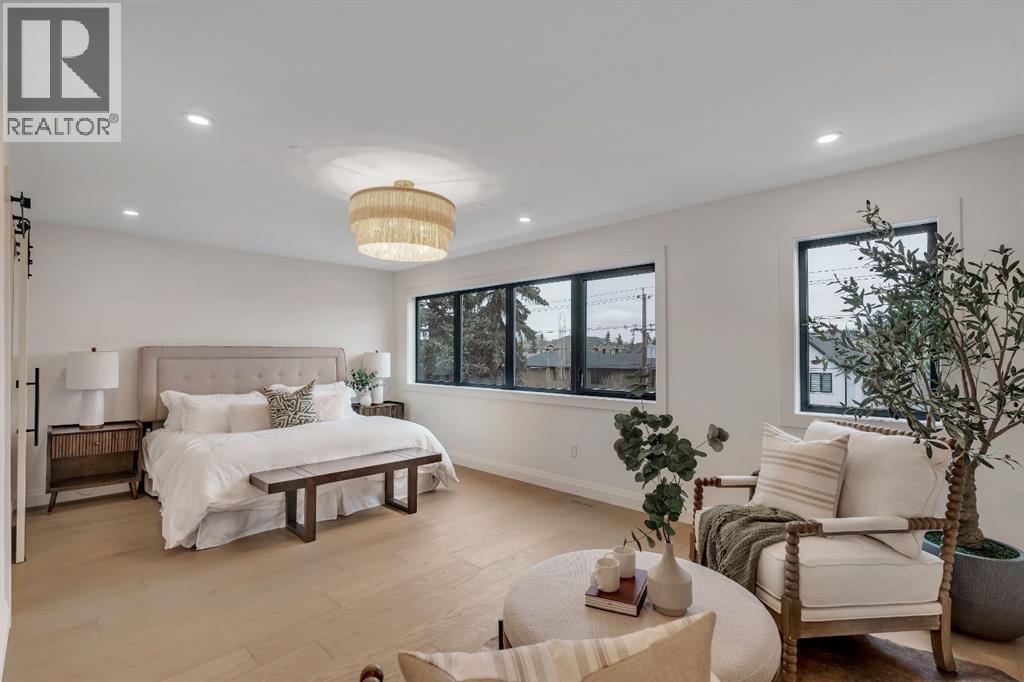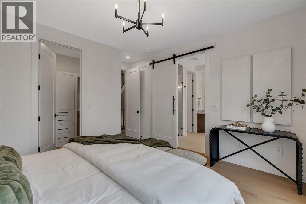 Unit 2 is sold with only Unit 1 remaining, presenting a rare opportunity to own a brand new exceptional three storey semi detached infill offering a total of over 3,700 sqft of thoughtfully curated living space across four levels in the sought after West Hillhurst. This residence showcases elevated inner city living with impeccable craftsmanship and refined contemporary design, highlighted by wide plank hardwood flooring and striking custom oak detailing throughout. The open concept main floor is defined by 10 foot ceilings and a formal dining area with custom wainscoting and large south facing windows that fill the space with natural light, while the kitchen stands out as a true centrepiece with a dramatic 12 foot curved oak island, quartz countertops and backsplash, premium built in appliances, gold and black hardware, two tone cabinetry, a plaster finished curved hood fan, gold pot filler, and under cabinet lighting, complemented by a thoughtfully concealed walk in pantry with custom cabinetry. The living room offers a warm yet sophisticated atmosphere with a designer gas fireplace featuring fluted tile, quartz accents, and curved oak built ins, stepping out to a very large backyard, while a spacious mudroom with built ins leads to a beautifully finished powder room with oak cabinetry, half panelled walls, and under mount lighting. The upper level features two luxurious primary suites, each complete with double oak vanities, freestanding soaker tubs, fully tiled showers, and in-floor heating, along with a versatile bonus room and a full laundry room, all enhanced by carefully selected designer lighting and elegant sconces. The third level loft creates a private retreat with an additional expansive primary bedroom, a large walk in closet with an oak finished island, make-up desk, a spa inspired ensuite with double oak vanity, in-floor heat, and a steam shower, as well as a dedicated office space that opens onto a private balcony with unobstructed downtown views. T he fully developed basement adds further functionality with a generous recreation area, wet bar, fourth bedroom, full bathroom, rough-in for in-floor heat & A/C, and a dedicated home gym, all finished with oversized windows to maximize natural light. Designed by John Trin, this architectural statement home offers a seamless blend of luxury, comfort, and design, ideally located near parks, schools, the river, and everyday amenities. Call today to book your private tour! (id:63190)