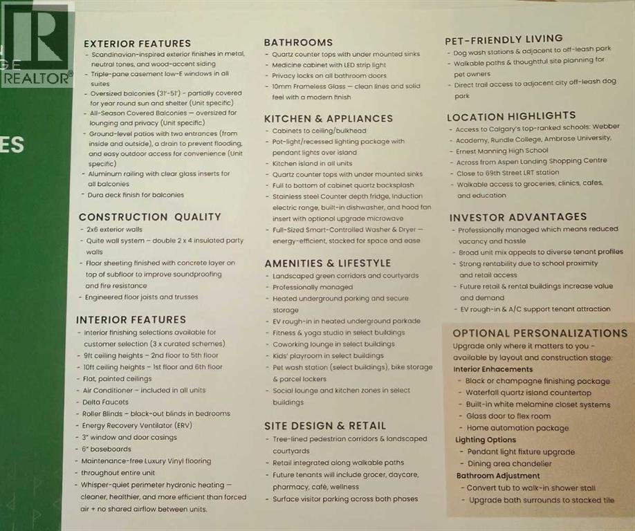 Welcome to Aspen Village by Vesta Properties! This is modern urban living in a thoughtfully designed 2-bedroom residence offering exceptional functionality, contemporary finishes, and a vibrant lifestyle setting. Featuring an open-concept layout, this home combines comfort and style with a spacious living area and designer kitchen ideal for both everyday living and entertaining. The sleek kitchen showcases quartz countertops, full-height cabinetry, under-mount sinks, and a large central island with pendant lighting. Energy-efficient stainless-steel appliances and a rare oversized in-suite laundry and storage room provide exceptional practicality and modern convenience. Two well-proportioned bedrooms offer flexibility for guests, a home office, or family living, while the elegant bathroom features clean modern detailing, quartz surfaces, and timeless fixtures. Durable luxury vinyl plank flooring flows throughout, complemented by curated interior palettes and contemporary ceiling finishes. Enjoy outdoor relaxation on your private balcony. Built with quality construction standards including triple-pane windows, engineered floor systems, and enhanced soundproofing, this home offers comfort, quiet, and energy efficiency. Residents will have the opportunity to join the members-only Aspen Club, a private amenity hub featuring collaborative workspaces, lounge areas, a state-of-the-art fitness centre and spin studio, yoga and games rooms, and beautifully designed rooftop gathering spaces. Aspen Village will also feature an Urban Village with over 60,000 sq. ft. of planned retail and services, offering pedestrian-friendly streets lined with boutique shopping, cafés, dining, wellness studios, daycare, medical services, and everyday conveniences—creating a vibrant and connected community atmosphere. Ideally positioned close to transit, parks, shopping, and key lifestyle amenities, this residence presents an exceptional opportunity for first-time buyers, downsizers, or investors seeking long-term value in one of Calgary’s most exciting emerging communities. Anticipated possession is scheduled for 2027. (id:63190)