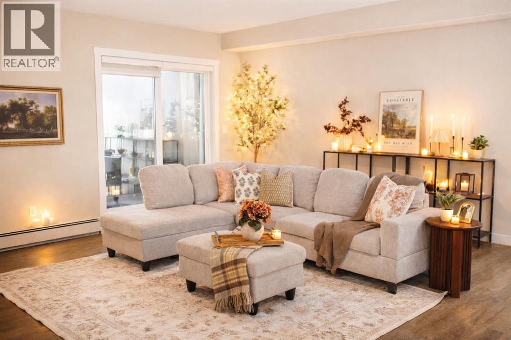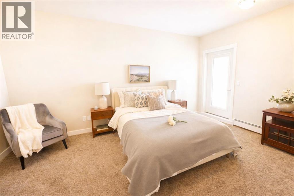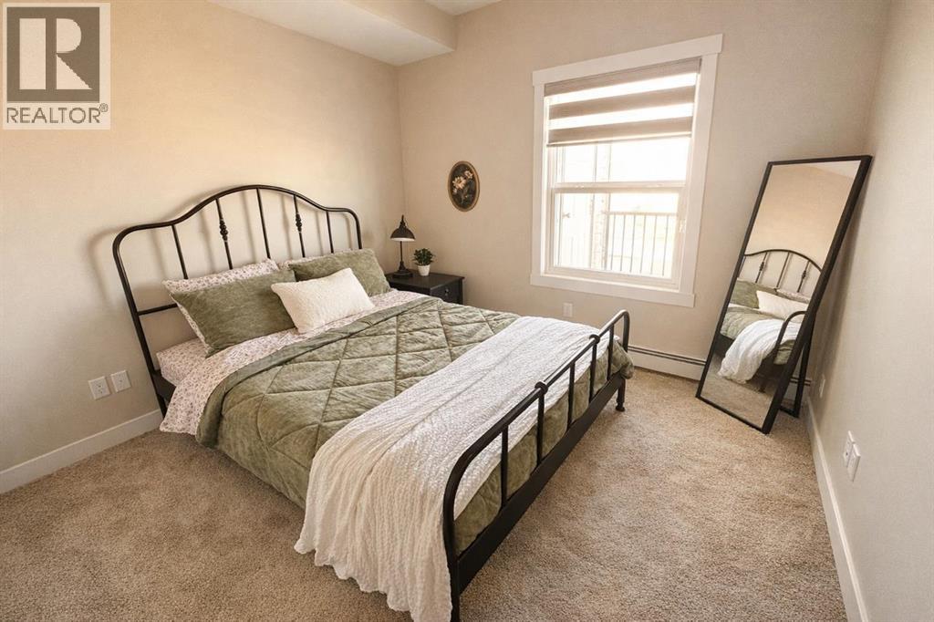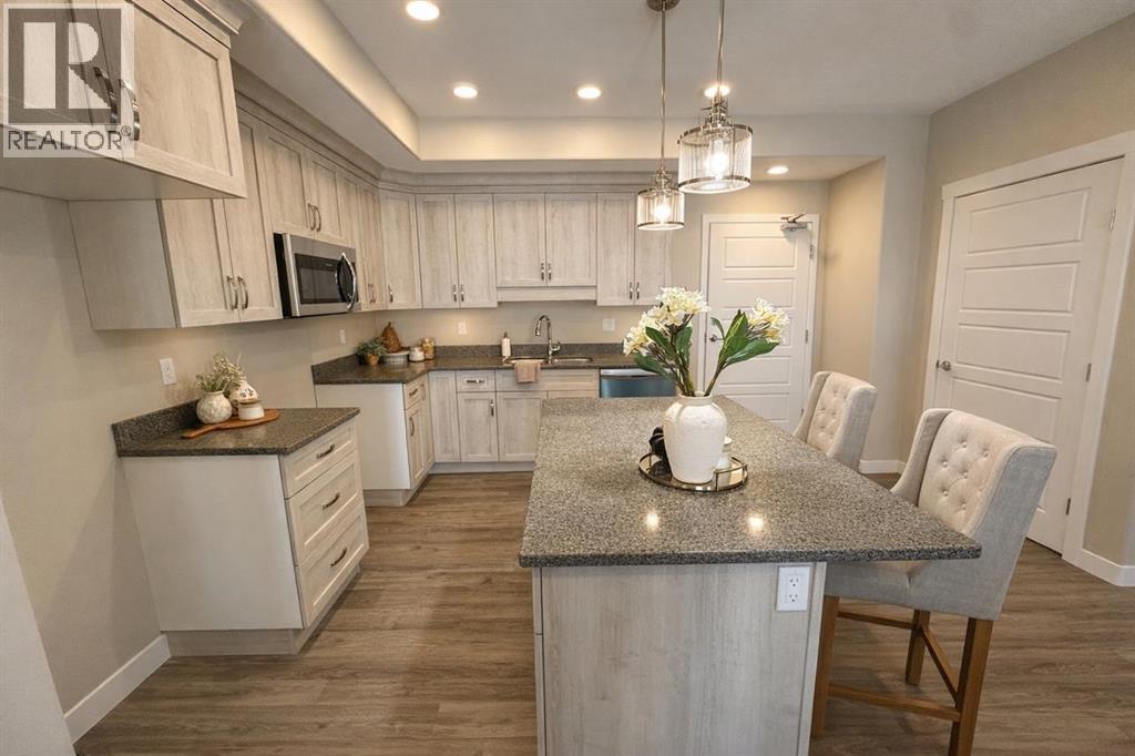 LAST UNIT AVAILABLE – #406 Meadow Brook EstatesRare opportunity to secure the final remaining unit in this 22-unit adult-living condo development in Brooks. This top-floor unit offers 2 bedrooms, 2 bathrooms, and 1,403 sq ft of thoughtfully designed living space.Features include 9’ ceilings, quartz/granite countertops, luxury vinyl plank flooring in main areas with carpet in bedrooms, modern LED lighting, and a spacious kitchen with an island and soft-close cabinetry. The primary suite includes a walk-in shower and comfort-height fixtures. Enjoy north-facing balcony views with a gas BBQ hookup and private enclosed storage.Building amenities include elevator access, indoor heated parking, additional outdoor parking options, and secure, low-maintenance living. Concrete construction between floors and dual-wall assemblies provide excellent soundproofing.Condo fees include heat, water, sewer, garbage, reserve fund contributions, snow removal, landscaping, and common area maintenance.GST is included in the purchase price. The seller is to provide a GST rebate to the buyer ($5,103) and a $1,500.00 appliance credit.Immediate possession available. Adult living, non-smoking building.RMS level 4 Measurements taken from builders' floor plans pre-construction, and include the non-heated powered storage rooms accessed off the deck. (id:63190)