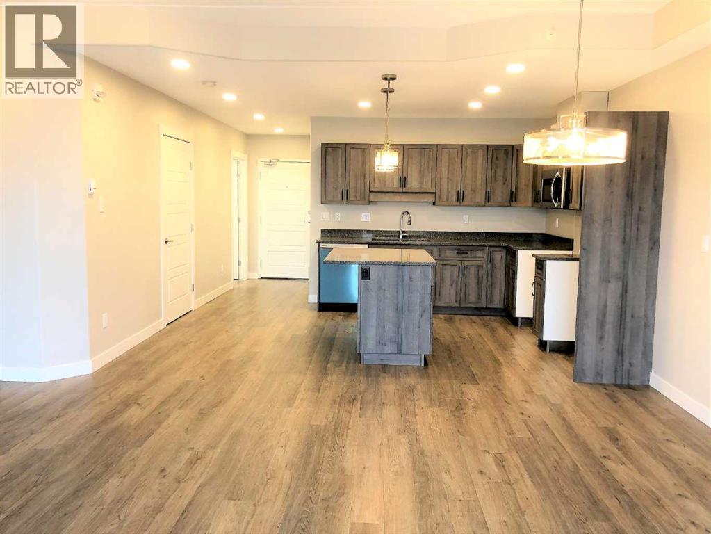 PRE-SELLING – Welcome to Meadow Brook Heights—Brooks’ newest adult living community offering modern comfort, quality construction, and low-maintenance living. Located on the east side near Meadow Lake, this beautifully designed condo combines style and convenience in a secure, thoughtfully planned development. This well-appointed unit features 9-foot ceilings, a bright open-concept layout, and premium finishes throughout. The kitchen is designed for both function and style with quartz countertops, a large island with power and pendant lighting, and built-in appliances including a microwave and dishwasher. Luxury vinyl plank flooring flows through the main living areas, with cozy carpet in the bedrooms. Enjoy the comfort of split air conditioning, a walk-in shower, comfort-height toilets, and added convenience with a water line to the fridge. Step outside to your private balcony complete with a natural gas BBQ hookup and access to your own storage room. This unit also includes a heated indoor parking stall, providing year-round comfort and security. Designed for easy living, condo fees include heat, water, sewer, garbage collection, building insurance, reserve fund contributions, snow removal, and grounds maintenance—making this an ideal lock-and-leave lifestyle. Construction is underway with a proposed completion in December 2026. Please note: photos are from a show suite and may not reflect final finishes. RMS measurements are based on builder plans. (id:63190)