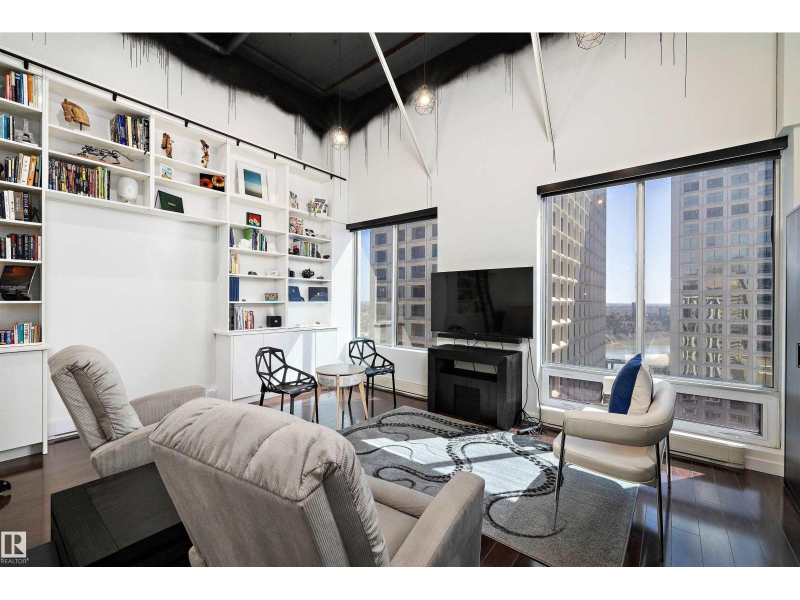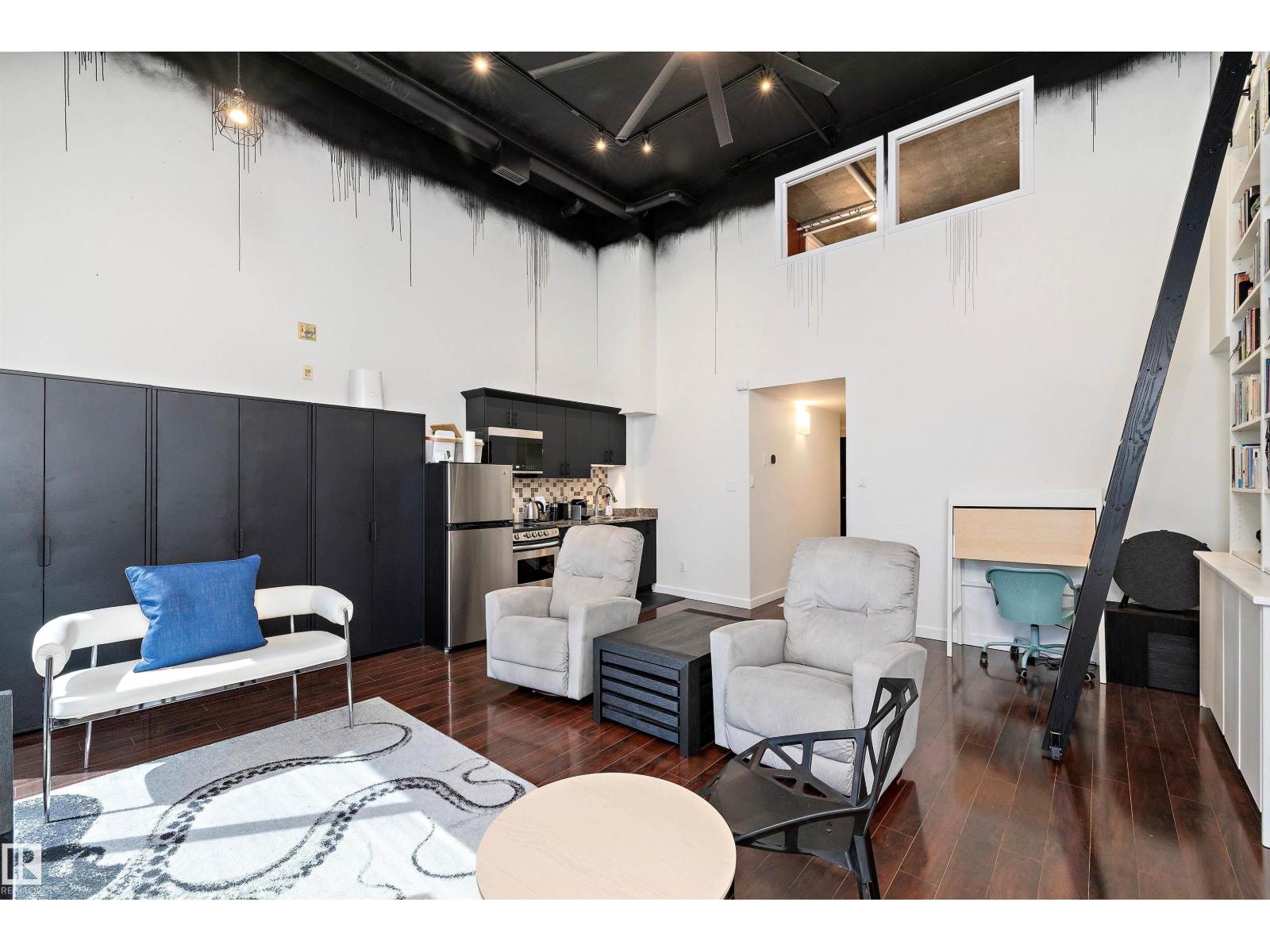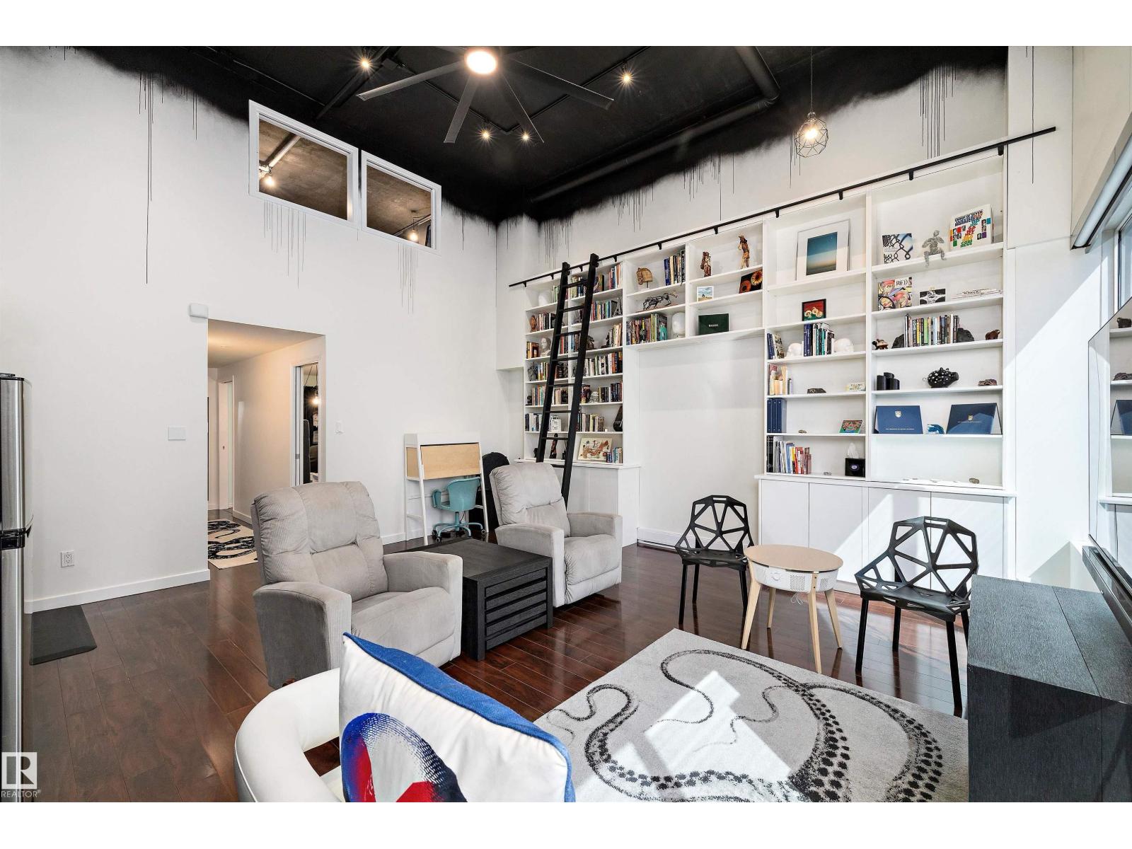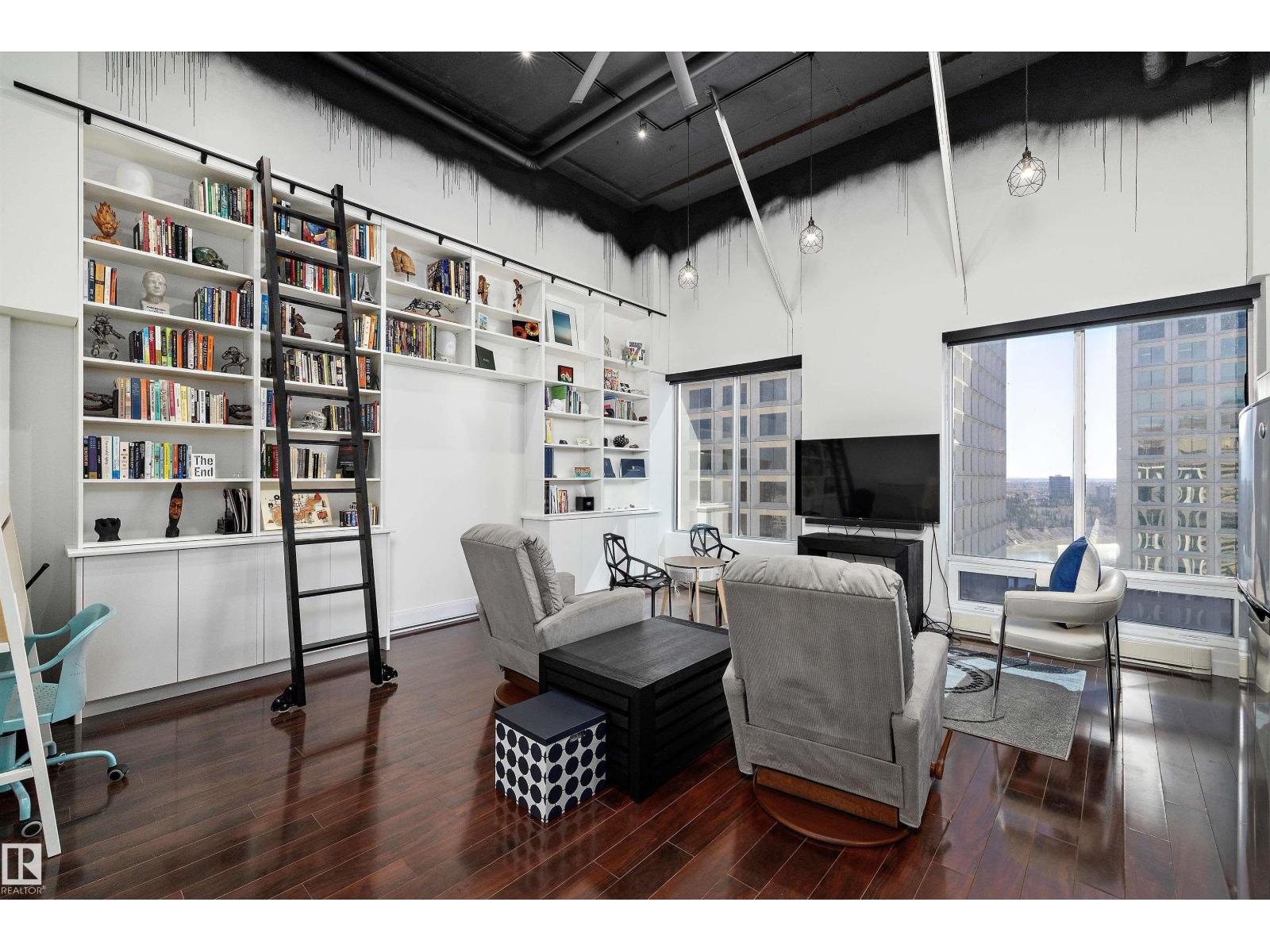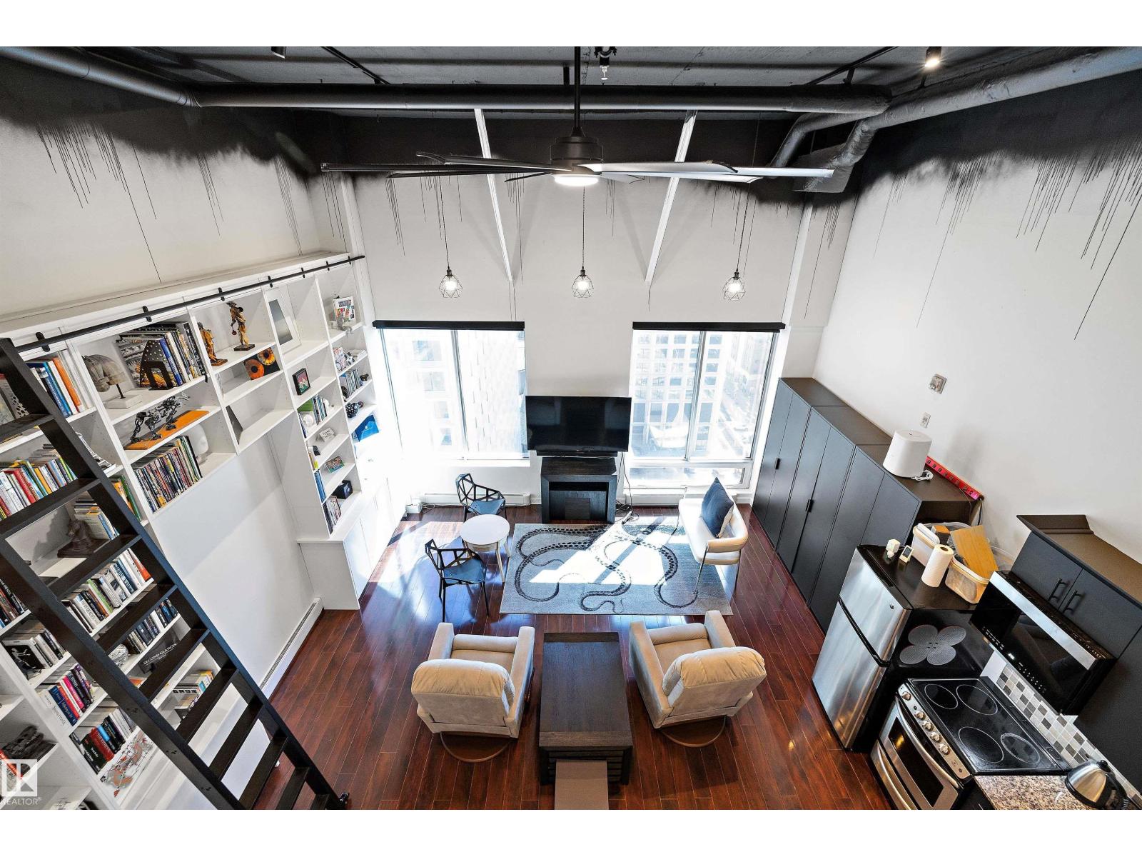 Elevate your lifestyle in this top-floor, two-storey loft at Cambridge Lofts in downtown Edmonton. This upgraded residence offers a rare river valley view and unbeatable convenience with direct, secure elevator access to the Central LRT—connecting you seamlessly to the University of Alberta, MacEwan, and NAIT, you don't even need to drive! Featuring soaring 18-ft ceilings, cinematic design with bold paint job, and customized book shelves and cabinet, this functional two-bedroom loft provides exceptional flexibility for living, working, or hosting. The upper-level offers a private ensuite, complemented by a second full bathroom (en-suite). Located steps from the ICE District, dining, and nightlife, this pet-friendly building is perfect for professionals, students, or first-time buyers. With low property taxes, Airbnb-friendly policies, and strong rental potential, this is a standout opportunity for both homeowners and investors. (id:63190)