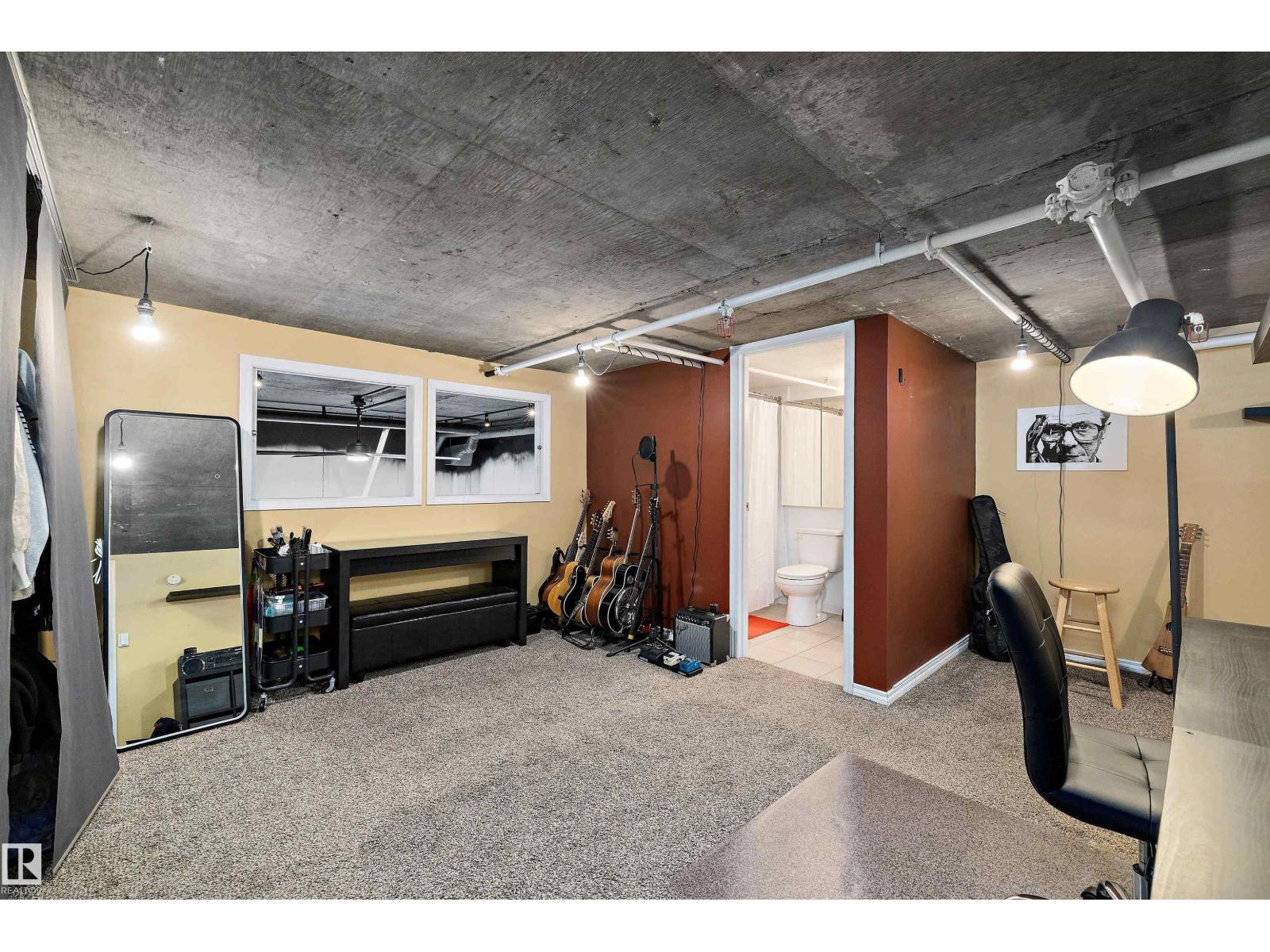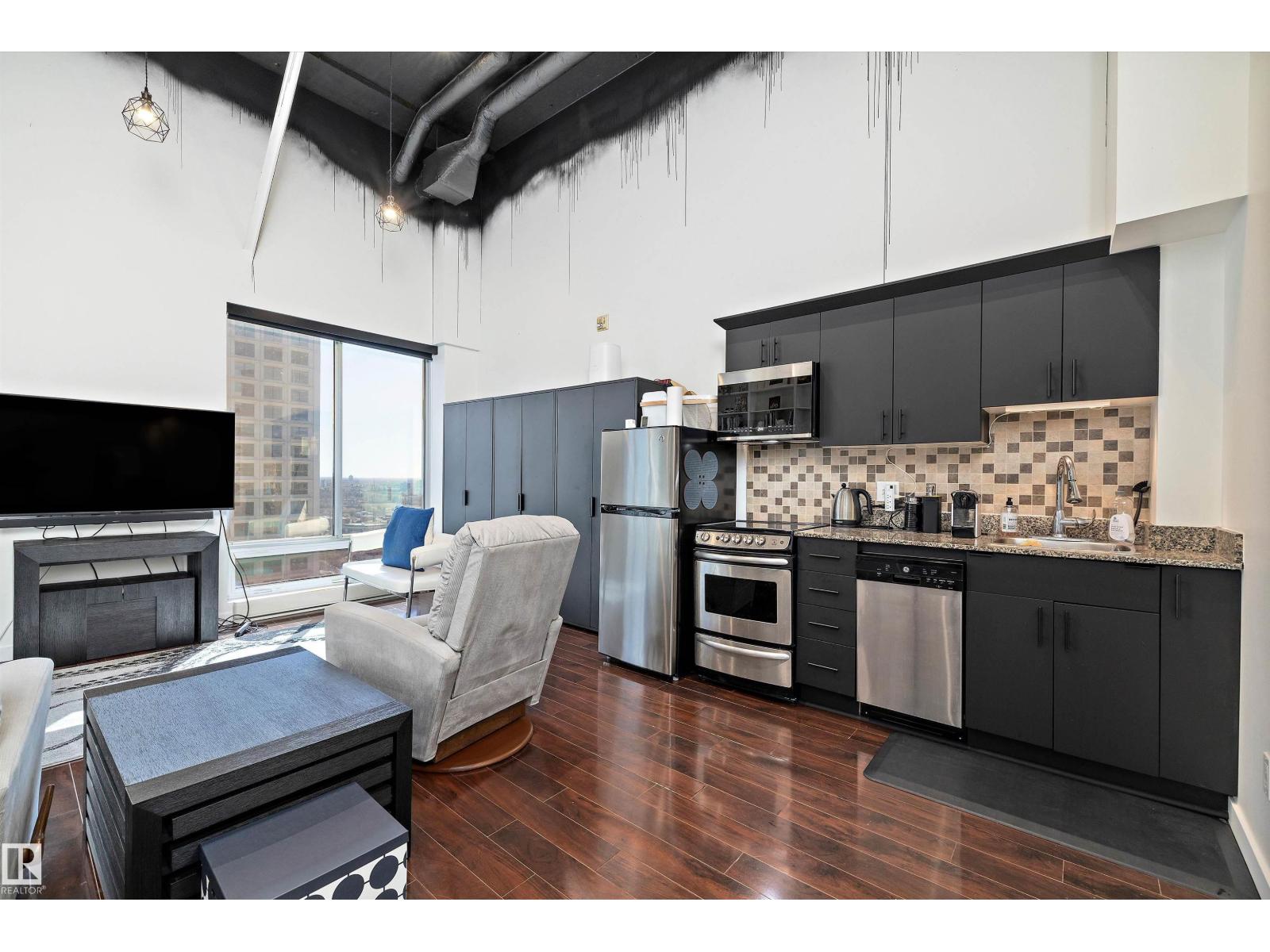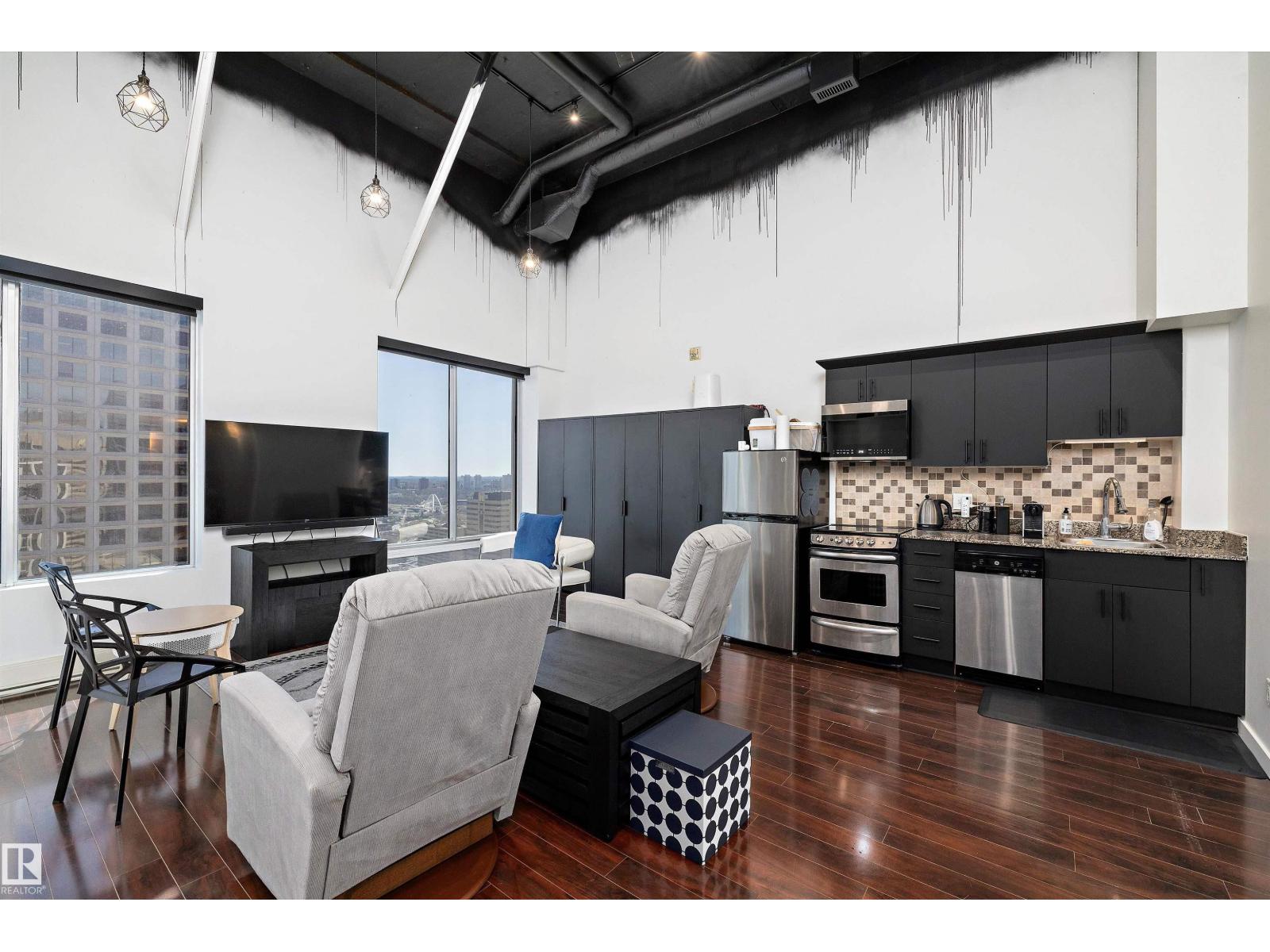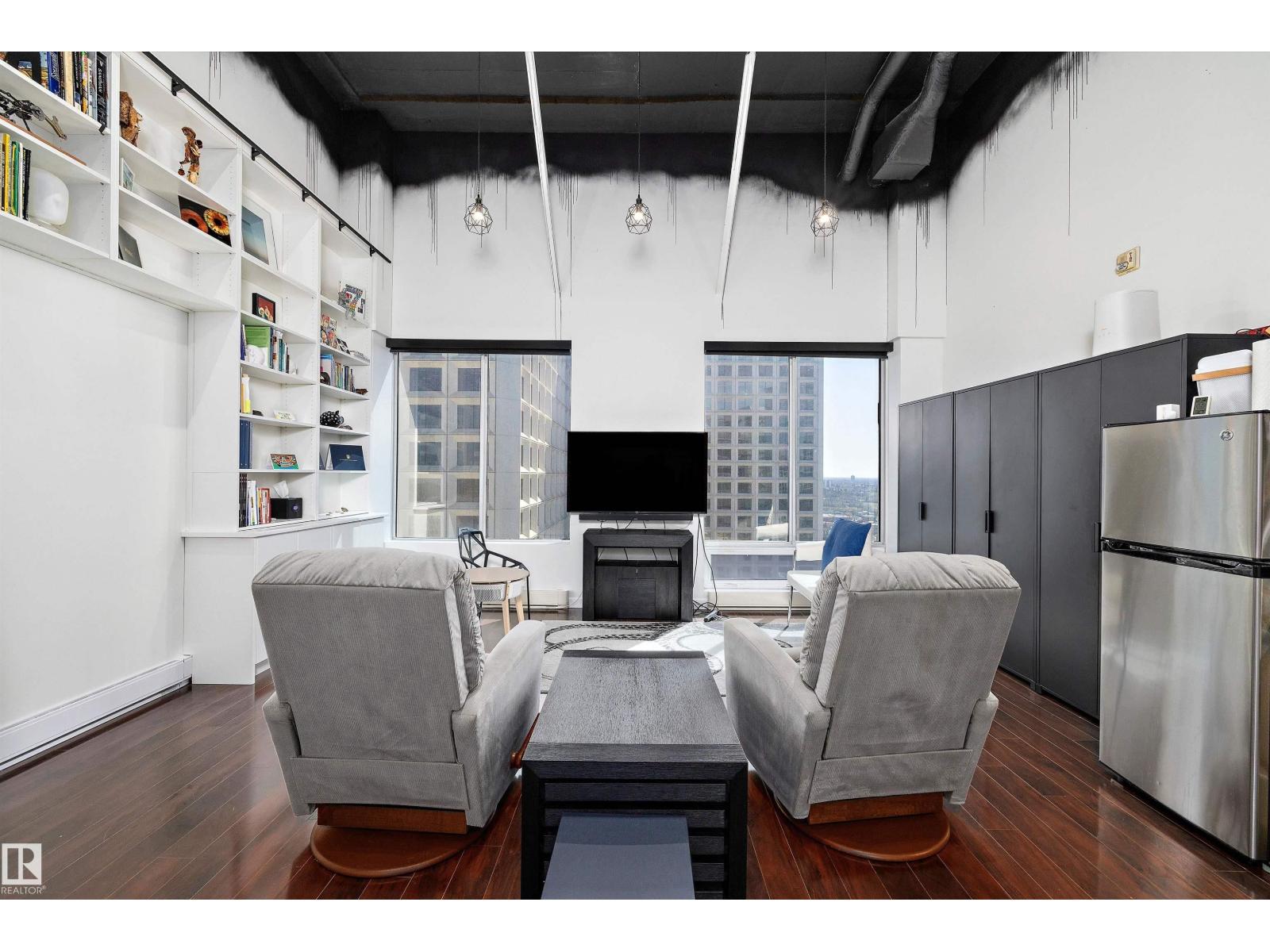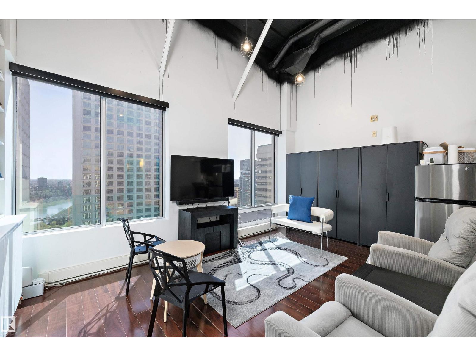 Elevate your lifestyle in this top-floor, two-storey loft at Cambridge Lofts in downtown Edmonton. This upgraded residence offers a rare river valley view and unbeatable convenience with direct, secure elevator access to the Central LRT—connecting you seamlessly to the University of Alberta, MacEwan, and NAIT, you don't even need to drive! Featuring soaring 18-ft ceilings, cinematic design with bold paint job, and customized book shelves and cabinet, this functional two-bedroom loft provides exceptional flexibility for living, working, or hosting. The upper-level offers a private ensuite, complemented by a second full bathroom (en-suite). Located steps from the ICE District, dining, and nightlife, this pet-friendly building is perfect for professionals, students, or first-time buyers. With low property taxes, Airbnb-friendly policies, and strong rental potential, this is a standout opportunity for both homeowners and investors. (id:63190)
