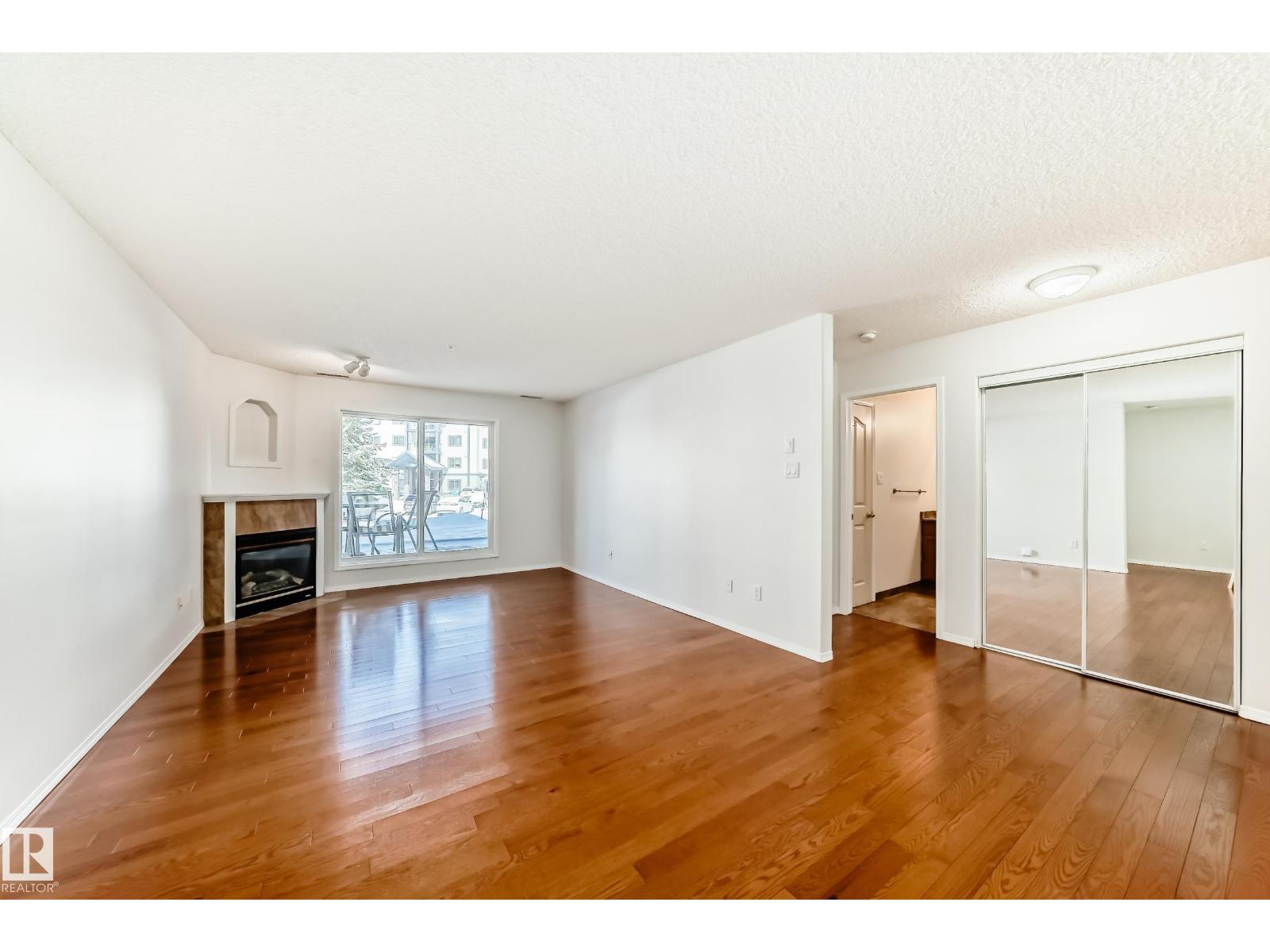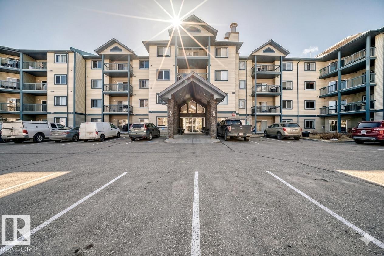 Welcome to this beautifully maintained main floor unit offering over 1000 sq ft of thoughtfully designed living space. Featuring bedrooms and 2 full bathrooms, including an ensuite with a relaxing jacuzzi tub. This home showcases pride of ownership from the original owner. The interior has been professionally painted and features engineered hardwood flooring throughout, with ceramic tile in the entry and bathrooms. The kitchen is finished with quartz countertops, ceramic backsplash, and a moveable island with seating. Enjoy the cozy gas fireplace, in-suite laundry with oversized stackable washer/dryer, and air conditioning for year-round comfort. This home includes 2 TITLED PARKING spaces, a powered stall, plus an additional heated underground stall with storage. Building amenities include a gym, recreation room, library, guest suite, and outdoor gathering spaces. Ideally located near Namao shopping centre; grocery shopping, banks, transit, and quick access to the Anthony Henday and CFB Edmonton. (id:63190)