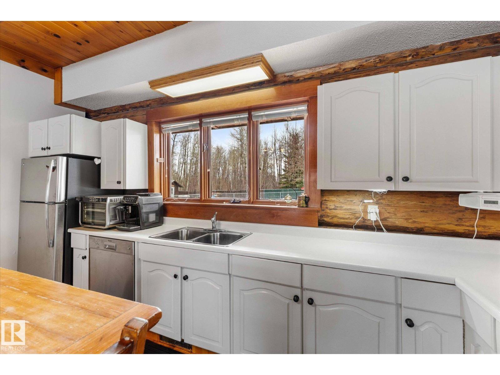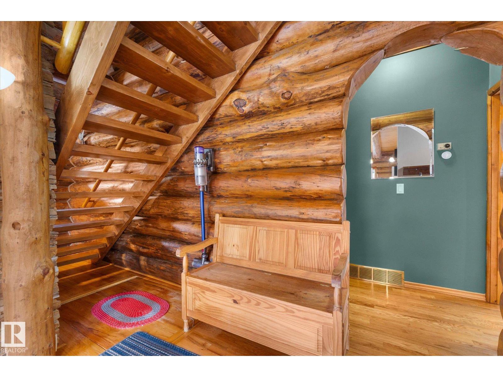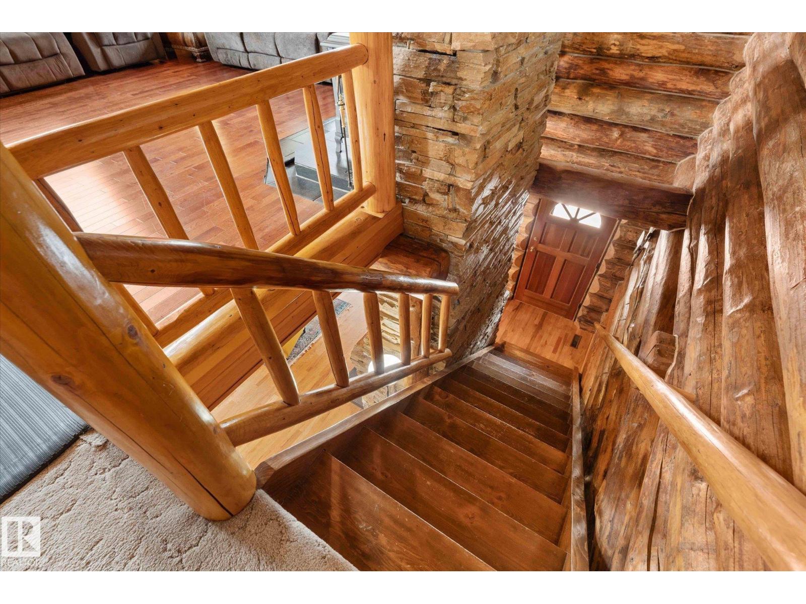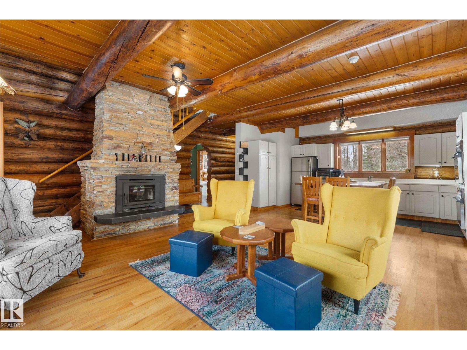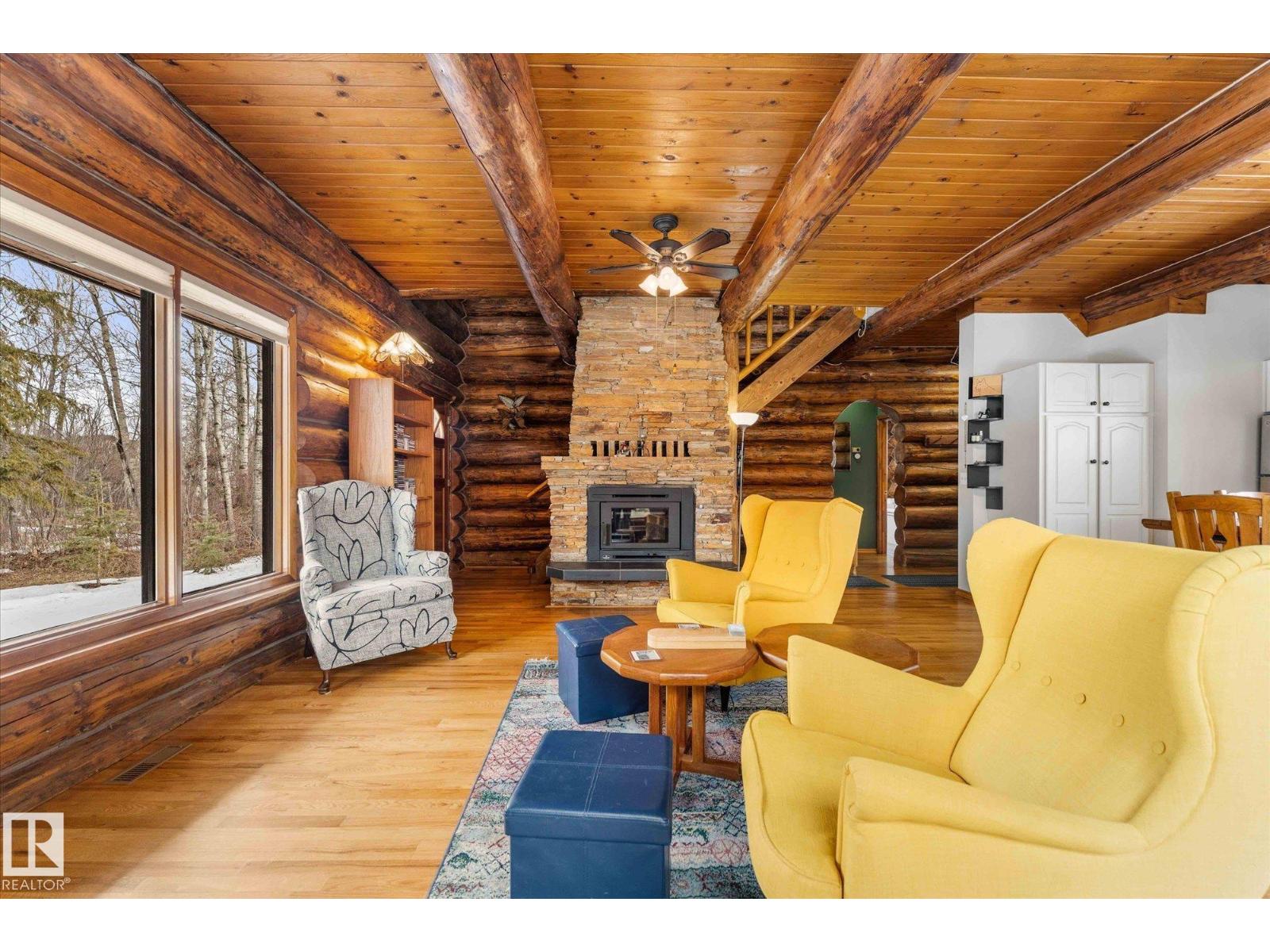 Crafted to Endure. Designed to Be Remembered. A fully restored authentic log home near Wabamun Lake, where natural materials and meticulous craftsmanship define the experience. At the center are two dramatic hand-laid stacked stone fireplaces—crafted stone-by-stone, one on each floor, to create natural depth, texture, and presence. It anchors the space and reflects a level of artisan construction rarely achieved today. Authentic log construction and rich natural materials create a timeless ambiance. Professional restoration, including updated sealants and chinking, enhances durability while preserving the integrity of the home. Warm, functional living spaces support both quiet mornings and gatherings. A large heated garage/shop, mature private setting, and covered outdoor areas extend the experience year-round. A level of craftsmanship rarely seen in today’s construction—this is a home that supports the kind of moments people hold onto, built to be appreciated today and carried forward for years to come. (id:63190)