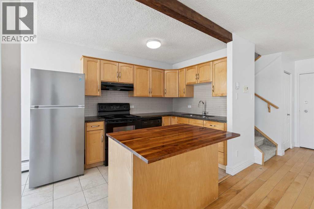 Nestled within the highly sought-after, concrete-built Executive Estates, this immaculate multi-level two-bedroom condo offers a sophisticated urban retreat. The building is meticulously managed and post-tension cable free, quietly situated on a charming tree-lined street adjacent to Connaught Community School—placing you just steps from the vibrant energy of both downtown and the trendy shops of 17th Avenue. Inside, the functional layout features rich hardwood floors and expansive windows that bathe every room in natural light. The updated kitchen is a chef’s delight, featuring warm maple cabinetry, extensive counter space, a full tile backsplash, and a generous central island. This space flows seamlessly into a sun-drenched living and dining area designed for entertaining, which opens onto a private balcony offering a captivating view you’ll never get tired of. The upper level continues to impress with two spacious bedrooms, a large four-piece bathroom, and the convenience of an in-suite washer and dryer. Freshly updated with paint and new carpets, the unit feels like new. Completing this exceptional home is secure underground parking located conveniently by the stairs, two assigned storage units, dedicated bike storage, and a secondary laundry facility for the building. (id:63190)