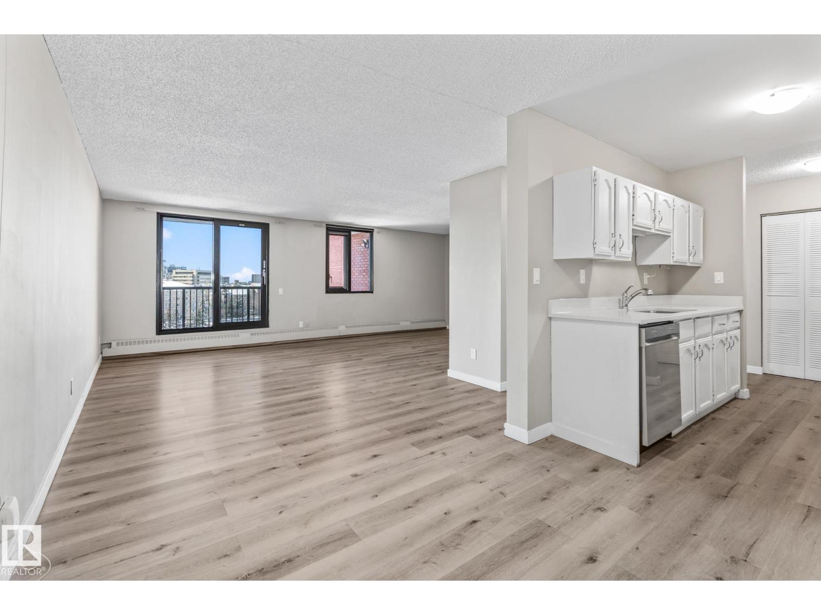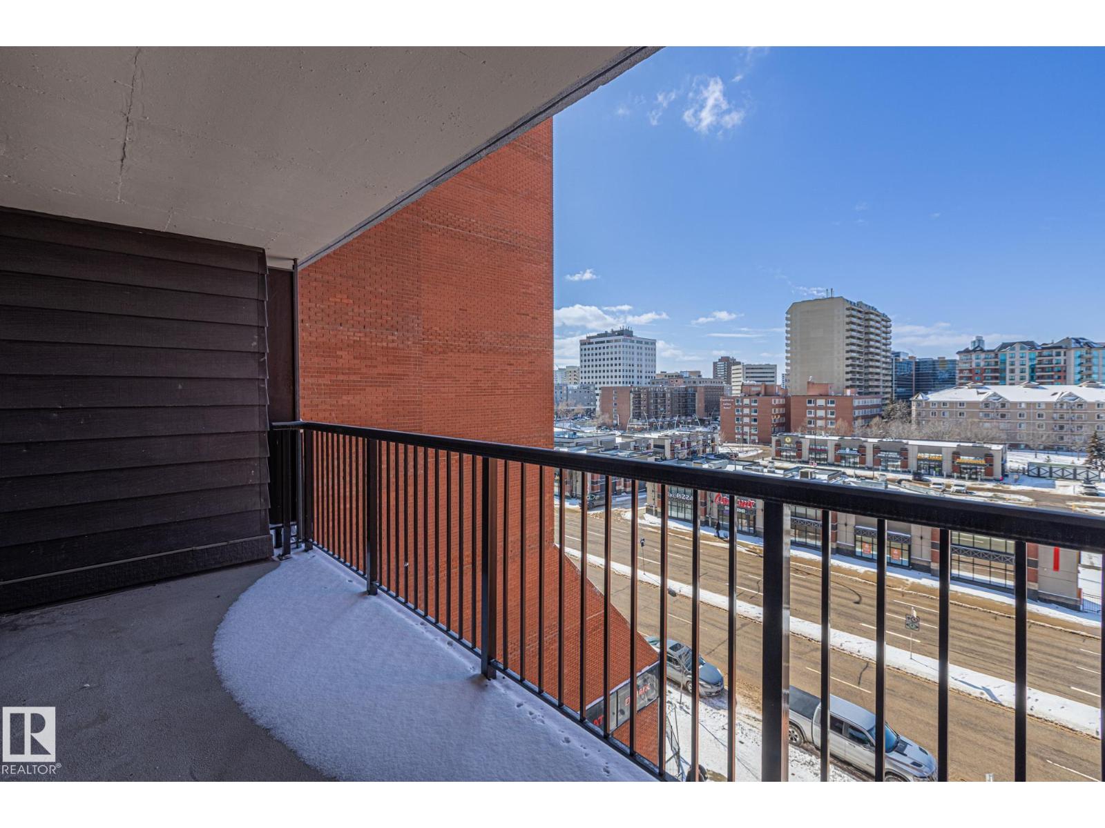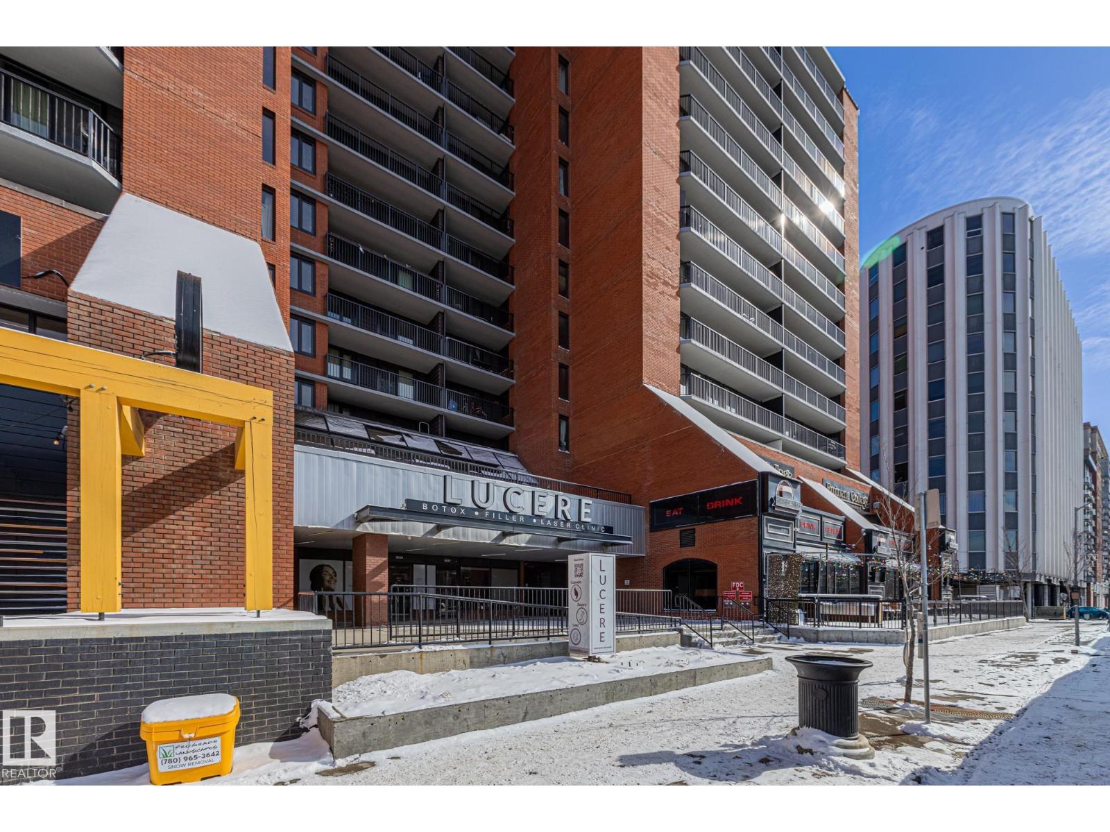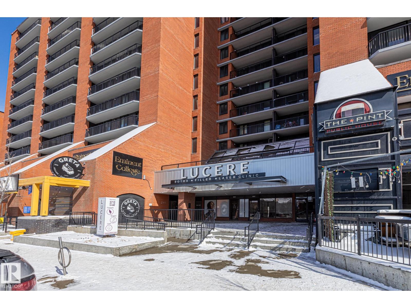 PRIME DOWNTOWN LOCATION! This spacious, well-maintained 1-bedroom condo puts you steps from restaurants, nightlife, shopping, and the LRT. MacEwan University is within walking distance, and quick transit access makes commuting to the University of Alberta a breeze. Bright and functional layout featuring newer laminate flooring throughout, a generous living area, and a large west-facing balcony with stunning downtown views—perfect for evening sunsets and BBQs. The kitchen is finished with granite countertops and includes a brand new dishwasher. This unit also offers in-suite laundry and a titled underground parking stall. The building features great amenities including a fitness room and social room with pool tables and large projector TV system. Major upgrades have already been completed: windows (2020), make-up air unit (2022), backwater prevention (2019), hot water tanks (2018), parkade membrane (2024), and hallway carpets (2022). Condo fees do include all utilities. Excellent value for downtown living! (id:63190)