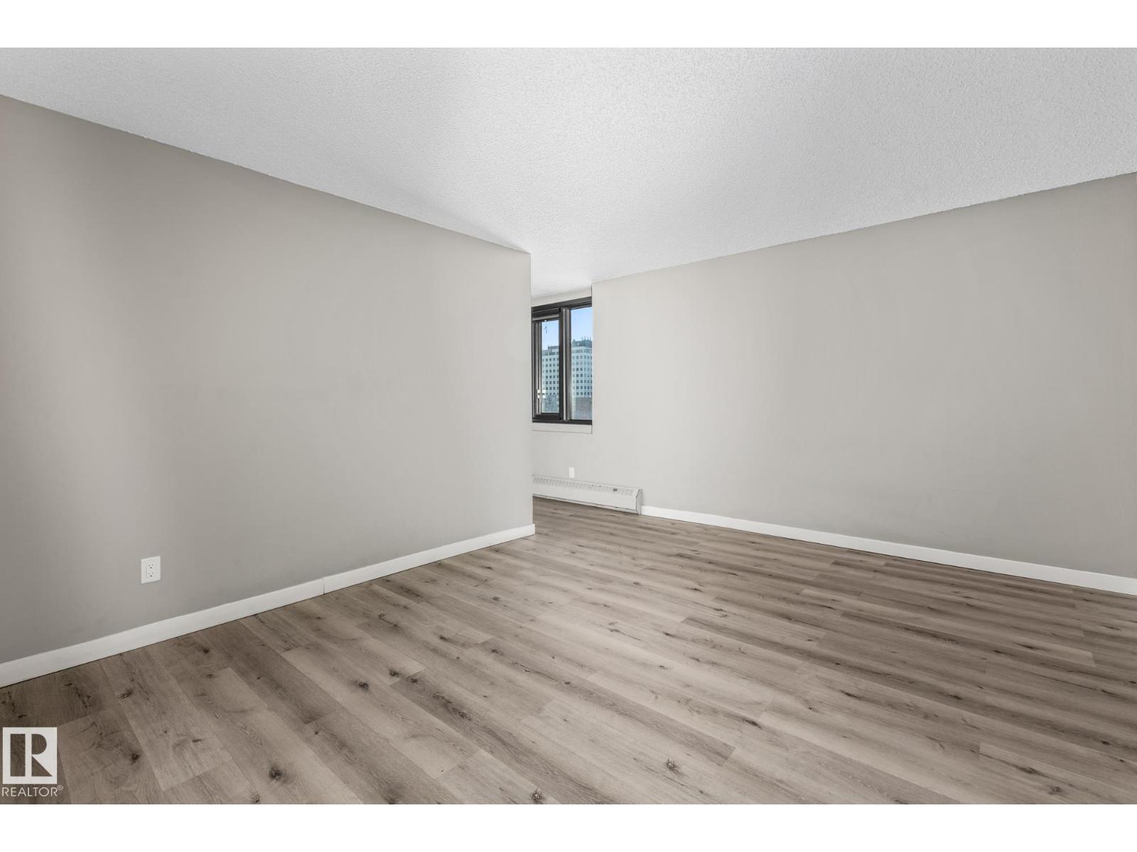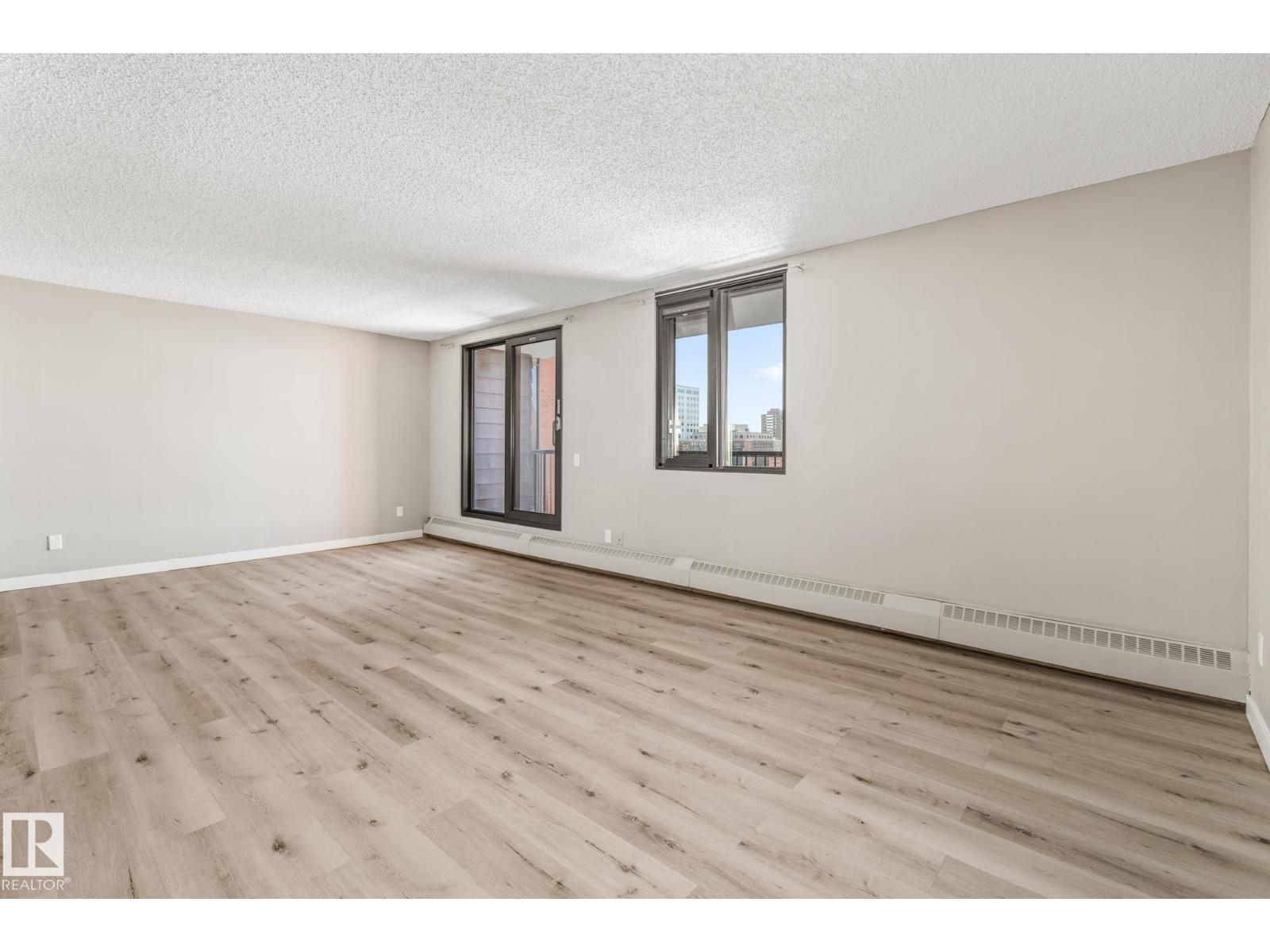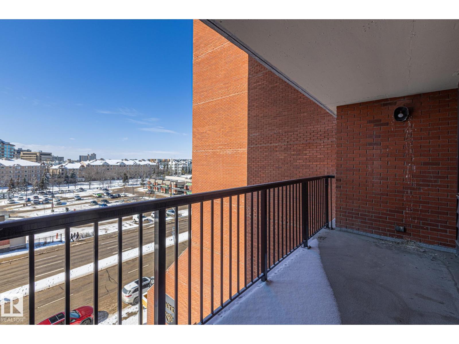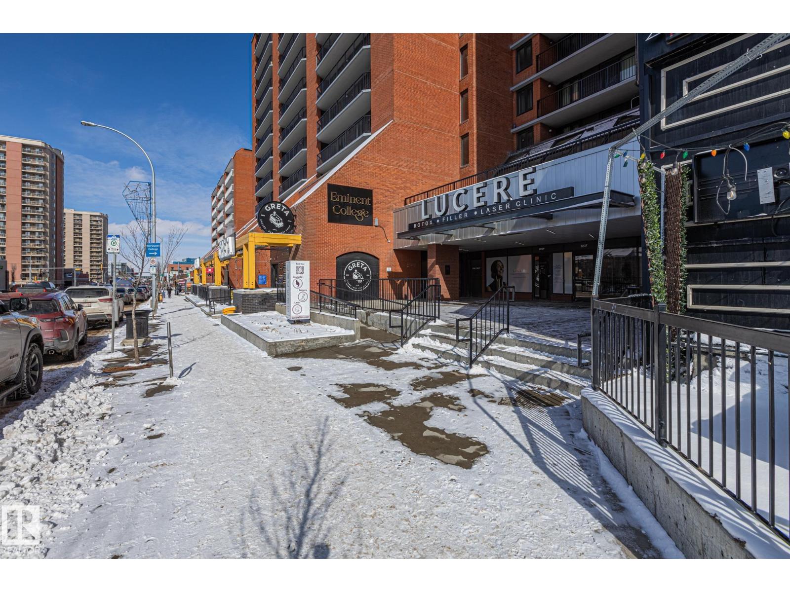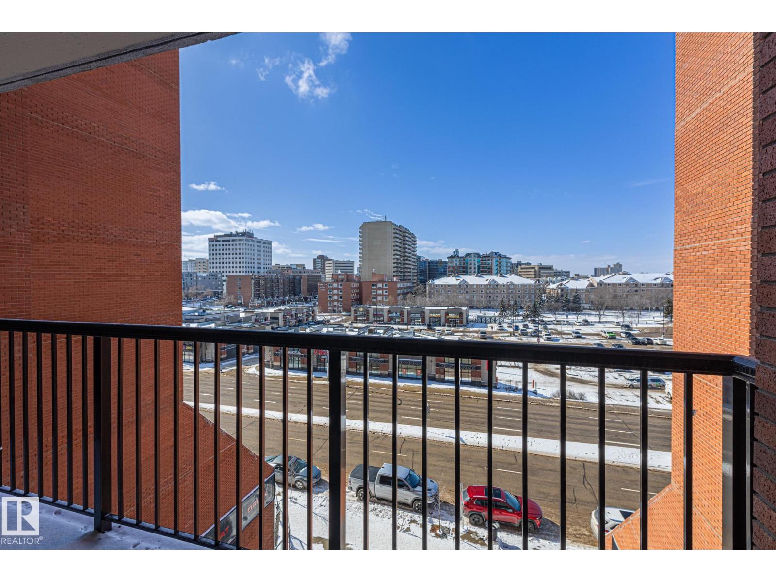PRIME DOWNTOWN LOCATION! This spacious, well-maintained 1-bedroom condo puts you steps from restaurants, nightlife, shopping, and the LRT. MacEwan University is within walking distance, and quick transit access makes commuting to the University of Alberta a breeze. Bright and functional layout featuring newer laminate flooring throughout, a generous living area, and a large west-facing balcony with stunning downtown views—perfect for evening sunsets and BBQs. The kitchen is finished with granite countertops and includes a brand new dishwasher. This unit also offers in-suite laundry and a titled underground parking stall. The building features great amenities including a fitness room and social room with pool tables and large projector TV system. Major upgrades have already been completed: windows (2020), make-up air unit (2022), backwater prevention (2019), hot water tanks (2018), parkade membrane (2024), and hallway carpets (2022). Condo fees do include all utilities. Excellent value for downtown living! (id:63190)