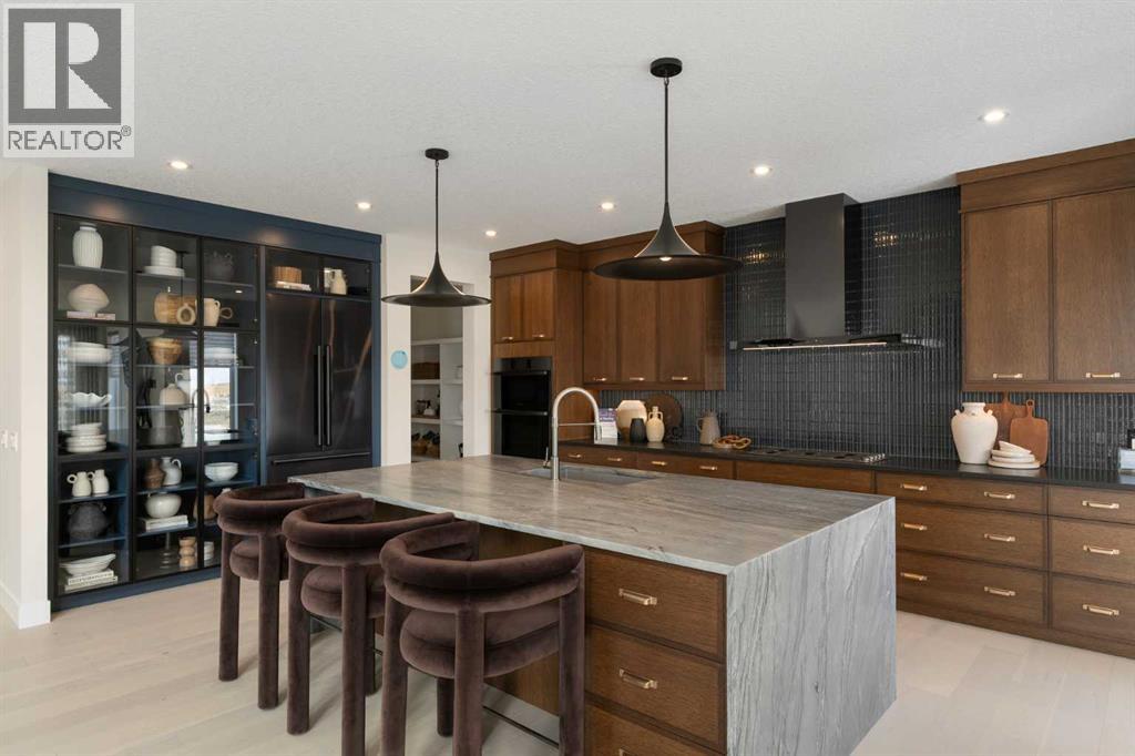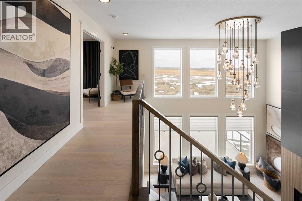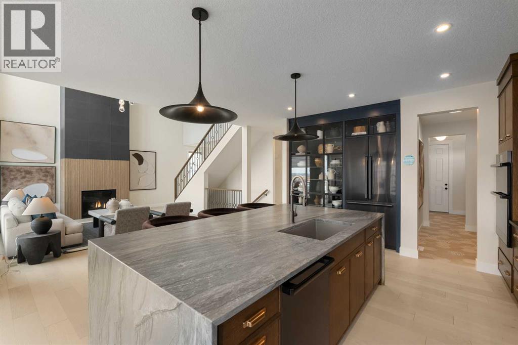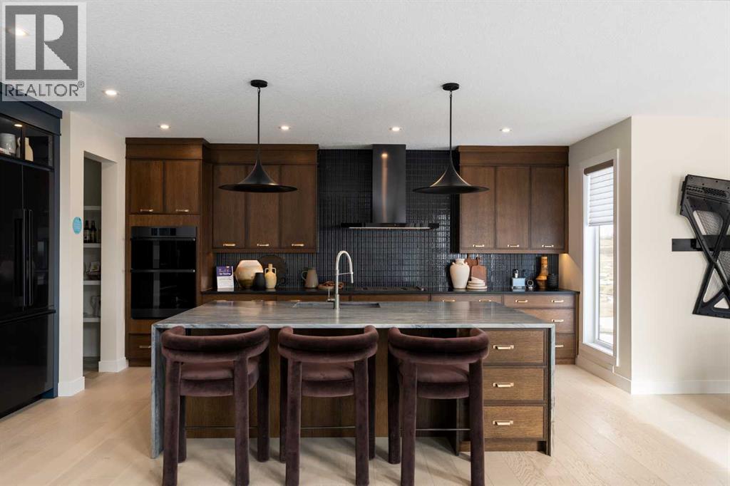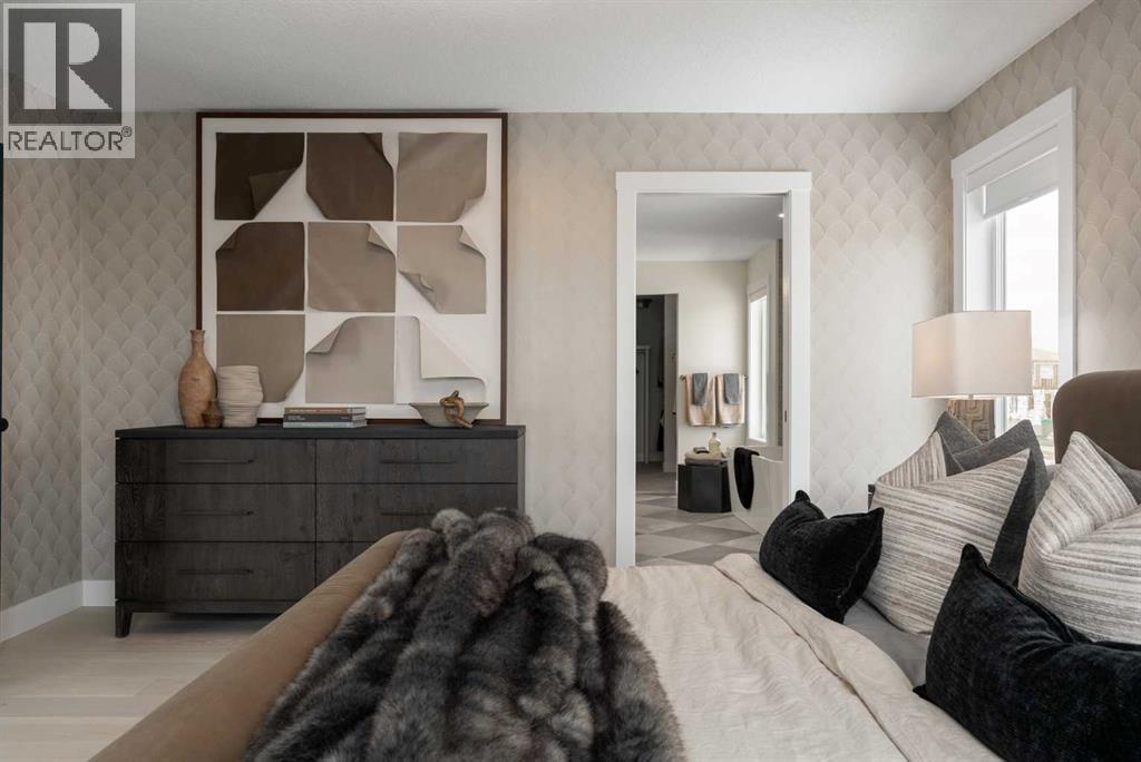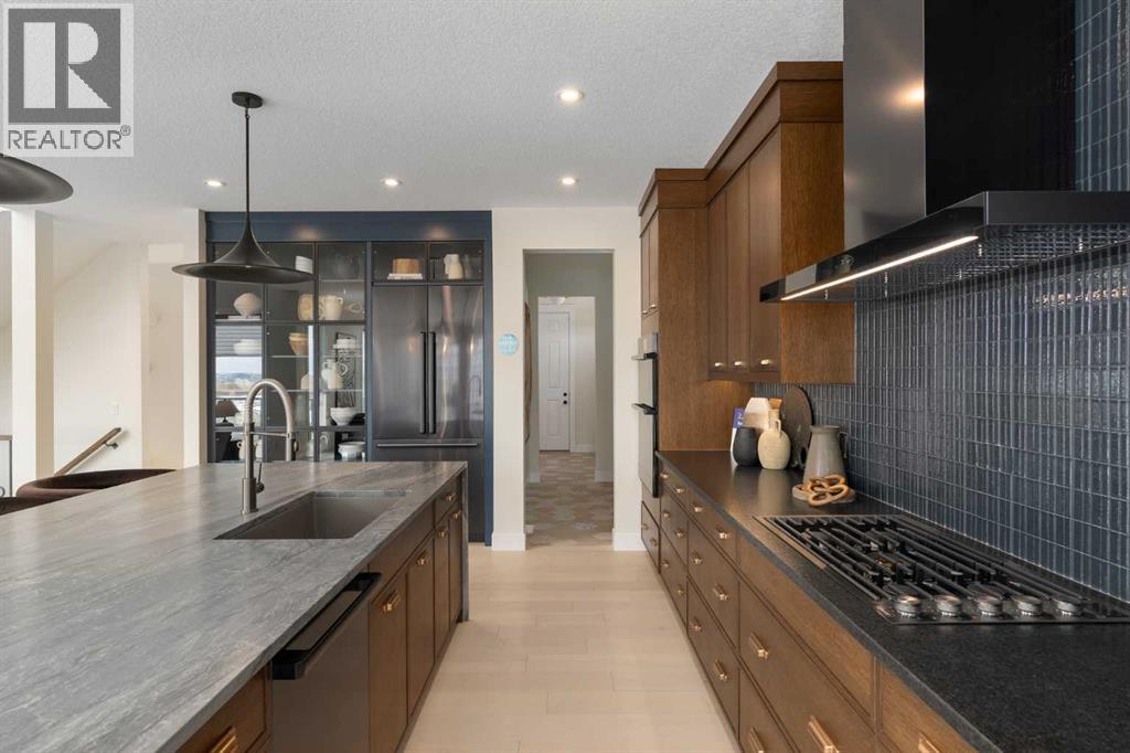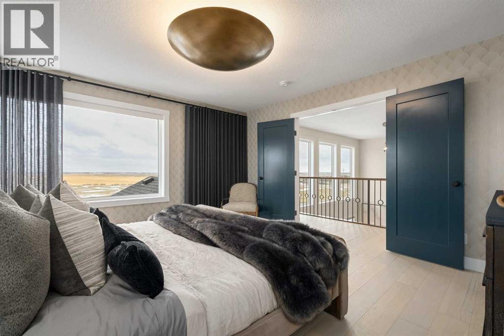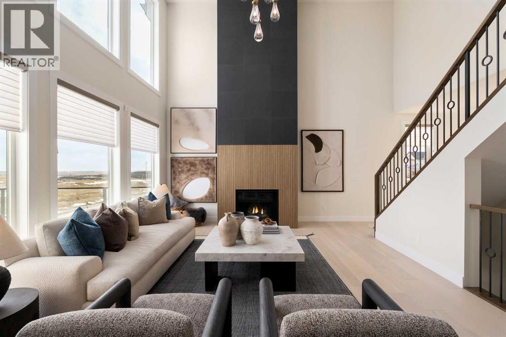 SHOW HOME FOR SALE! Welcome to the Palermo - an impeccably designed, brand-new residence offering a refined blend of modern elegance and everyday functionality, ideally located at 110 Herron Way NE in the sought-after community of Livingston. From the moment you enter, the home impresses with its sophisticated design and seamless flow. The main level is anchored by a stunning central kitchen, thoughtfully curated to serve as both a functional workspace and a striking focal point for entertaining. Featuring a large statement island with waterfall granite countertops, sleek natural wood cabinetry, and a premium Dacor appliance package including a built-in refrigerator, gas cooktop, a wall oven and microwave. This space effortlessly connects to the dining and living areas, creating an open, airy environment enhanced by expansive windows and abundant natural light. The main level is anchored by a dramatic open-to-above great room featuring a striking gas fireplace with tile to the ceiling and expansive windows that flood the space with natural light. The living space is designed with both comfort and style in mind, offering a warm yet elevated atmosphere ideal for hosting or unwinding. Clean lines, contemporary finishes, and intentional design details carry throughout, delivering a cohesive and polished aesthetic. The main level is complete with a bedroom and a full bathroom featuring a walk-in shower - ideal for multi-generational living. Natural wood and iron spindle railings lead to the upper level which overlooks the main level great room. Double doors open to the primary suite, located at the back of the home, away from the secondary bedrooms for optimal privacy. The primary bedroom offers a serene escape, complete with a spacious walk-in closet that connects directly to the laundry room for added convenience. The beautifully appointed ensuite was designed for relaxation, featuring stunning tile design, a curbless walk-in tiled shower with 10mm glass, a soaker tub, individual vanities and a private water closet. Hardwood flooring flows throughout the primary suite and down the hallway to the expansive family room, which features vaulted ceilings, wallpaper and custom lighting. Three generously sized bedrooms, a 5 piece main bathroom, and a large laundry room complete the upper level. The stunning design continues into the professionally developed walkout basement, which features an expansive recreation room, games area and flex space with French doors - creating the ideal home office. A sixth bedroom and full bathroom in the basement create the perfect living space for guests. A wall of windows floods the lower level with natural light, overlooking the private backyard and green space beyond, with patio doors leading to the covered patio. This professionally designed estate property includes a triple attached garage, central A/C, custom window treatments and a timeless cohesive design throughout on one of the community's most coveted home sites. (id:63190)