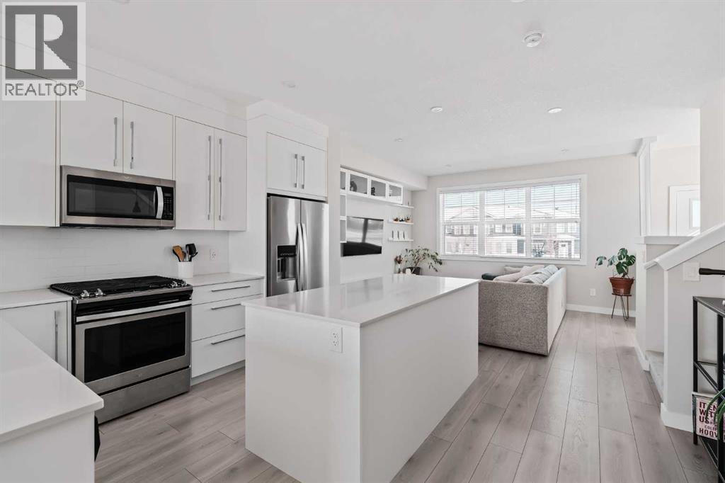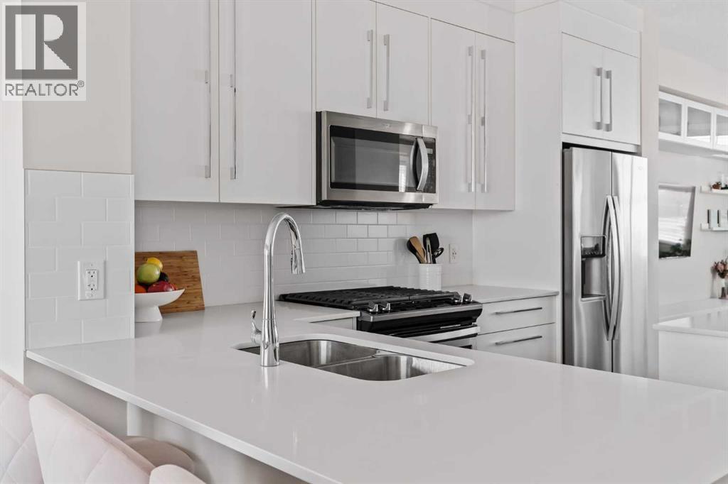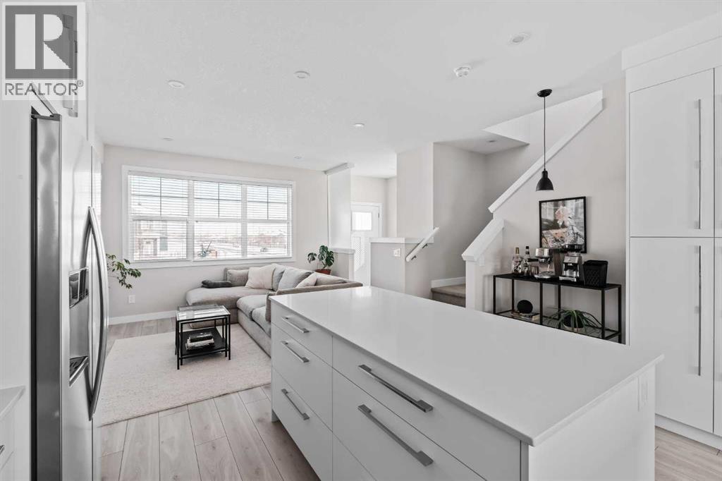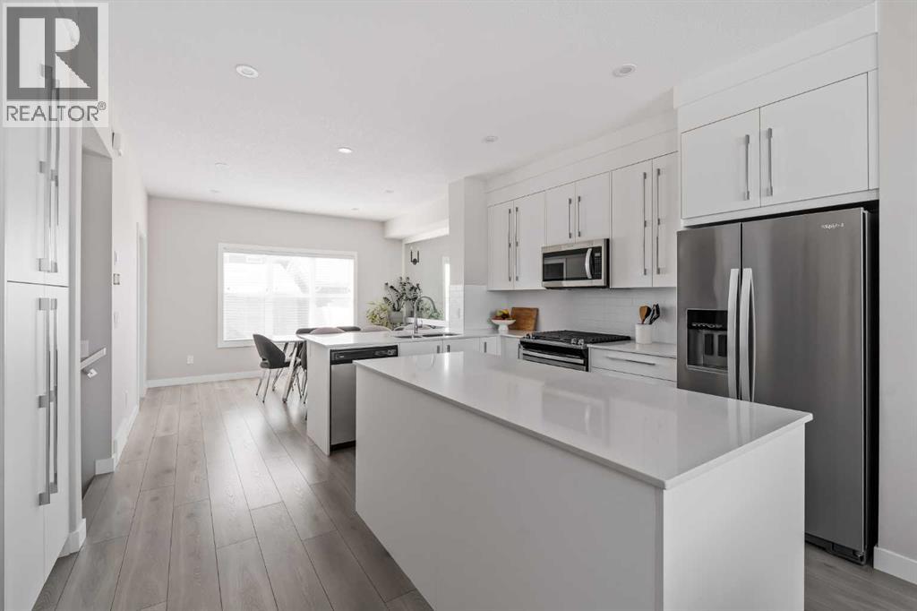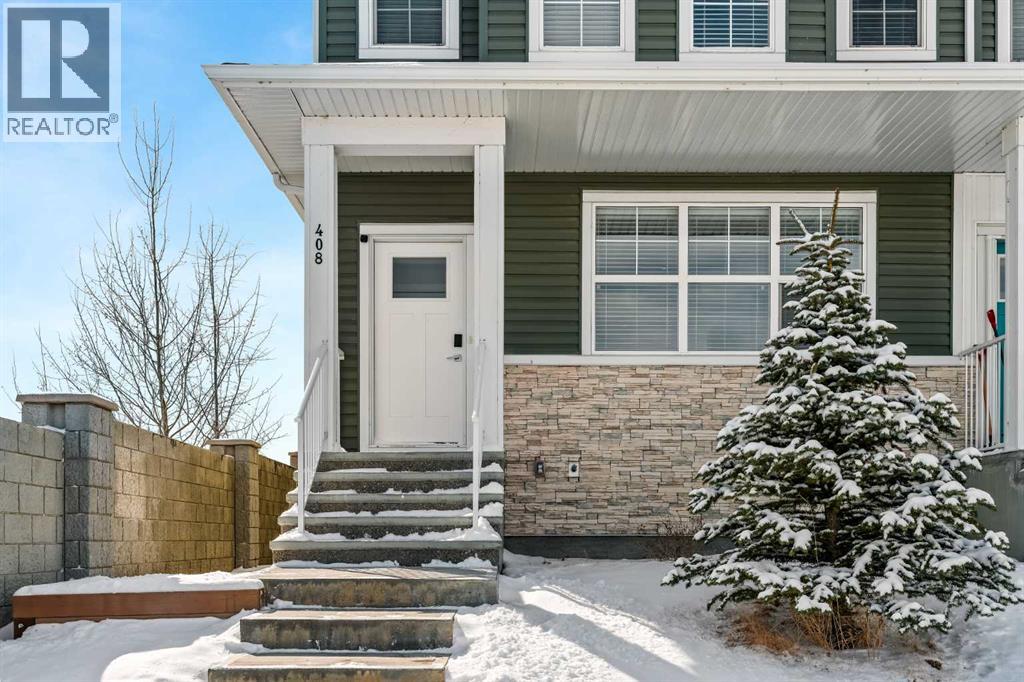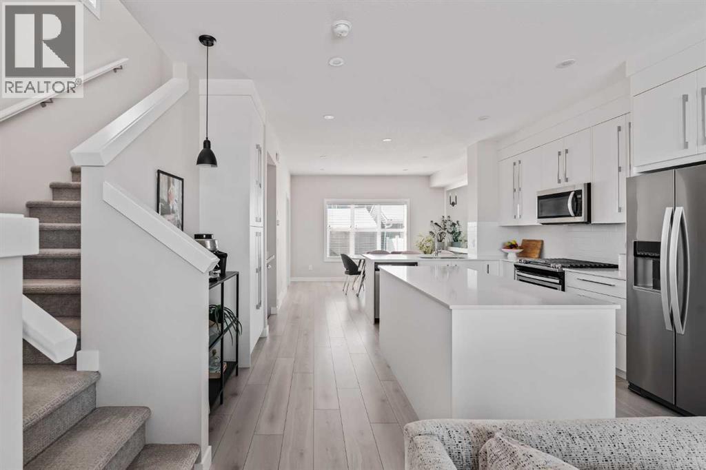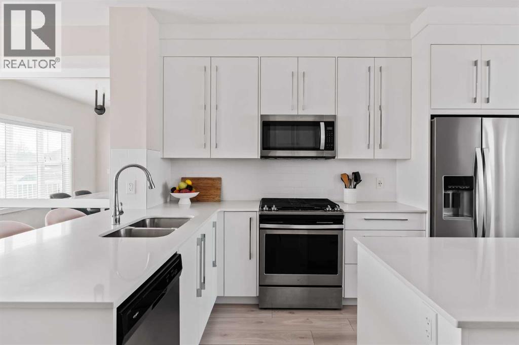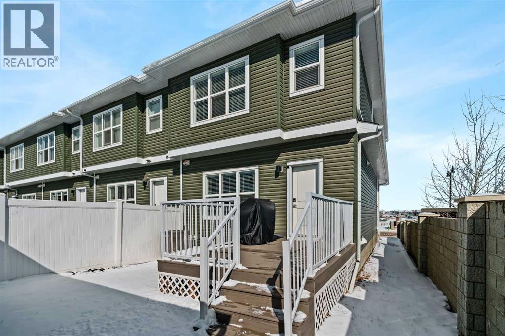 BETTER THAN NEW! This immaculately maintained NO CONDO FEE, END-UNIT townhouse is completely move-in ready, featuring thoughtful upgrades and an unbeatable location just minutes from countless amenities. Ideally situated in Dawson’s Landing, and within walking distance to the future K–9 school, this 3-bedroom, 2.5-bathroom home offers over 1,500 sq. ft. of developed living space, a DOUBLE GARAGE and the perfect blend of style and functionality. Whether you’re a young couple, growing family, or professional, this home delivers comfort, convenience, and long-term value. Positioned on a fully landscaped corner lot with only one neighbouring property and a desirable south-facing backyard, this end unit benefits from additional yard space, natural light, and privacy. The main level features a bright open-concept layout with 9-foot ceilings and durable laminate flooring throughout. Expansive windows on three sides flood the home with natural light, creating a warm and inviting atmosphere from morning to evening. The timeless kitchen is both stylish and functional, showcasing full-height white cabinetry, quartz countertops, classic subway tile backsplash, and a full suite of stainless steel appliances, including a gas range, microwave hood fan, and French-door refrigerator. A large built-in pantry provides excellent storage, while the island and peninsula eating bar offer seating for three, making it perfect for everyday living and entertaining. The layout flows seamlessly into the rear dining area, which comfortably fits a full-sized dining table, and the front living room, complete with a custom-built-in media console. The main level is finished with a welcoming front foyer, a convenient 2-piece powder room, and a functional rear mudroom with built-in seating and storage. Upstairs, laminate flooring continues throughout. The spacious primary suite (12’10” x 14’2”) overlooks the backyard and features a beautiful ensuite with a tiled shower, dual sinks, and a walk-in close t with custom organizers. Two additional well-sized bedrooms, a 4-piece bathroom, and a generous upper-level laundry area complete the second floor. The south-facing backyard offers excellent usable green space, ideal for kids, pets, gardening, or entertaining. A composite deck provides the perfect setting for summer BBQs, while the double detached garage ensures secure parking and additional storage year-round. As an end unit, the property also benefits from extra outdoor space and additional parking flexibility. Pride of ownership is evident throughout. This home is truly move-in ready and includes valuable upgrades such as central air conditioning and custom window coverings, saving you money! Located in one of Chestermere’s most desirable and growing communities, Dawson’s Landing offers the perfect balance of quiet residential living with convenient access to parks, schools, and everyday amenities. (id:63190)