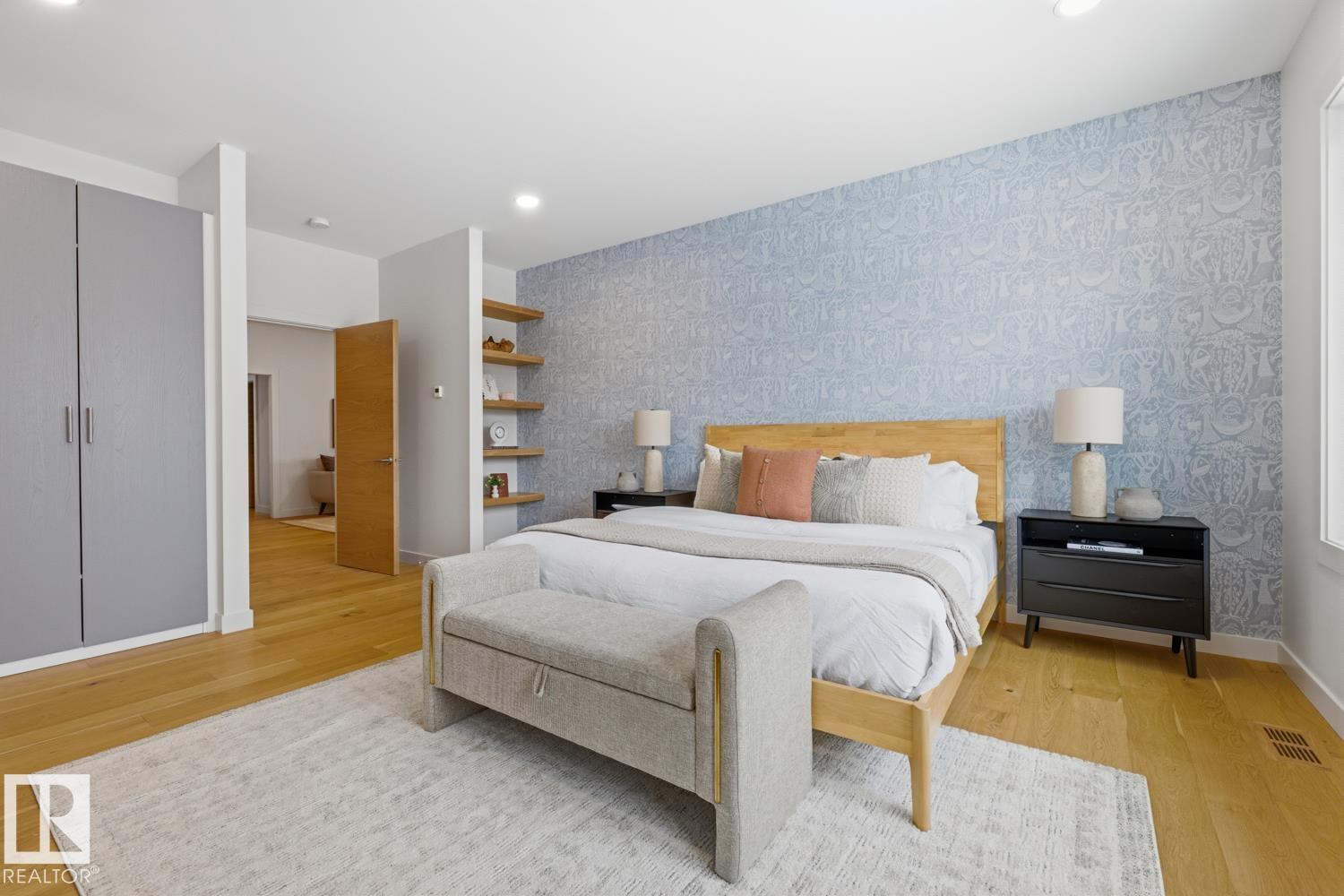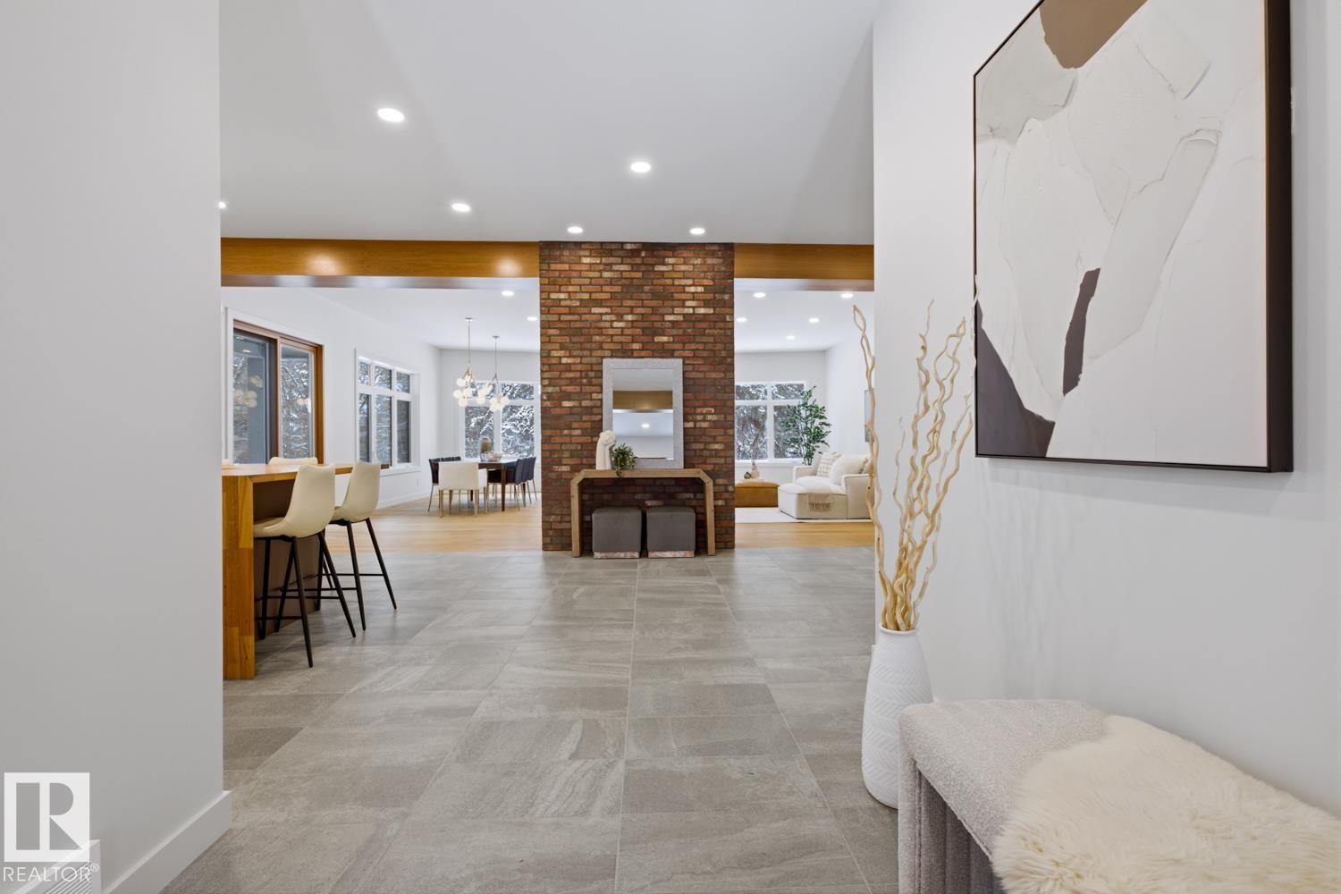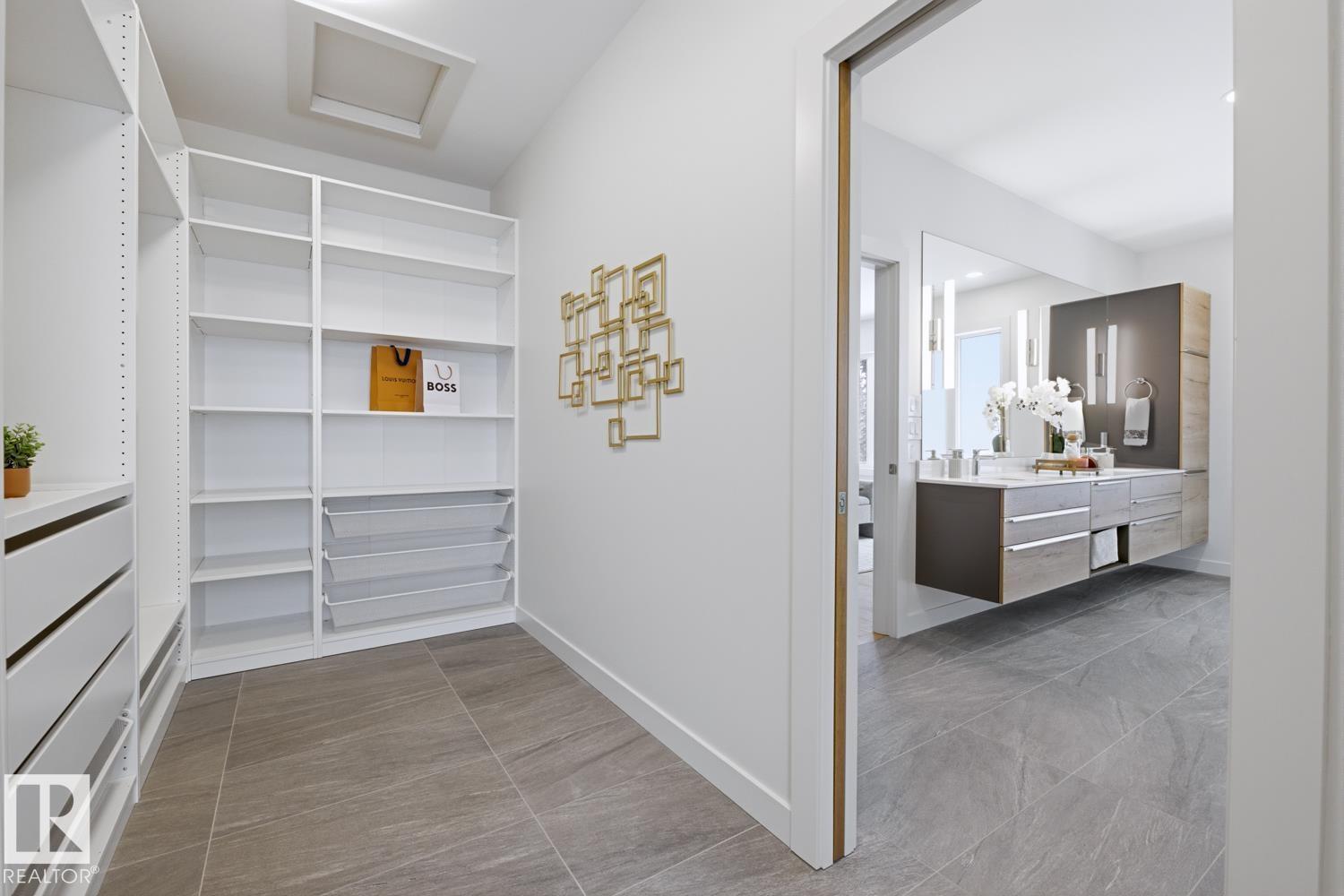 Prestigious GRANDVIEW a rare NEW with over 5,790 sqft living space, custom contemporary infill steps from UofA, minutes from the newly announced Stollery Children’s Hospital, elevating this already prime location. This 5-bed, 6-bath masterpiece features an open layout, chef’s kitchen, Dekton counters, high-end appliances, a butler’s pantry. Main floor showcases white-oak hardwood, designer fireplace, office/den, stylish bath, and a large gear/storage room. Sliders open to a covered, heated deck overlooking the treed ravine. Upper level offers a luxury primary suite, plus two bedrooms each with their own ensuite and in-floor heating, laundry room, and a bonus area with doors to a covered, heated balcony engineered for a future hot tub. Fully finished basement includes cold room, 2 large bedrooms, 2 full baths, spacious rec room, and in-floor heating. Home features 2 furnaces (4 zones), AC, central vac, humidifier, and an oversized heated garage. Situated on a landscaped, park-like lot with mature trees. (id:63190)