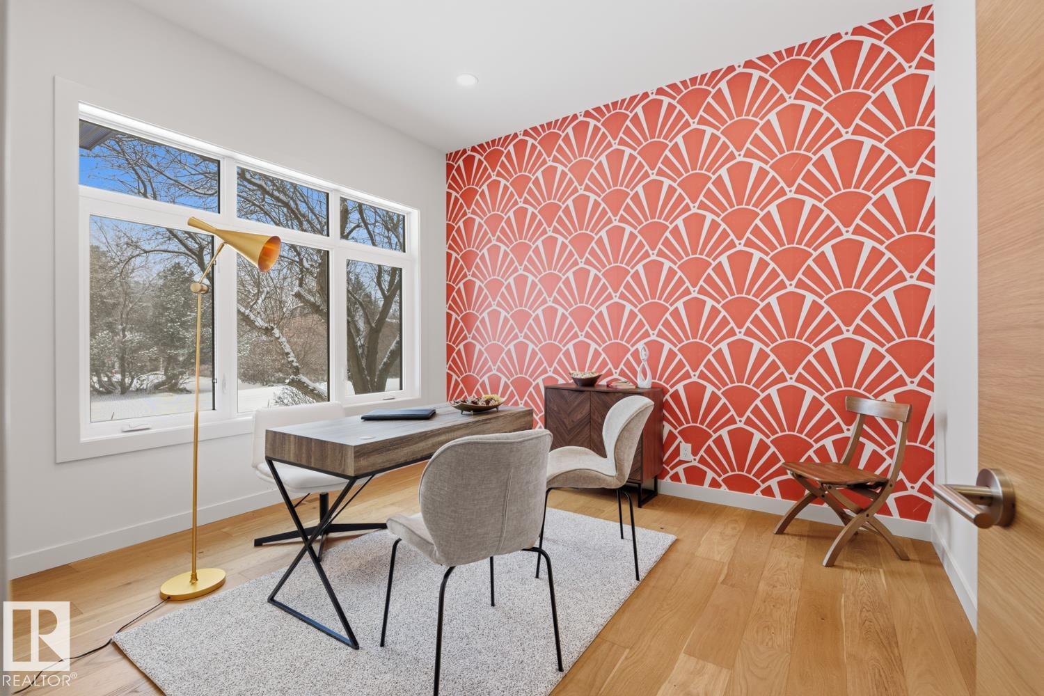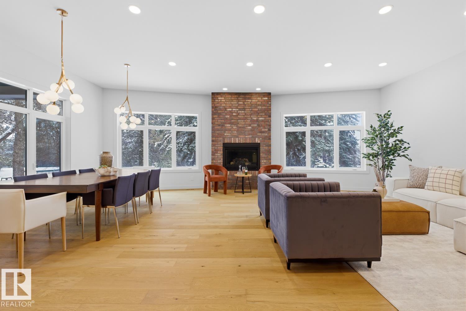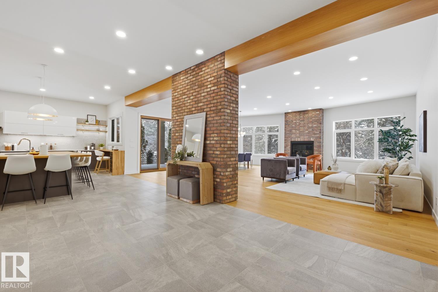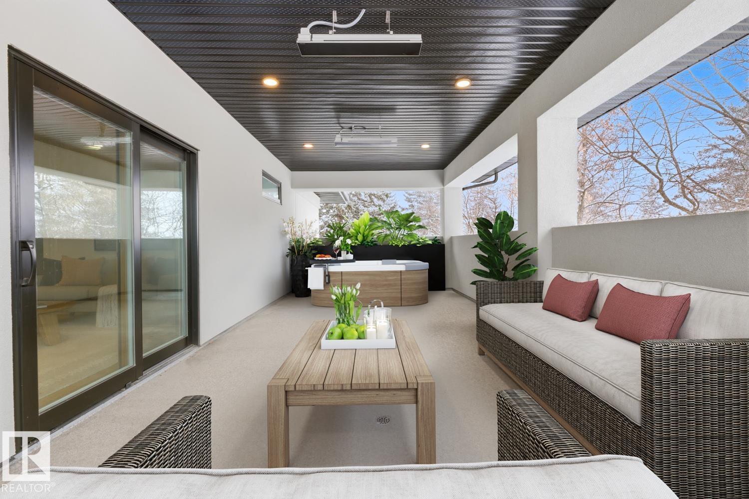 Prestigious GRANDVIEW a rare NEW with over 5,790 sqft living space, custom contemporary infill steps from UofA, minutes from the newly announced Stollery Children’s Hospital, elevating this already prime location. This 5-bed, 6-bath masterpiece features an open layout, chef’s kitchen, Dekton counters, high-end appliances, a butler’s pantry. Main floor showcases white-oak hardwood, designer fireplace, office/den, stylish bath, and a large gear/storage room. Sliders open to a covered, heated deck overlooking the treed ravine. Upper level offers a luxury primary suite, plus two bedrooms each with their own ensuite and in-floor heating, laundry room, and a bonus area with doors to a covered, heated balcony engineered for a future hot tub. Fully finished basement includes cold room, 2 large bedrooms, 2 full baths, spacious rec room, and in-floor heating. Home features 2 furnaces (4 zones), AC, central vac, humidifier, and an oversized heated garage. Situated on a landscaped, park-like lot with mature trees. (id:63190)