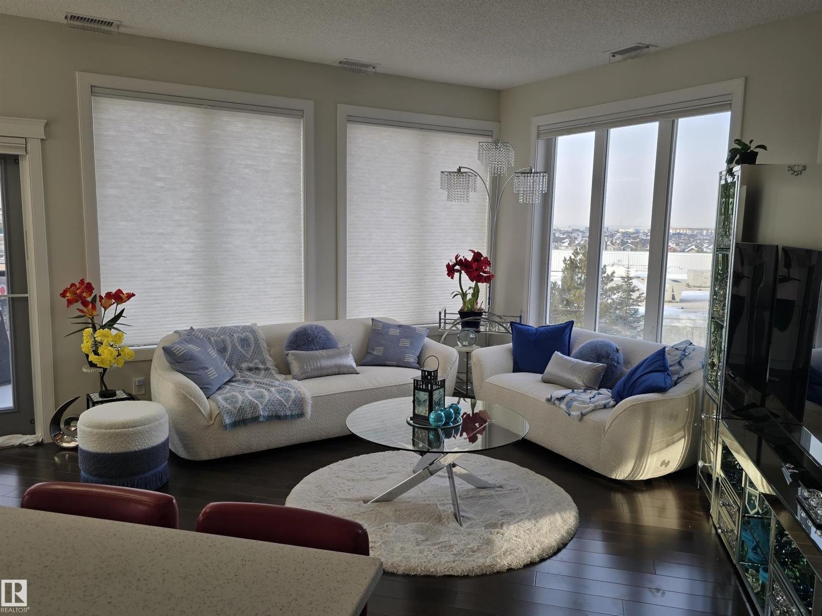 WOW! Seeking top floor-spectacular views? This is a must see! The SW views are amazing, plenty of green space for dog walking, cafe, shopping, banking, are all just a few steps away, you don't even need a car. This home is ready to move in as it is (contents can stay). This large 2 bedroom, 2 bathroom home has the most stunning views, huge bright kitchen/living room area, with it being a corner/top floor unit, tons of picturesque windows, & the balcony is HUGE, you will enjoy the beautiful sunsets with room for tons of patio furniture! Stylish kitchen, stainless appliances, quarts countertops, island/eating bar with so much storage, spectacular custom closets (& alot of them), with built-ins & pull-out drawers. 2 full bathrooms, ensuite has his/her sinks. There are too many upgrades to mention. The 2nd bedroom is massive, has ability to have a work-out area or office. Private & ready for you now! Titled parking , c/w storage area & even a wash bay in parking garage. Air conditioning & in-suite laundry! (id:63190)