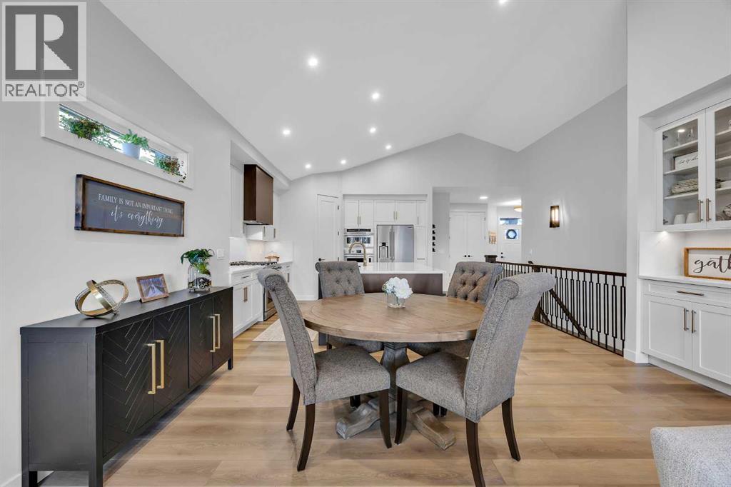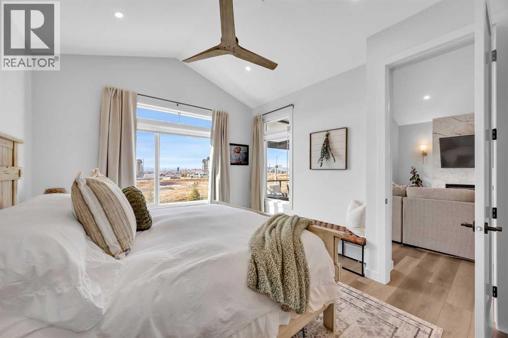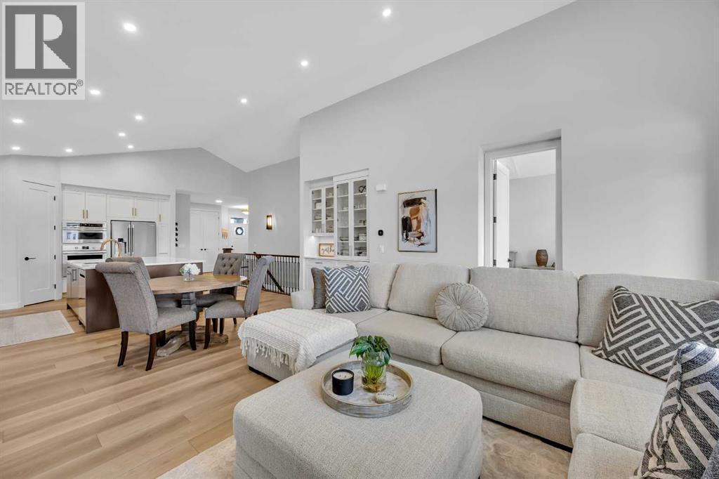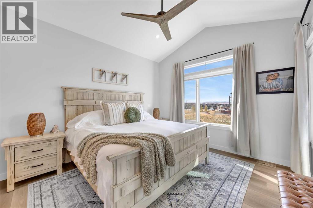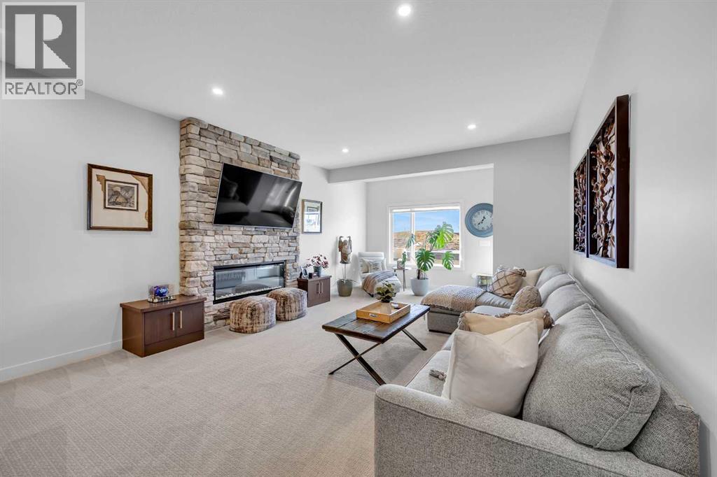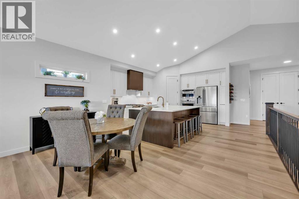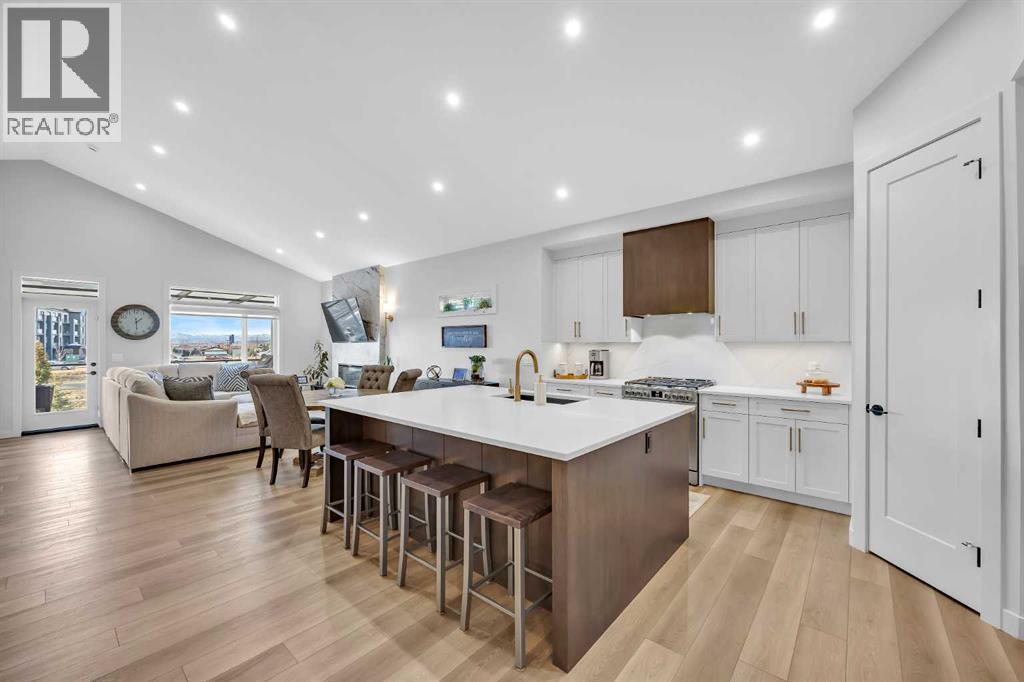 Welcome to this stunning walkout bungalow in Wedderburn, Okotoks, offering over 2,500 sq ft of developed living space, mountain views, and quick access to the highway for an easy commute to Calgary. This home features three bedrooms, two and a half bathrooms, a main floor den, a dedicated gym, and a fully finished walkout basement with a built-in dry bar. A rare opportunity to own a highly upgraded bungalow in one of Okotoks’ fastest growing communities. The main level is defined by vaulted ceilings and large windows that bring in natural light throughout the day. At the center of the home is a chef-inspired kitchen with quartz countertops, an oversized upscale island, full height cabinetry, a walk-in pantry, built-in appliances, and a custom hood fan. A built-in hutch adds both function and character, while the open layout connects seamlessly to the dining and living areas. The living room features a modern linear fireplace and opens directly onto the upper deck, creating a strong indoor-outdoor connection. The primary bedroom is privately positioned and includes a walk-in closet and a well-appointed ensuite with dual vanities, a soaker tub, and a fully tiled shower. A main floor den offers flexibility for a home office or quiet space. The mudroom and laundry area include built-in storage and quartz counters, with direct access to the double attached garage. The fully finished walkout basement expands the living space with two large bedrooms, a full bathroom, a dedicated gym, and a spacious recreation area with a second fireplace and built-in dry bar. The lower level walks out to a patio, extending your living space outdoors. Located in Wedderburn, Okotoks, this bungalow offers access to pathways, parks, and nearby amenities. A well-designed walkout bungalow with a thoughtful layout, elevated finishes, and exceptional living space throughout. (id:63190)