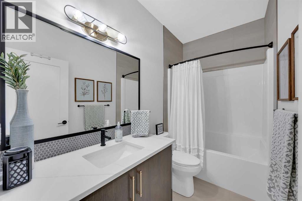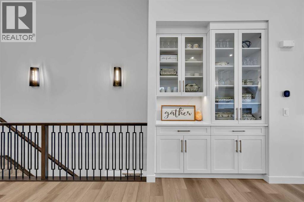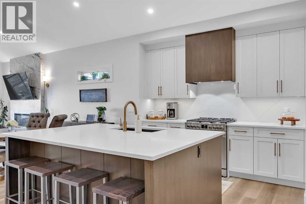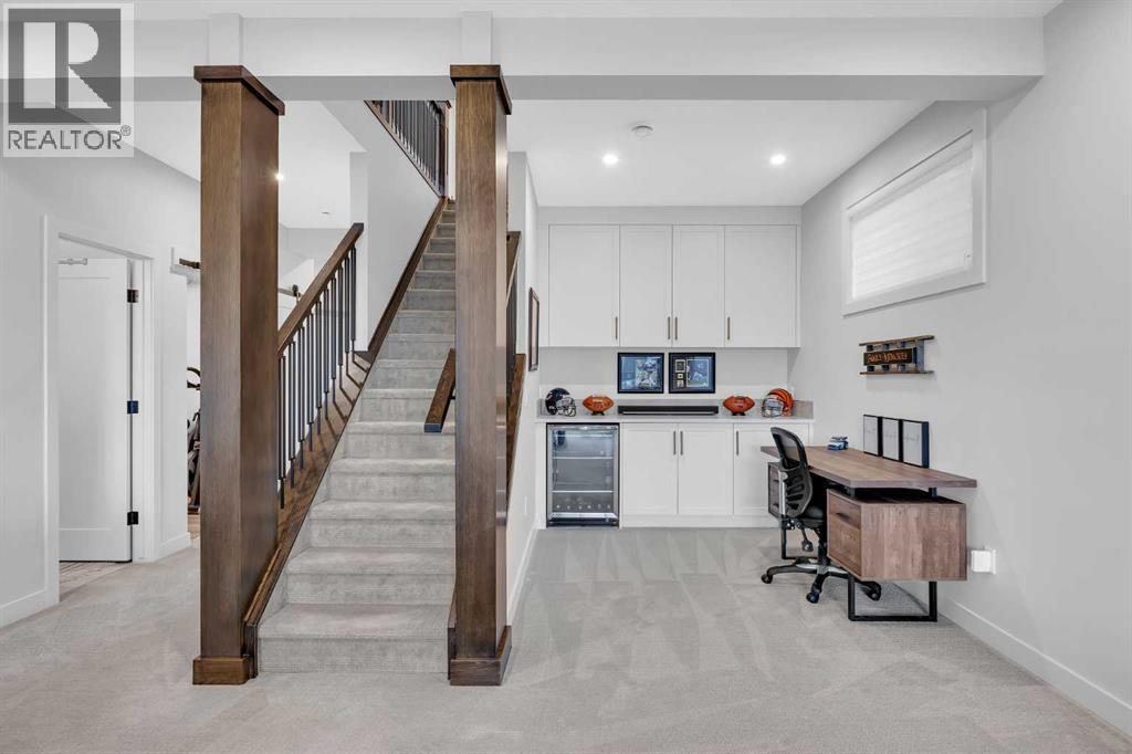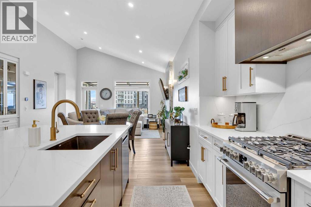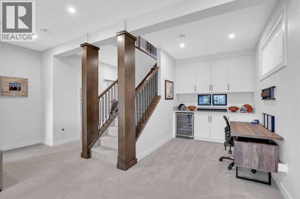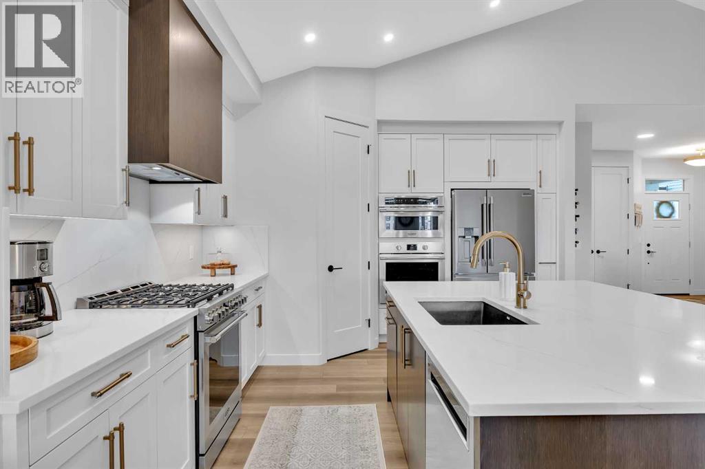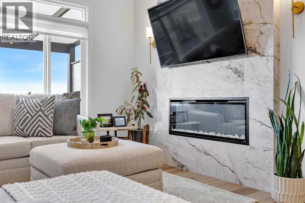 Welcome to this stunning walkout bungalow in Wedderburn, Okotoks, offering over 2,500 sq ft of developed living space, mountain views, and quick access to the highway for an easy commute to Calgary. This home features three bedrooms, two and a half bathrooms, a main floor den, a dedicated gym, and a fully finished walkout basement with a built-in dry bar. A rare opportunity to own a highly upgraded bungalow in one of Okotoks’ fastest growing communities. The main level is defined by vaulted ceilings and large windows that bring in natural light throughout the day. At the center of the home is a chef-inspired kitchen with quartz countertops, an oversized upscale island, full height cabinetry, a walk-in pantry, built-in appliances, and a custom hood fan. A built-in hutch adds both function and character, while the open layout connects seamlessly to the dining and living areas. The living room features a modern linear fireplace and opens directly onto the upper deck, creating a strong indoor-outdoor connection. The primary bedroom is privately positioned and includes a walk-in closet and a well-appointed ensuite with dual vanities, a soaker tub, and a fully tiled shower. A main floor den offers flexibility for a home office or quiet space. The mudroom and laundry area include built-in storage and quartz counters, with direct access to the double attached garage. The fully finished walkout basement expands the living space with two large bedrooms, a full bathroom, a dedicated gym, and a spacious recreation area with a second fireplace and built-in dry bar. The lower level walks out to a patio, extending your living space outdoors. Located in Wedderburn, Okotoks, this bungalow offers access to pathways, parks, and nearby amenities. A well-designed walkout bungalow with a thoughtful layout, elevated finishes, and exceptional living space throughout. (id:63190)
